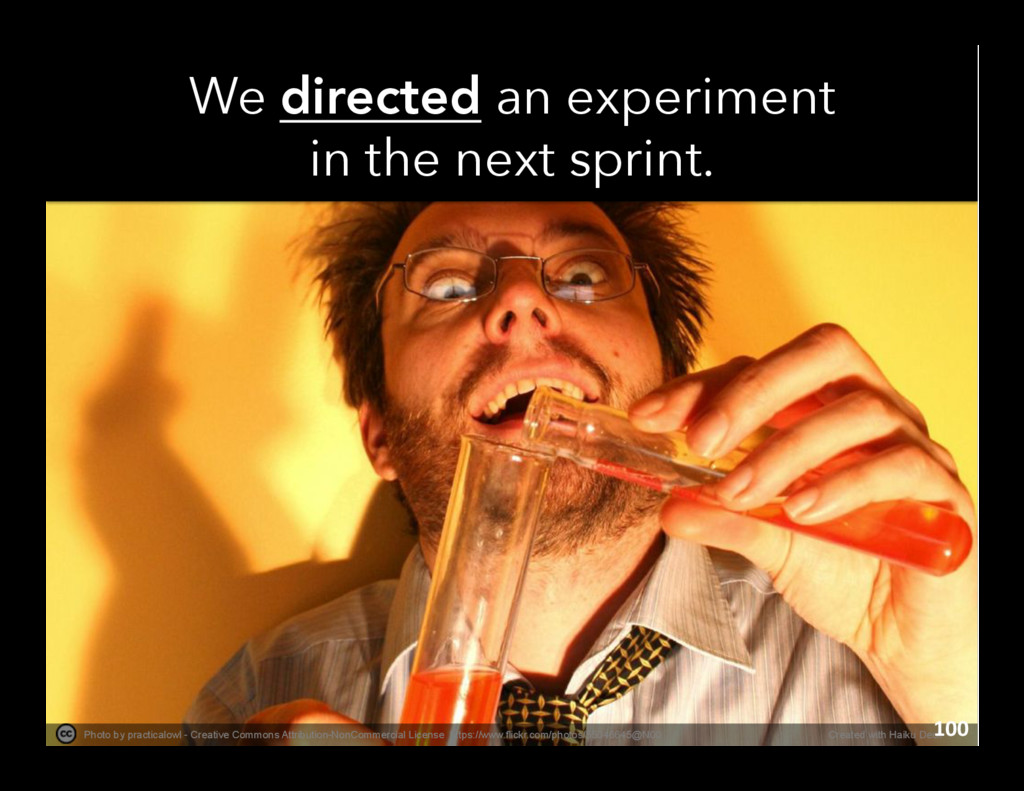 Commons Attribution-NonCommercial License https://www.flickr.com/photos/55046645@N00 Created with Haiku Deck 100 We directed an experiment in the next sprint.
