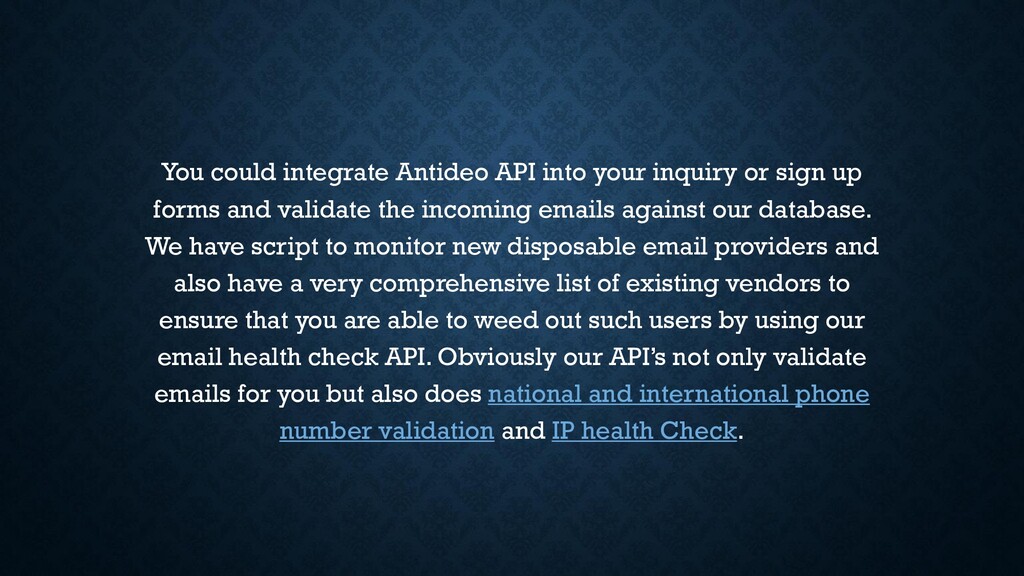 To see the features of our email validation API read https://www.antideo.com/email-validation/