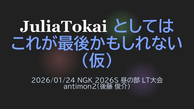 JuliaTokai としては これが最後かもしれない (仮) 2026/01/24 NGK 2026S 昼の部 LT大会 antimon2(後藤