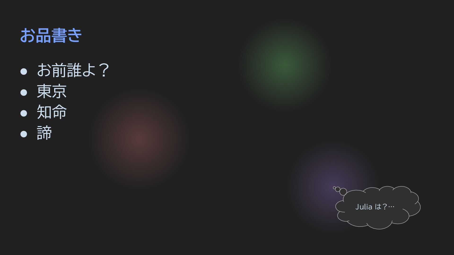 お品書き • お前誰よ? • 東京 • 知命 • 諦 Julia