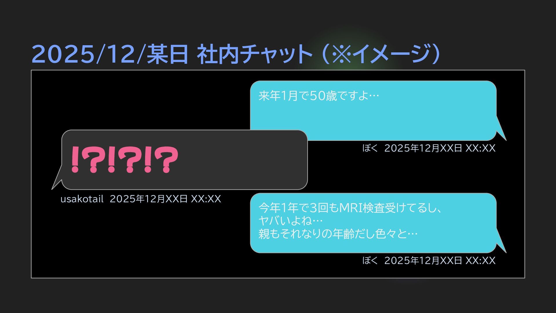 2025/12/某日 社内チャット (※イメージ) 今年1年で3回もMRI検査受けてるし、 ヤバいよね… 親もそれなりの年齢だし色々と… ぼく 2025年12月XX日 XX:XX 来年1月で50歳ですよ… ぼく 2025年12月XX日