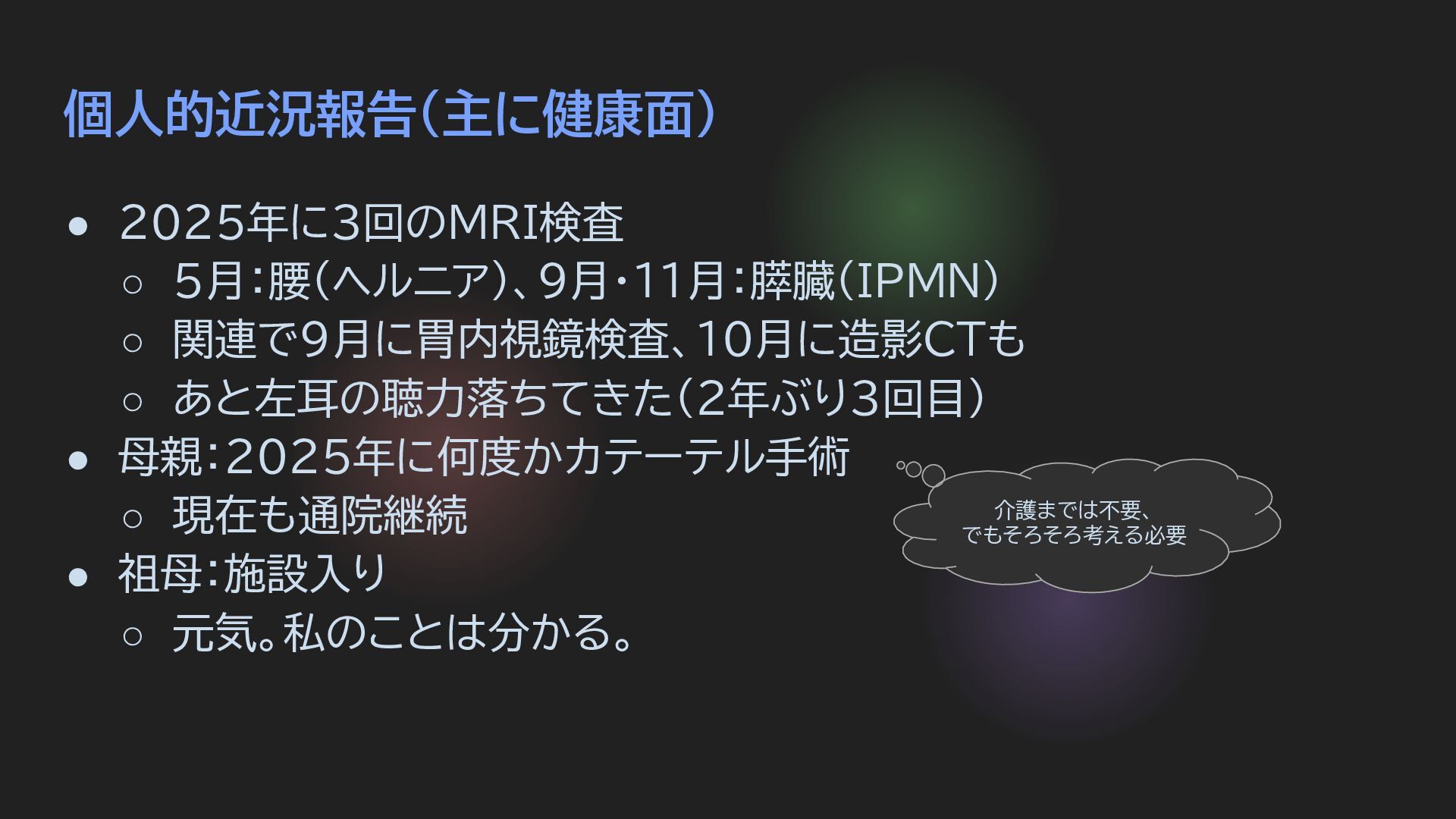 個人的近況報告(主に健康面) • 2025年に3回のMRI検査 ◦ 5月:腰(ヘルニア)、9月・11月:膵臓(IPMN) ◦ 関連で9月に胃内視鏡検査、10月に造影CTも ◦ あと左耳の聴力落ちてきた(2年ぶり3回目) •
