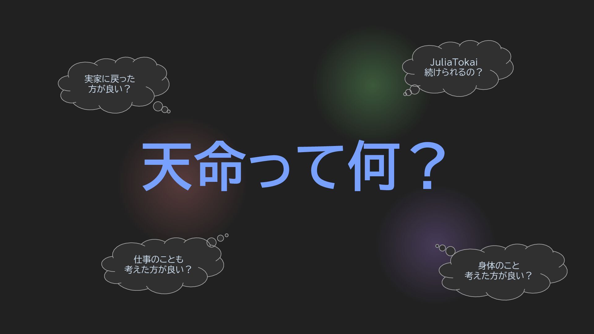 天命って何? 身体のこと 考えた方が良い? 実家に戻った 方が良い? JuliaTokai 続けられるの? 仕事のことも 考えた方が良い?