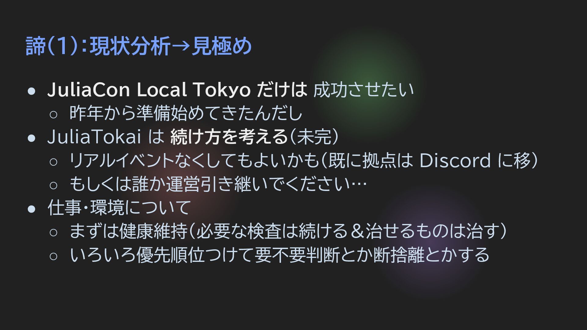 JuliaTokai は 続け方を考える(未完) ◦ リアルイベントなくしてもよいかも(既に拠点は Discord に移) ◦ もしくは誰か運営引き継いでください… • 仕事・環境について ◦ まずは健康維持(必要な検査は続ける&治せるものは治す) ◦ いろいろ優先順位つけて要不要判断とか断捨離とかする