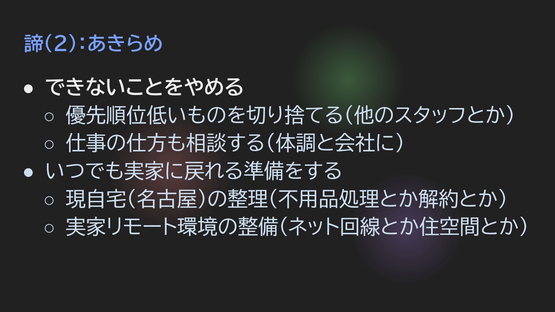 諦(2):あきらめ • できないことをやめる ◦ 優先順位低いものを切り捨てる(他のスタッフとか) ◦ 仕事の仕方も相談する(体調と会社に) • いつでも実家に戻れる準備をする ◦