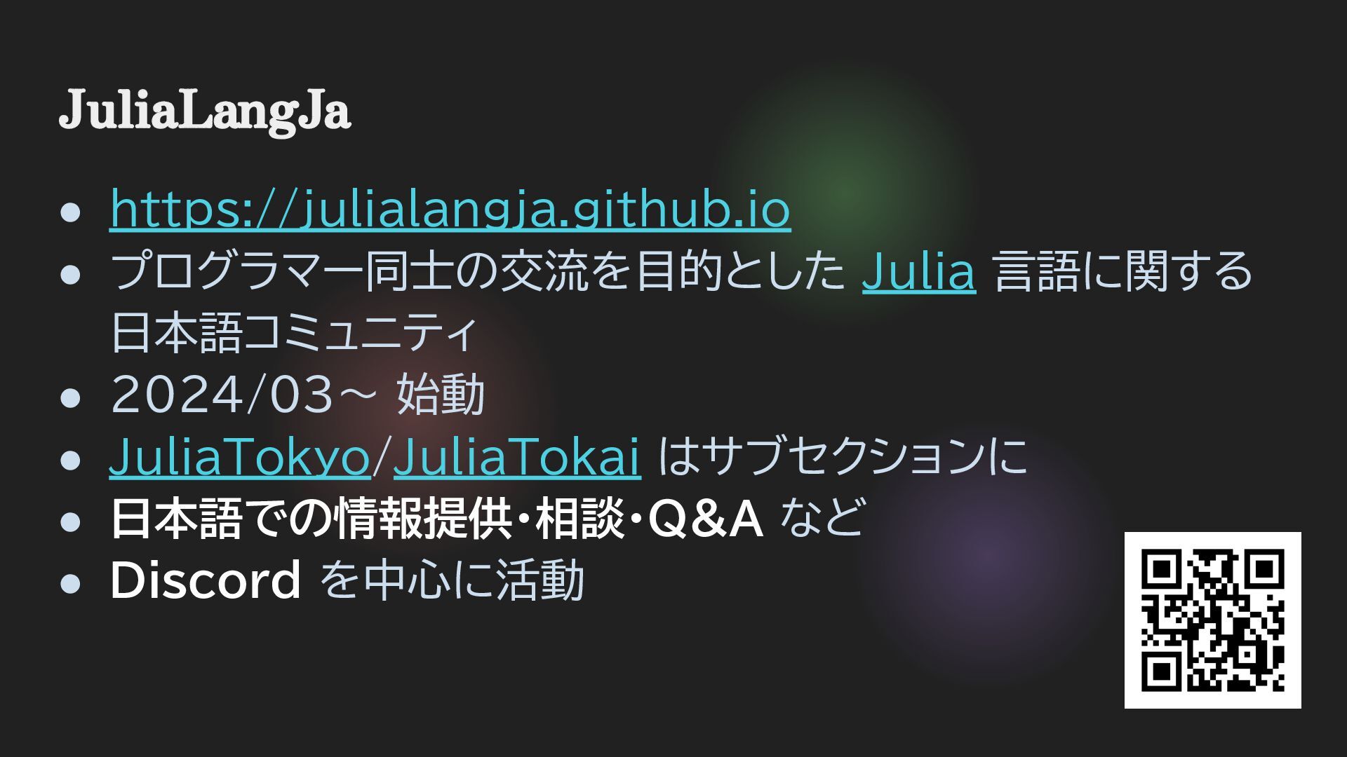 JuliaLangJa • https://julialangja.github.io • プログラマー同士の交流を目的とした Julia 言語に関する 日本語コミュニティ • 2024/03~