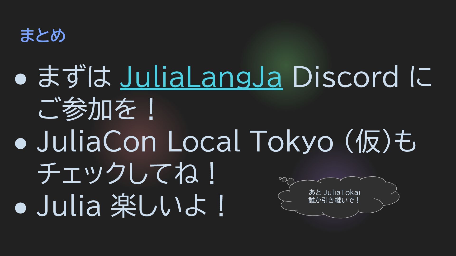 まとめ • まずは JuliaLangJa Discord に ご参加を! • JuliaCon Local