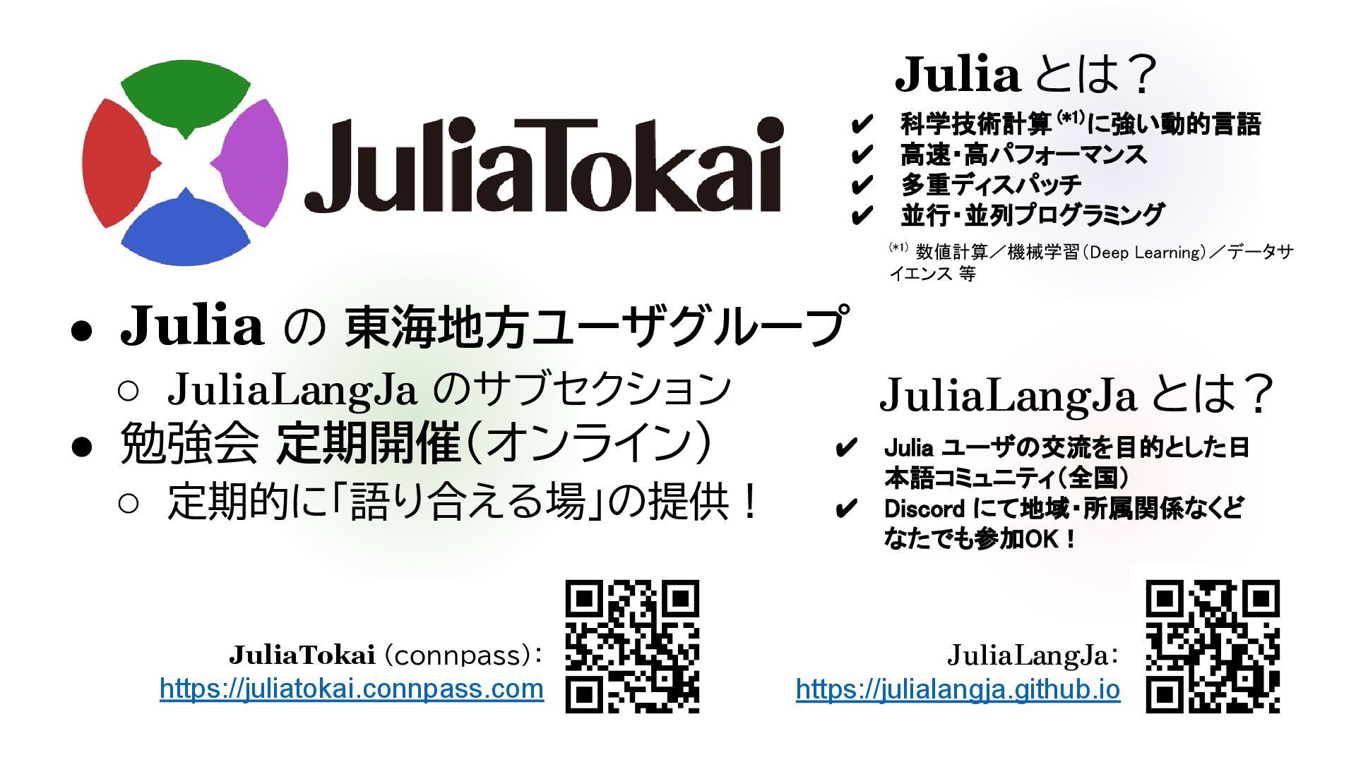 定期開催(オンライン) ◦ 定期的に「語り合える場」の提供! (*1) 数値計算/機械学習(Deep Learning)/データサ イエンス 等 JuliaTokai (connpass): https://juliatokai.connpass.com Julia とは? ✔ 科学技術計算 (*1)に強い動的言語 ✔ 高速・高パフォーマンス ✔ 多重ディスパッチ ✔ 並行・並列プログラミング JuliaLangJa: https://julialangja.github.io ✔ Julia ユーザの交流を目的とした日 本語コミュニティ(全国) ✔ Discord にて地域・所属関係なくど なたでも参加OK! JuliaLangJa とは?