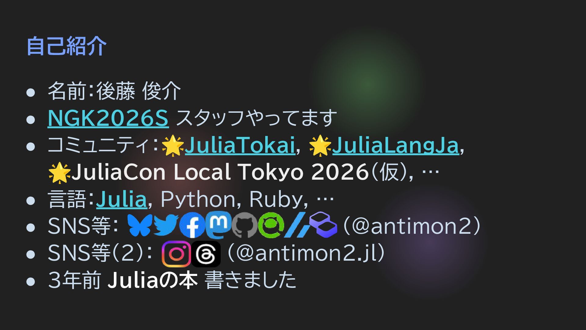 • 名前:後藤 俊介 • NGK2026S スタッフやってます • コミュニティ:🌟JuliaTokai, 🌟JuliaLangJa, 🌟JuliaCon