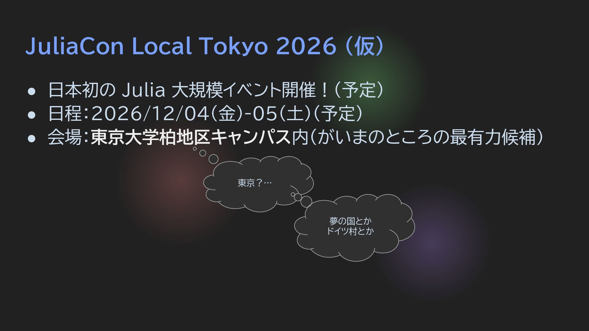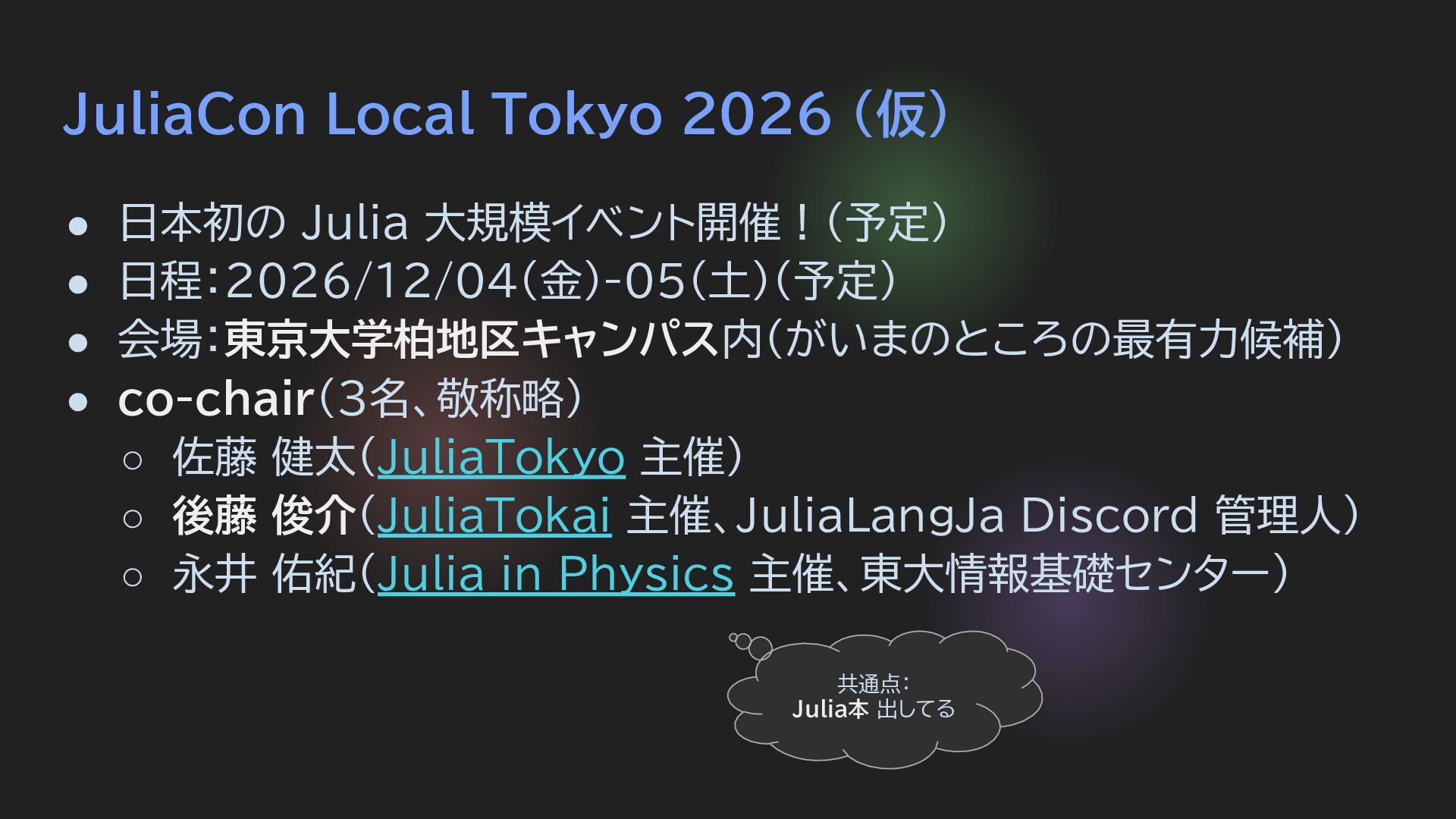 日程:2026/12/04(金)-05(土)(予定) • 会場:東京大学柏地区キャンパス内(がいまのところの最有力候補) • co-chair(3名、敬称略) ◦ 佐藤 健太(JuliaTokyo 主催) ◦ 後藤 俊介(JuliaTokai 主催、JuliaLangJa Discord 管理人) ◦ 永井 佑紀(Julia in Physics 主催、東大情報基礎センター) 共通点: Julia本 出してる