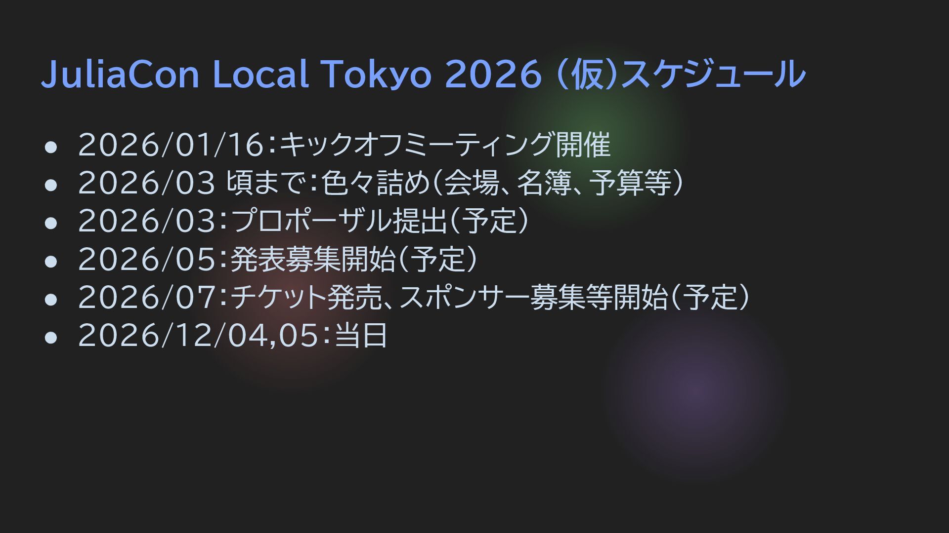 JuliaCon Local Tokyo 2026 (仮)スケジュール • 2026/01/16:キックオフミーティング開催 • 2026/03 頃まで:色々詰め(会場、名簿、予算等)
