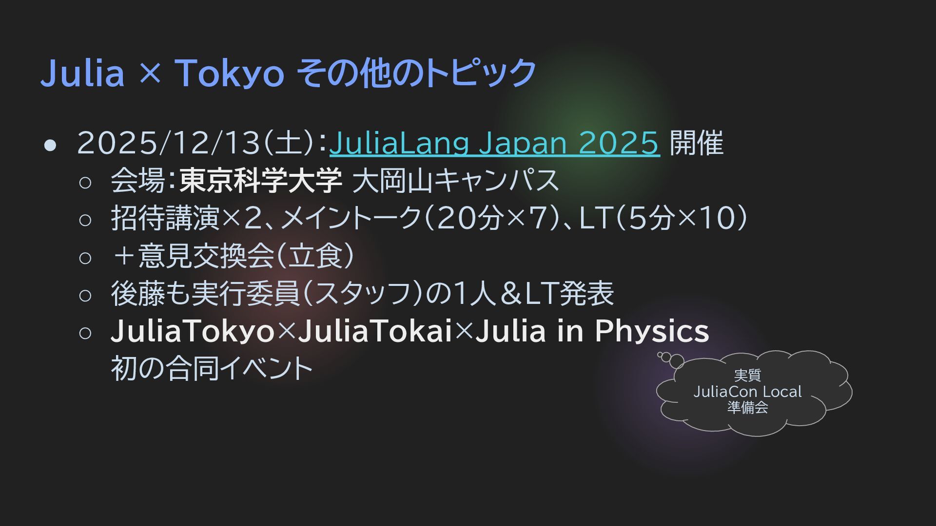 会場:東京科学大学 大岡山キャンパス ◦ 招待講演×2、メイントーク(20分×7)、LT(5分×10) ◦ +意見交換会(立食) ◦ 後藤も実行委員(スタッフ)の1人&LT発表 ◦ JuliaTokyo×JuliaTokai×Julia in Physics 初の合同イベント 実質 JuliaCon Local 準備会