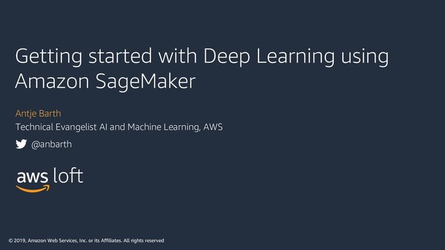 rights reserved Built-in algorithms orange: supervised, blue: unsupervised Linear Learner: regression, classification Image Classification: Deep Learning (ResNet) Factorization Machines: regression, classification, recommendation Object Detection (SSD): Deep Learning (VGG or ResNet) K-Nearest Neighbors: non-parametric regression and classification Neural Topic Model: topic modeling XGBoost: regression, classification, ranking https://github.com/dmlc/xgboost Latent Dirichlet Allocation: topic modeling (mostly) K-Means: clustering Blazing Text: GPU-based Word2Vec, and text classification Principal Component Analysis: dimensionality reduction Sequence to Sequence: machine translation, speech to text and more Random Cut Forest: anomaly detection DeepAR: time-series forecasting (RNN) Object2Vec: general-purpose embedding IP Insights: usage patterns for IP addresses Semantic Segmentation: Deep Learning