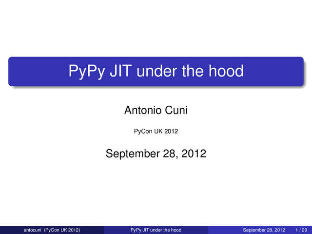 A LOAD_GLOBAL B BINARY_ADD STORE_FAST C ... p0 = getfield_gc(p0, 'func_globals') p2 = getfield_gc(p1, 'strval') call(dict_lookup, p0, p2) ... ... p0 = getfield_gc(p0, 'func_globals') p2 = getfield_gc(p1, 'strval') call(dict_lookup, p0, p2) ... ... guard_class(p0, W_IntObject) i0 = getfield_gc(p0, 'intval') guard_class(p1, W_IntObject) i1 = getfield_gc(p1, 'intval') i2 = int_add(00, i1) guard_not_overflow() p2 = new_with_vtable('W_IntObject') setfield_gc(p2, i2, 'intval') ... ... p0 = getfield_gc(p0, 'locals_w') setarrayitem_gc(p0, i0, p1) .... antocuni (PyCon UK 2012) PyPy JIT under the hood September 28, 2012 17 / 29