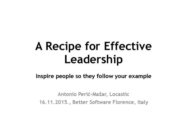 Companies are growing from day to day, rules are changing as your teams grows and being leader is not easy thing. To be a great leader you need to have great ingredients and show your team that you can mix all of them in one great recipe. In this talk I want to show you what are great ingredients that you need and how to combine them from my personal experience.