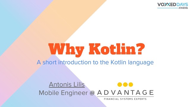 In this presentation Antonis will try to guide you through the main features of Kotlin that make it so special and provide a short introduction to the language.