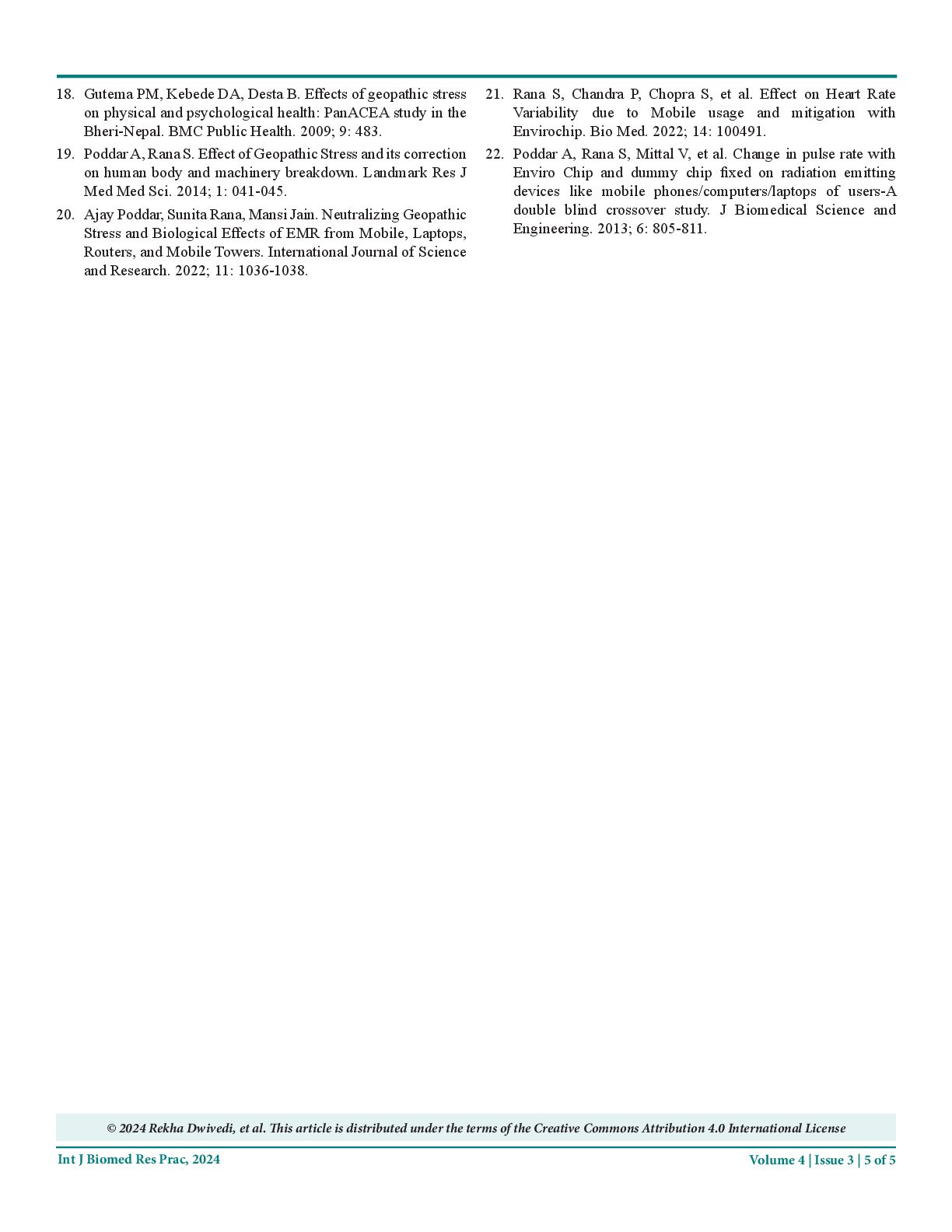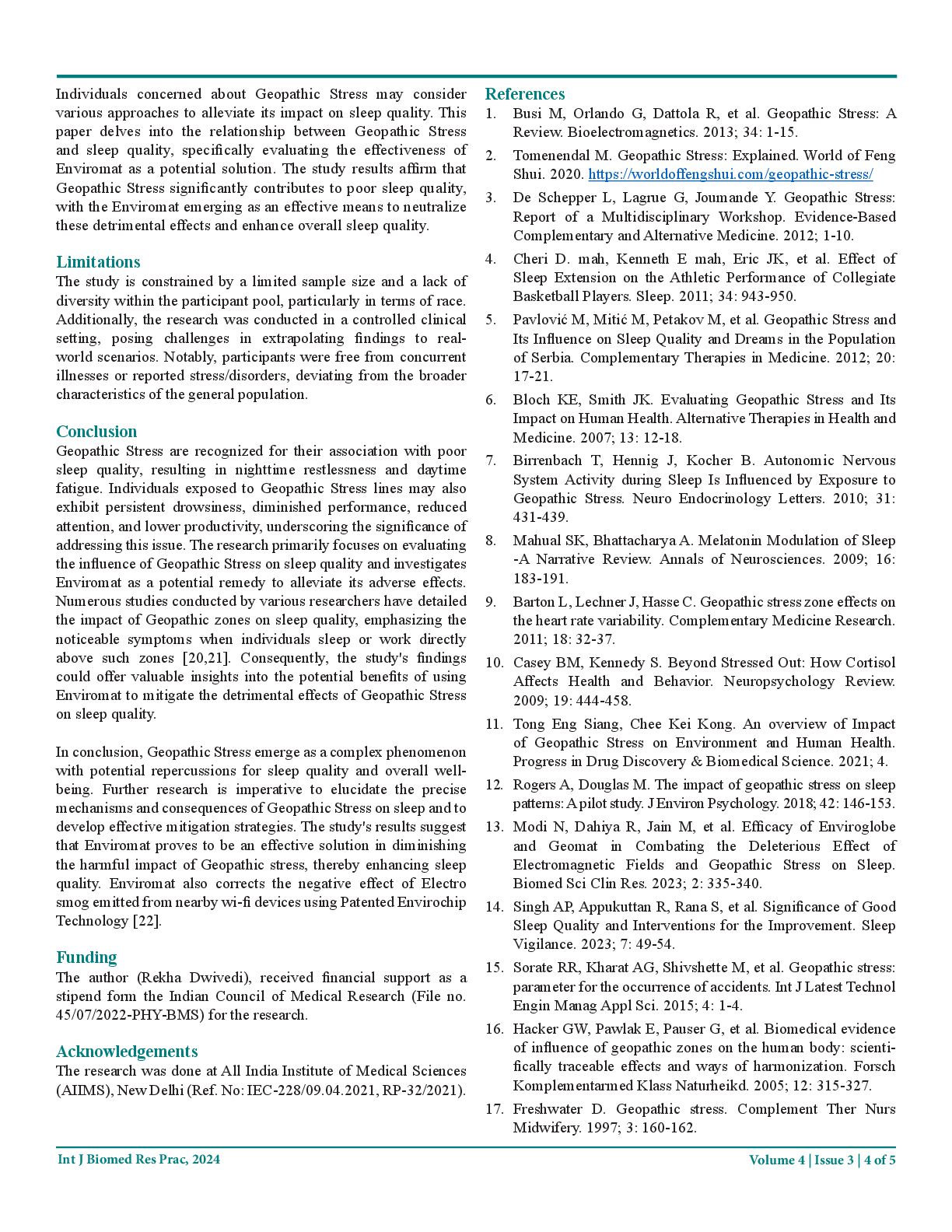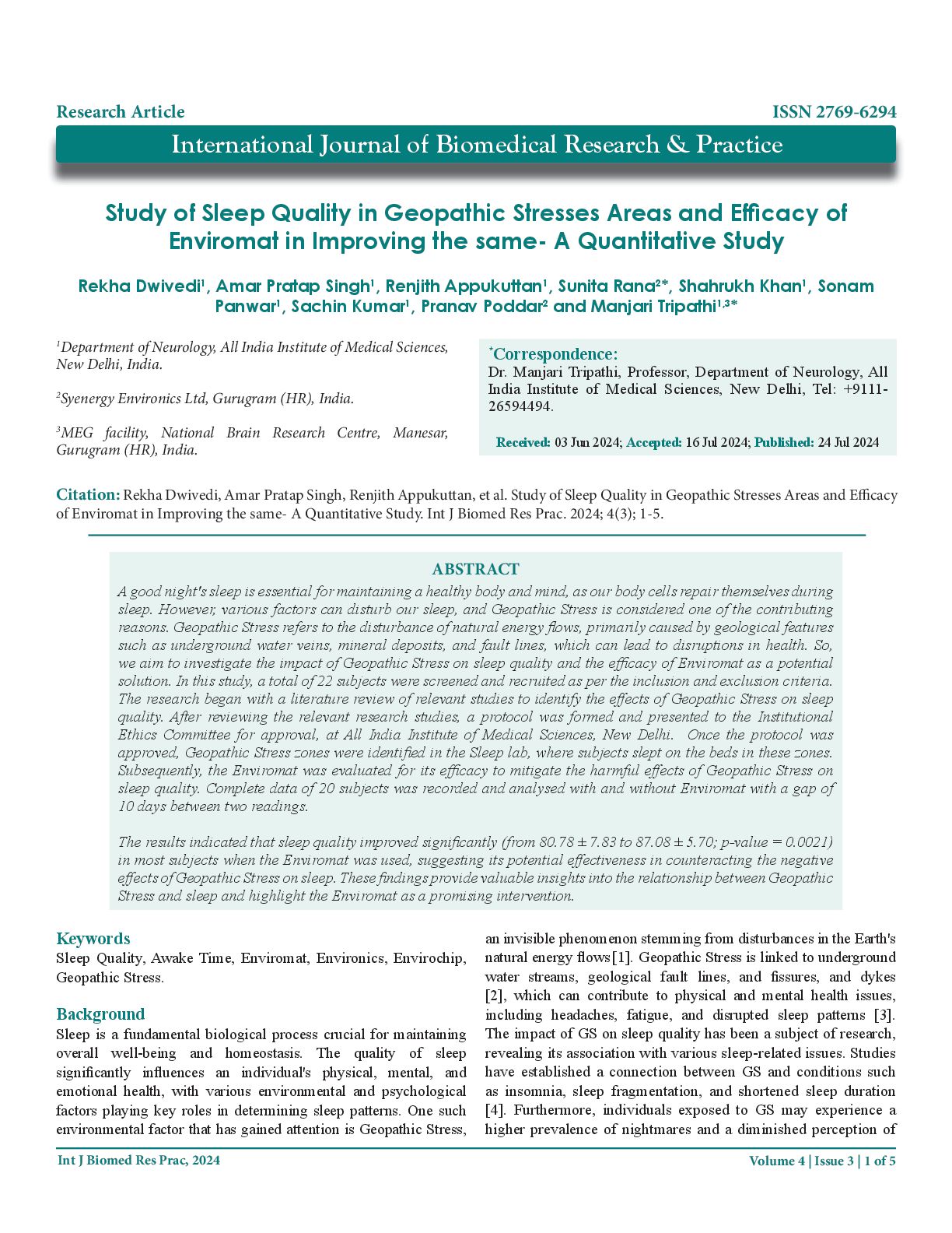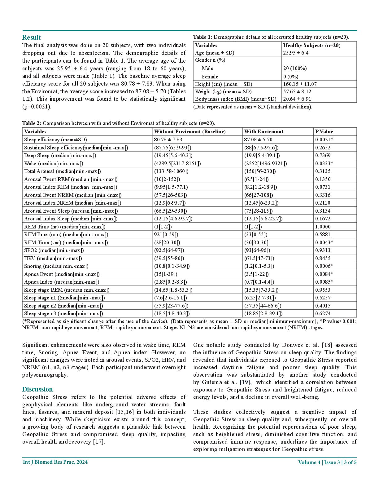 J Biomed Res Prac, 2024 overall sleep quality [5]. Additional investigations suggest that GS is linked to an elevated risk of sleep apnea, characterized by abnormal breathing pauses during sleep [6]. The physiological alterations induced by GS contribute to its impact on sleep. An increase in sympathetic nervous system activity, associated with heightened anxiety and stress, has been linked to GS exposure [7]. Moreover, GS disrupts the production of Melatonin, the hormone responsible for regulating the sleep- wake cycle [8,9]. Additionally, GS has been correlated with heightened cortisol levels, a hormone associated with stress [10]. Understanding the complex interplay between GS and sleep quality is crucial for addressing the potential health implications of this environmental factor. Research by Tong et al. found that individuals spending time on Geopathic lines exhibited symptoms such as irritability, chronic diseases, poor sleep, low working performance, and low energy [11]. Changes in sleep architecture, including altered proportions of sleep stages, have also been linked to Geopathic stress. Rogers and Douglas reported that exposure to Geopathic Stress during sleep led to reduced deep sleep and increased REM sleep [12]. However, mitigation measures targeting Geopathic Stress have shown promising results in improving sleep quality. A study by Modi et al. [13] specifically highlighted the effectiveness of Enviromat in mitigating the harmful effects of Geopathic Stress on sleep quality. The aim of the current research is to assess the impact of Geopathic Stress and reaffirm the findings of previous studies, focusing on the potential benefits of Enviromat (invented by Syenergy Environics Ltd.) in sleep quality improvement. Materials and Methods The interventional study involved 22 healthy subjects aged between 18 and 60 years and was conducted at the All-India Institute of Medical Sciences in New Delhi, India. Approval was obtained from the institutional ethics committee (letter no IEC-228/09.04.2021, RP-32/2021), and the study was registered with the clinical trial registry of India (CTRI/2021/06/034482, Registered on: 30/06/2021). Informed consent was obtained from all participants, ensuring the confidentiality of their personal information. Participants received counselling to understand the study rationale and the terminologies used in the stress-related questionnaire. Before commencing the study, a survey was conducted to identify the beds affected by Geopathic Stress in the Sleep lab. Readings were taken on the subjects sleeping on these beds to establish baseline data without any intervention. Once the baseline data was established, the Geopathic lines/zones were corrected by placing the Enviromat on these beds to neutralize the harmful effects of Geopathic Stress. Following the correction of the Geopathic line, additional readings were taken to establish post-intervention data. Inclusion Criteria • Healthy individuals aged 18-60 years willing to participate, physically fit, and without comorbidities. • Participants without any chronic brain or sleep related diseases, and not taking any neuropsychotic drugs. Exclusion Criteria • Individuals with sleep disorders or chronic physical or mental illnesses affecting sleep. • Those with chronic respiratory issues (nasal congestion, chest infections, asthma, adenoids, allergic rhinitis, etc.), and individuals with devices like pacemakers, implants with electrical interfaces/batteries, cochlear implants, and pregnant women. • Individuals on regular medication for metabolic, neurological issues, or any other severe conditions. Data Collection Sleep data were recorded utilizing the SOMNOmedics in Lab Polysomnography, powered by the patented Domino Sleep Diagnostic software, which enables continuous and undisturbed blood pressure monitoring during sleep. This versatile device offers both stationary and mobile applications, featuring interfaces for external system integration. The equipment conducts continuous impedance checks, detects Cheyne-Stokes patterns, analyzes arousals through path analysis, provides reports on Multiple Sleep Latency Tests (MSLT) and split nights, and performs snore topographic analysis for snoring localization. Recorded data encompassed sleep efficiency, sleep stages, REM time, NREM, Heart Rate Variability, arousal events, total sleep time, SPO 2 levels, snoring, and electroencephalogram for apnea. Adhering to the methods outlined by A.P Singh et al. [14], participants' data was recorded over two nights (22:00–06:00 h) in the sleep laboratory. Polysomnography, establishing the baseline, preceded a second recording session on the same subjects, under similar controlled conditions with Enviromat which was designed to correct the negative effect of Geoptahic Stress, following a 10-days gap. Each session commenced with a readiness session, facilitating participants' acclimatization to laboratory conditions and ruling out sleep or neurological disorders. Monitoring for potential confounding factors affecting results included assessing coffee/tea intake, last night's sleep quality, and any work/home-related stress. Statistical Analysis The Shapiro-wilk test was used to check the normality of the data set. The Paired t-test/ Wilcoxon signed rank test was used to check the statistical significance of the paired data set. All the analysis was done on RStudio. In the entire study, p-values less than 0.05 are considered to be statistically significant.