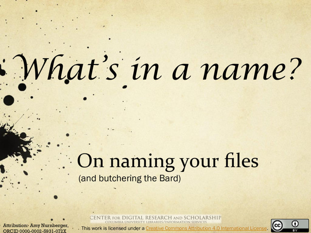 International License. “The file’s name is a tower of strength” Avoid \ / : * ? “ < > | [ ] & $ , . (reserve . for file extensions) Avoid spaces, use _ (- is questionable because humans confuse −, -, ﹣, -, but to a computer script trying to parse file names these are very different) Be brief, but identify & document the important information elements, independent of file structure, e.g., files Letterheads/Yardley/Ann/0042.jp2 and Letterheads/ Biggert/York/0042.jp2 are indistinguishable outside the folders File structures should include project names, and have their own naming system Include dates; format consistently, e.g., YYYYMMDD Consider the order of elements Use versioning, e.g., xxxx_v07.txt Make a system. Share the system. Follow the system.