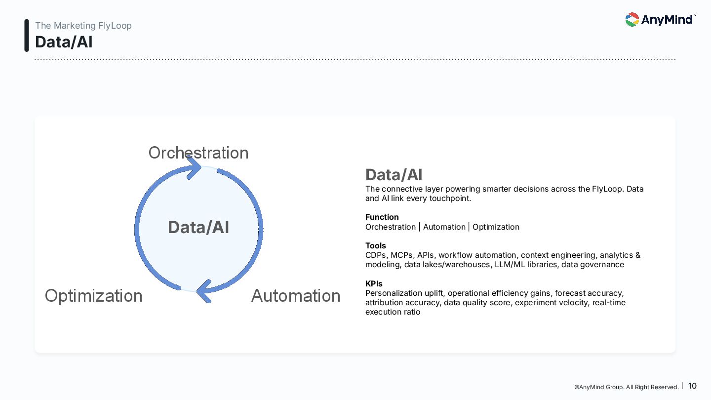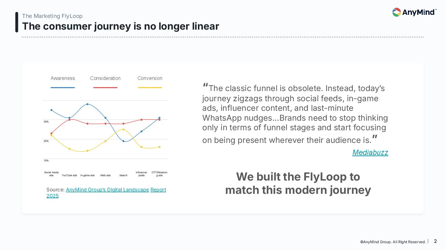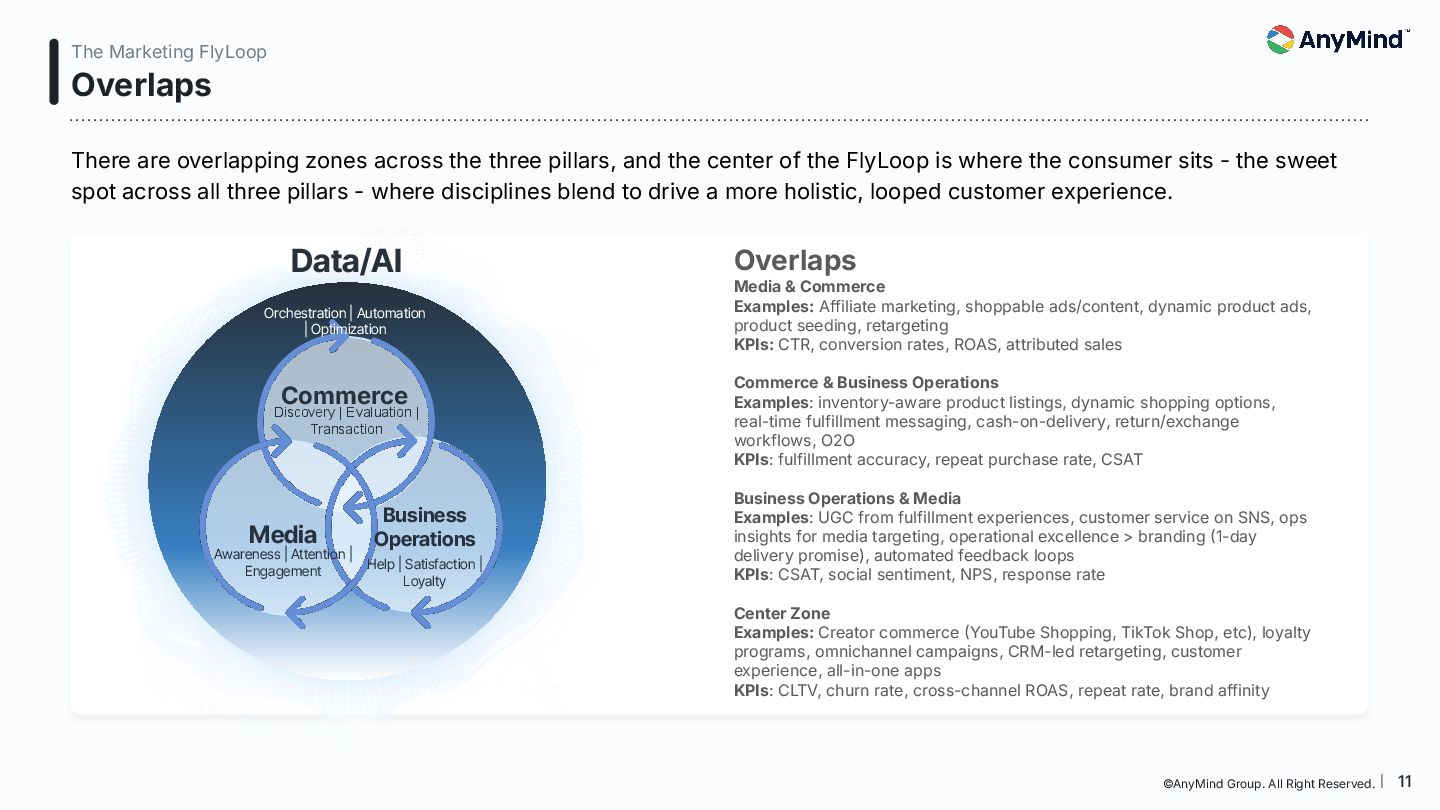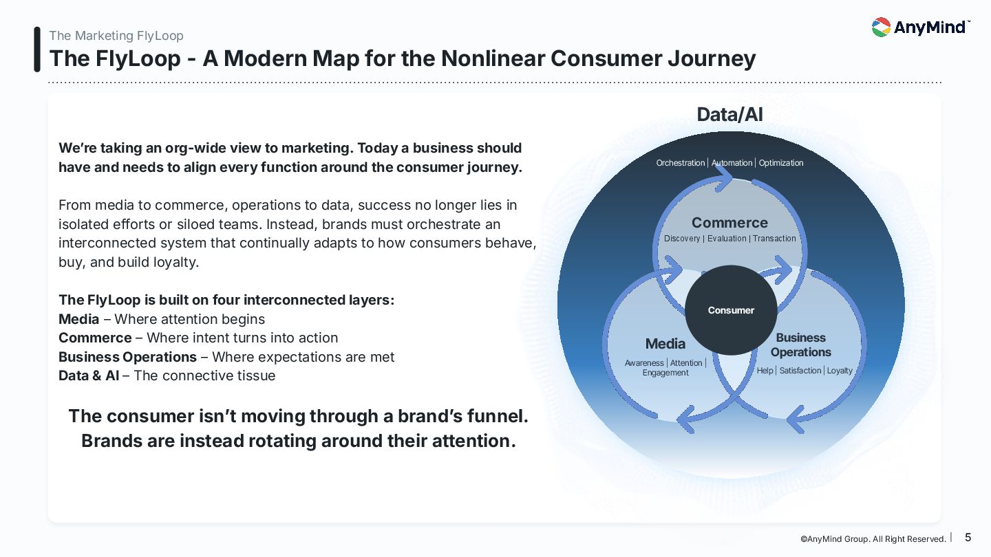 The Marketing FlyLoop is a modern framework that replaces the outdated linear marketing funnel with a non-linear, AI-powered, loop-based customer journey model. This deck breaks down how consumers move across Media, Commerce, Business Operations, and Data/AI, and provides a practical blueprint for orchestrating always-on, interconnected growth.