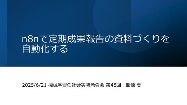 n8nで定期成果報告の資料づくりを 自動化する 2025/6/21 機械学習の社会実装勉強会 第48回 熊懐 葵