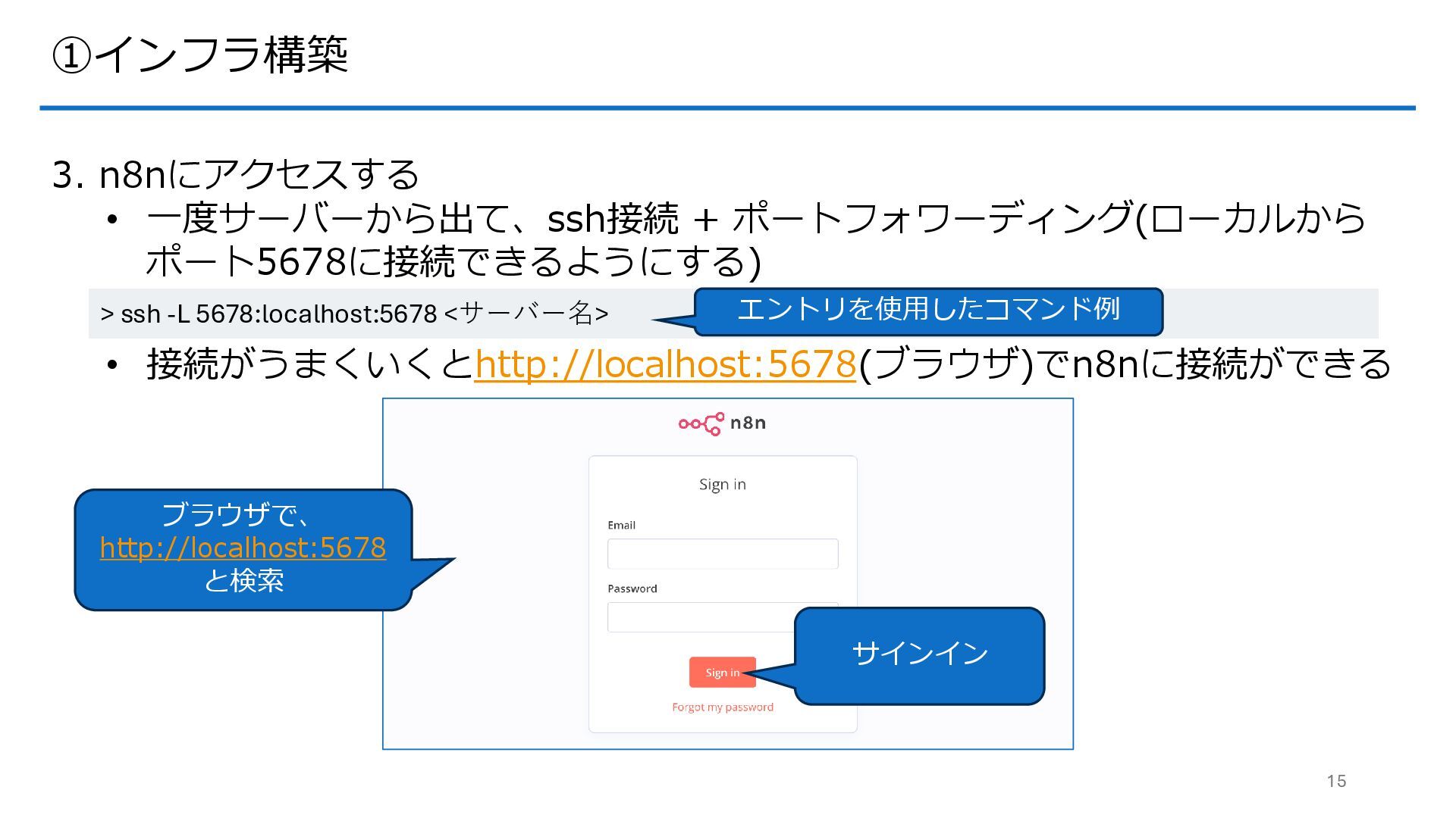 ①インフラ構築 15 3. n8nにアクセスする • 一度サーバーから出て、ssh接続 + ポートフォワーディング(ローカルから ポート5678に接続できるようにする) >
