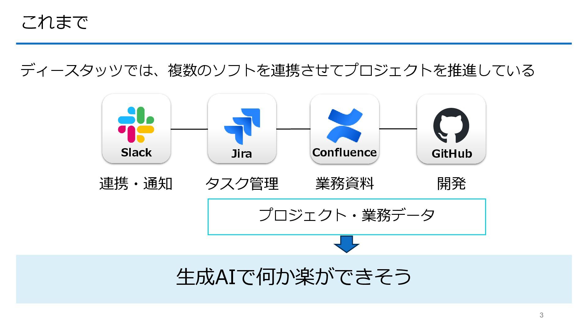 プロジェクト・業務データ これまで ディースタッツでは、複数のソフトを連携させてプロジェクトを推進している Slack Jira Confluence GitHub 連携・通知 タスク管理 業務資料
