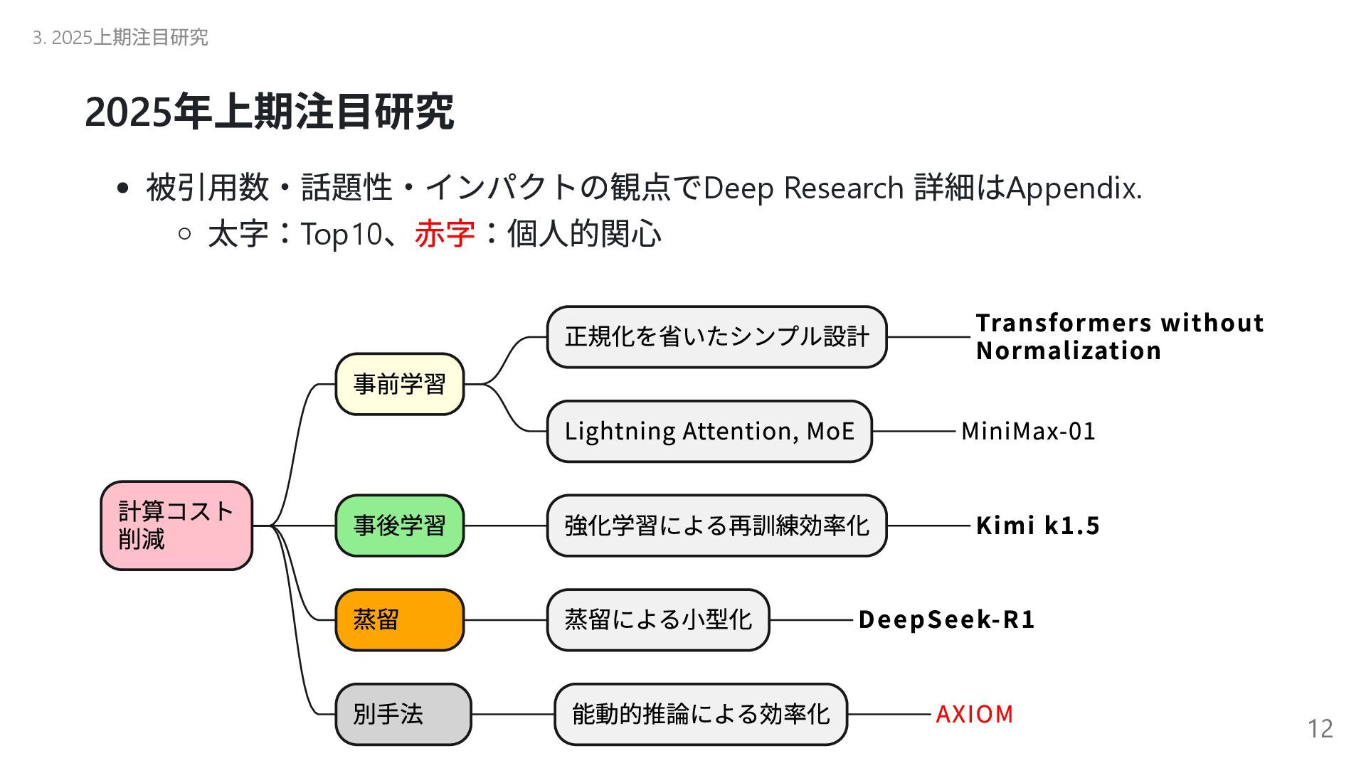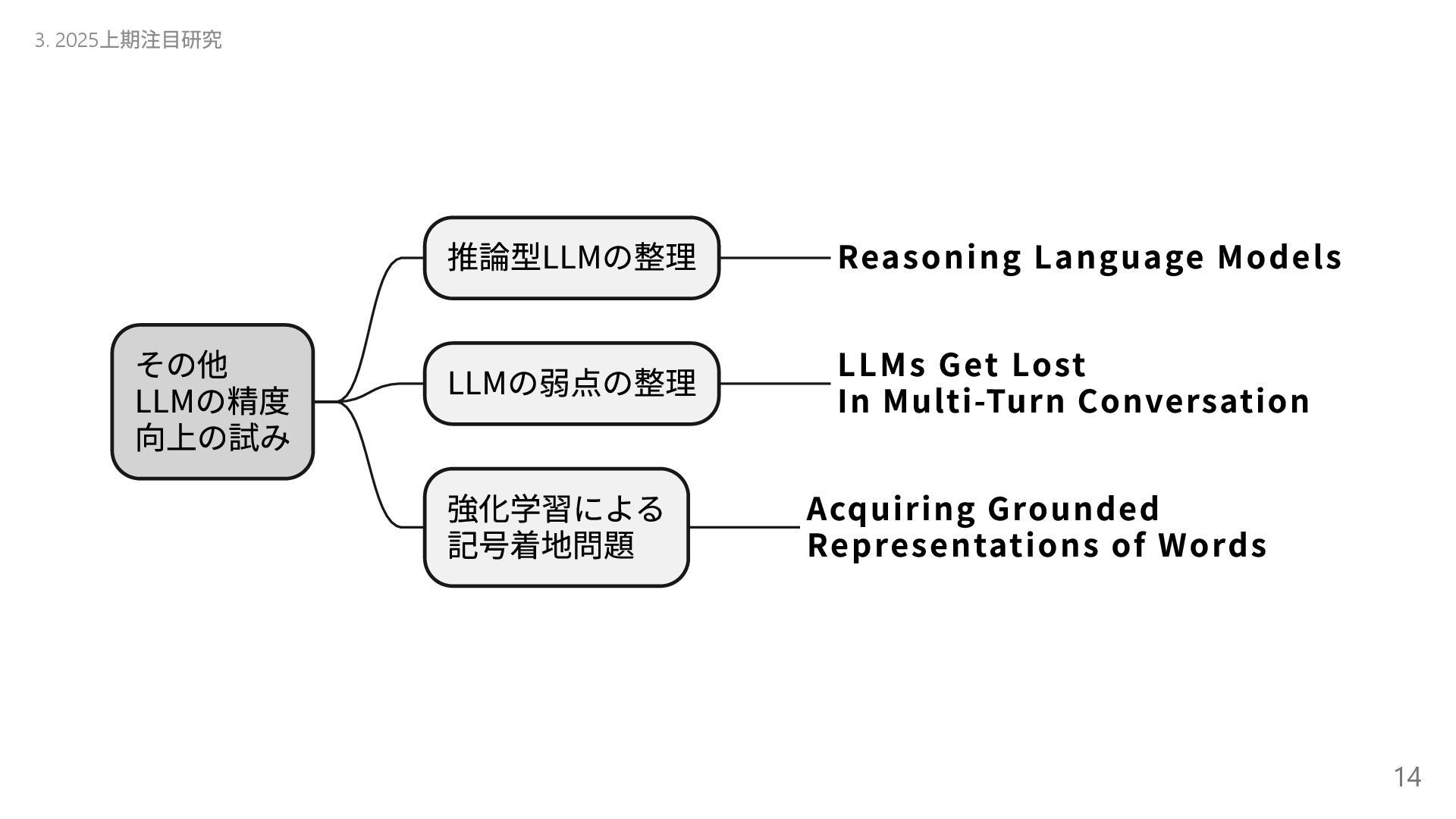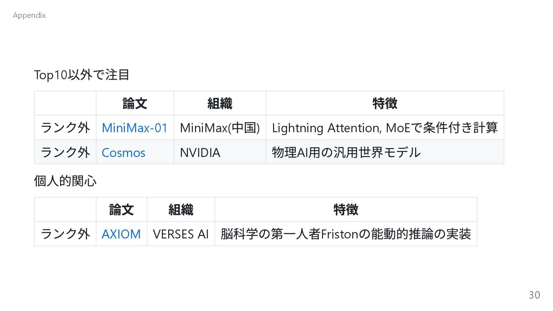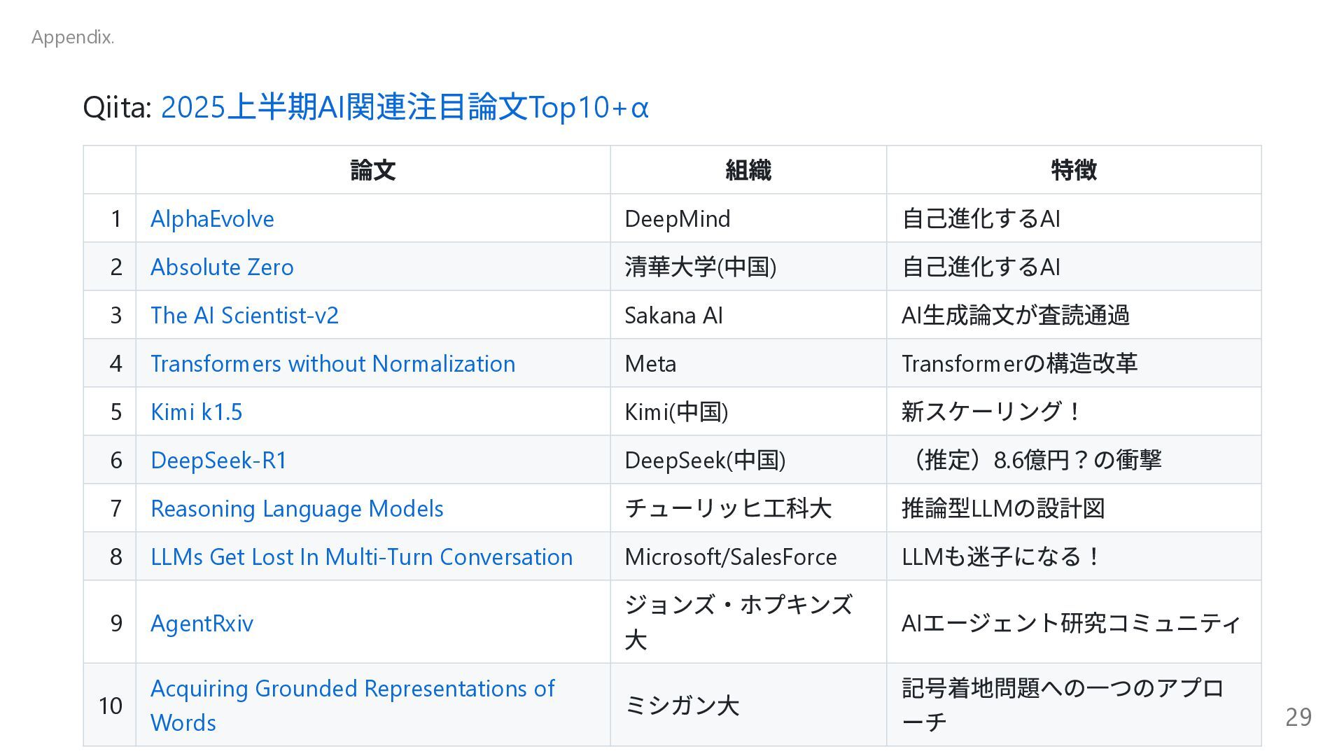 自己進化するAI 2 Absolute Zero 清華大学( 中国) 自己進化するAI 3 The AI Scientist-v2 Sakana AI AI 生成論文が査読通過 4 Transformers without Normalization Meta Transformer の構造改革 5 Kimi k1.5 Kimi( 中国) 新スケーリング! 6 DeepSeek-R1 DeepSeek( 中国) (推定)8.6 億円?の衝撃 7 Reasoning Language Models チューリッヒ工科大 推論型LLM の設計図 8 LLMs Get Lost In Multi-Turn Conversation Microsoft/SalesForce LLM も迷子になる! 9 AgentRxiv ジョンズ・ホプキンズ 大 AI エージェント研究コミュニティ 10 Acquiring Grounded Representations of Words ミシガン大 記号着地問題への一つのアプロ ーチ Appendix. 29