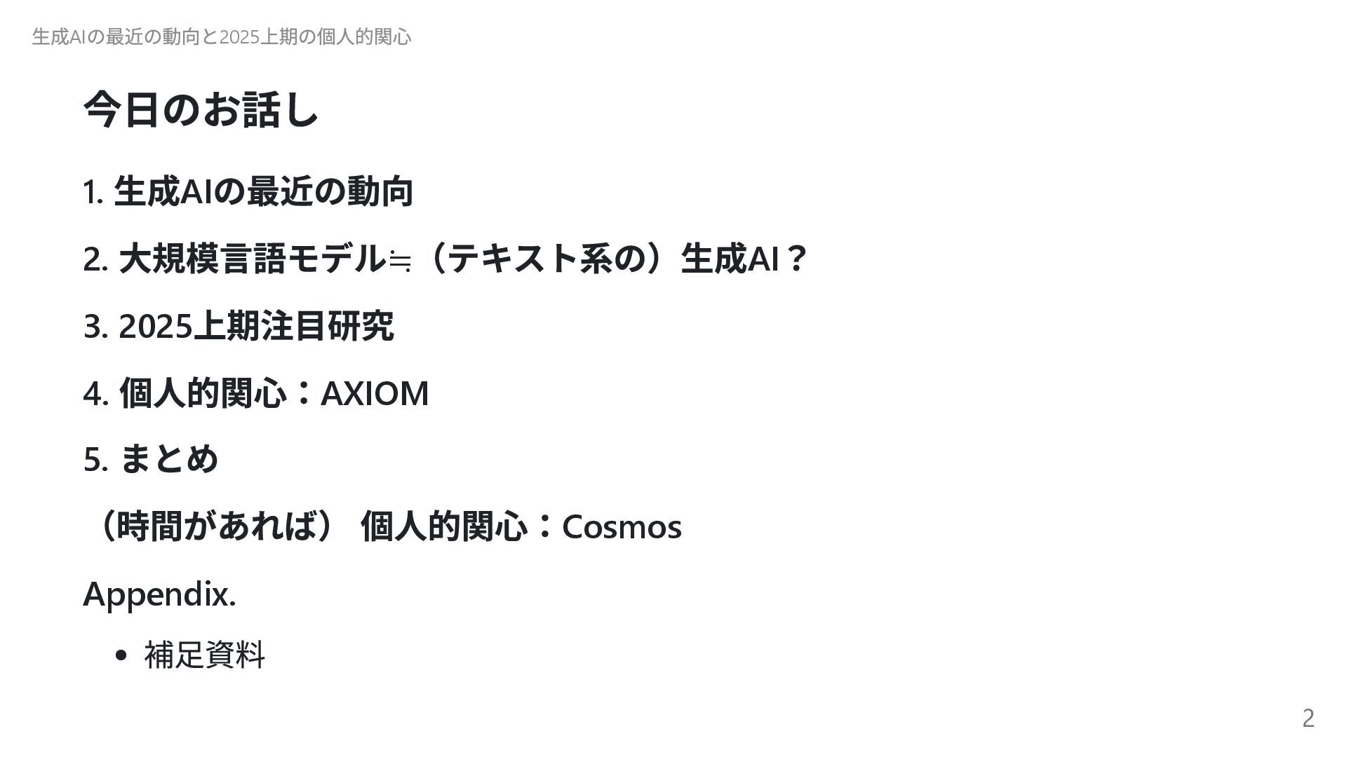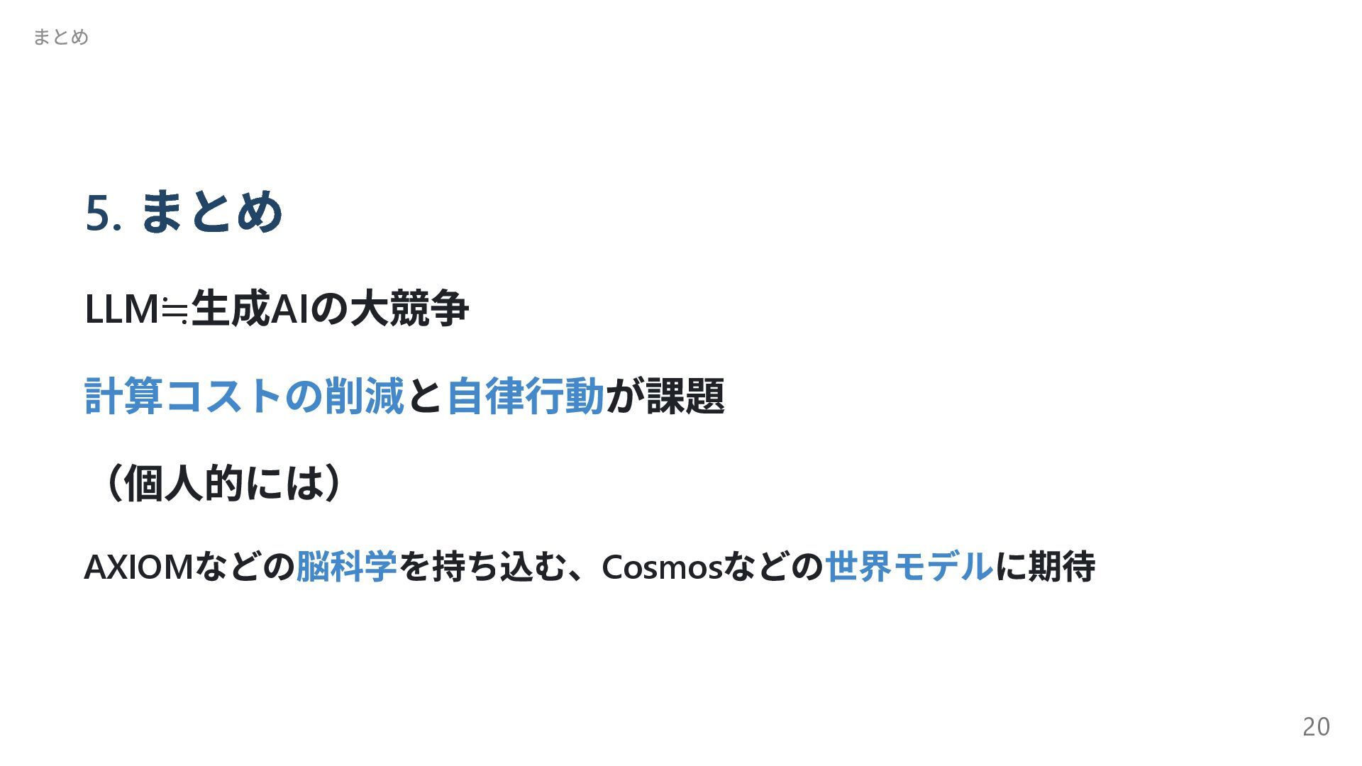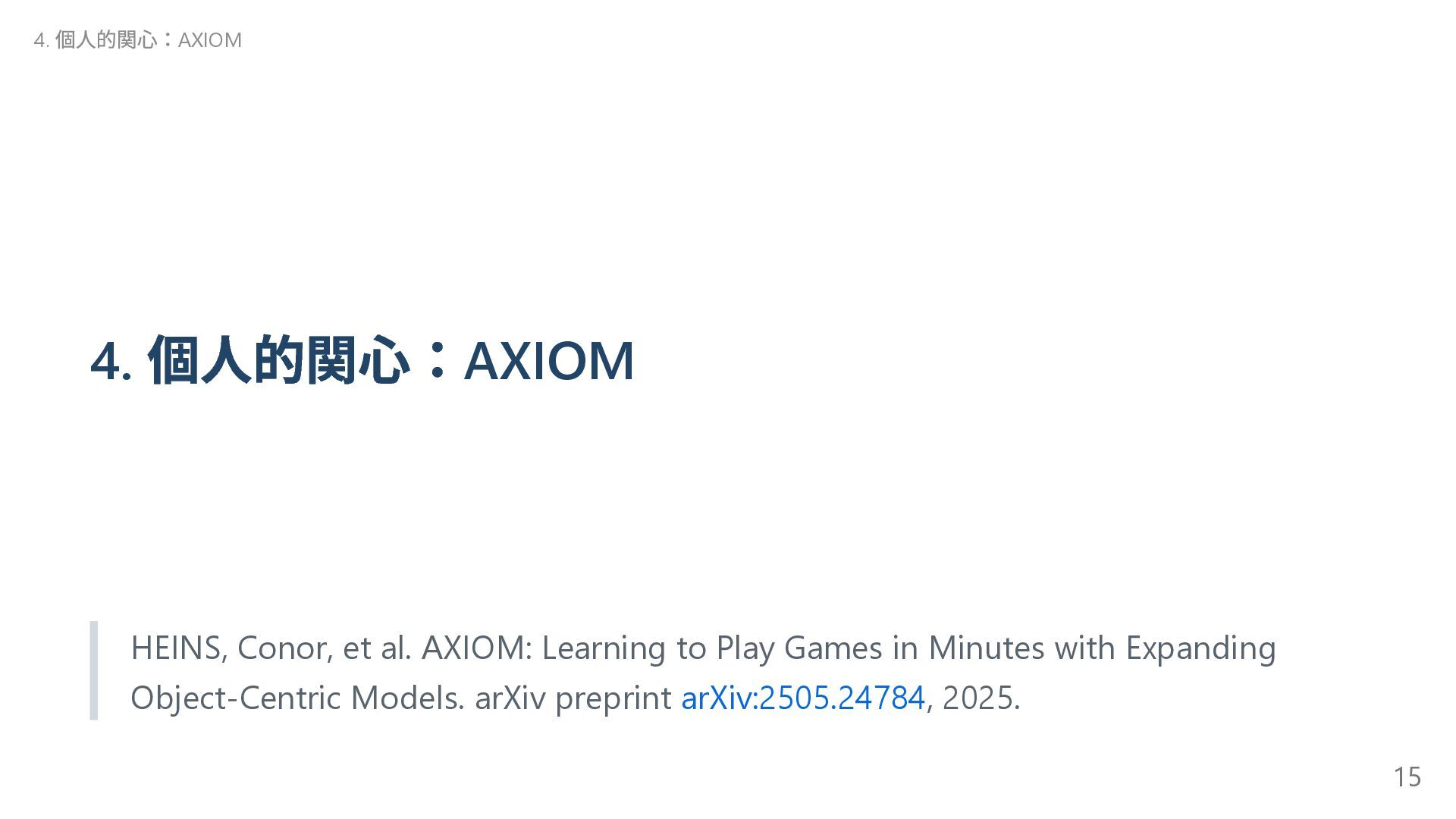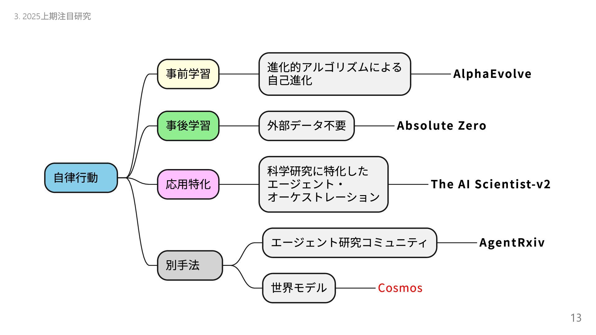 自己進化するAI 2 Absolute Zero 清華大学( 中国) 自己進化するAI 3 The AI Scientist-v2 Sakana AI AI 生成論文が査読通過 4 Transformers without Normalization Meta Transformer の構造改革 5 Kimi k1.5 Kimi( 中国) 新スケーリング! 6 DeepSeek-R1 DeepSeek( 中国) (推定)8.6 億円?の衝撃 7 Reasoning Language Models チューリッヒ工科大 推論型LLM の設計図 8 LLMs Get Lost In Multi-Turn Conversation Microsoft/SalesForce LLM も迷子になる! 9 AgentRxiv ジョンズ・ホプキンズ 大 AI エージェント研究コミュニティ 10 Acquiring Grounded Representations of Words ミシガン大 記号着地問題への一つのアプロ ーチ Appendix. 29