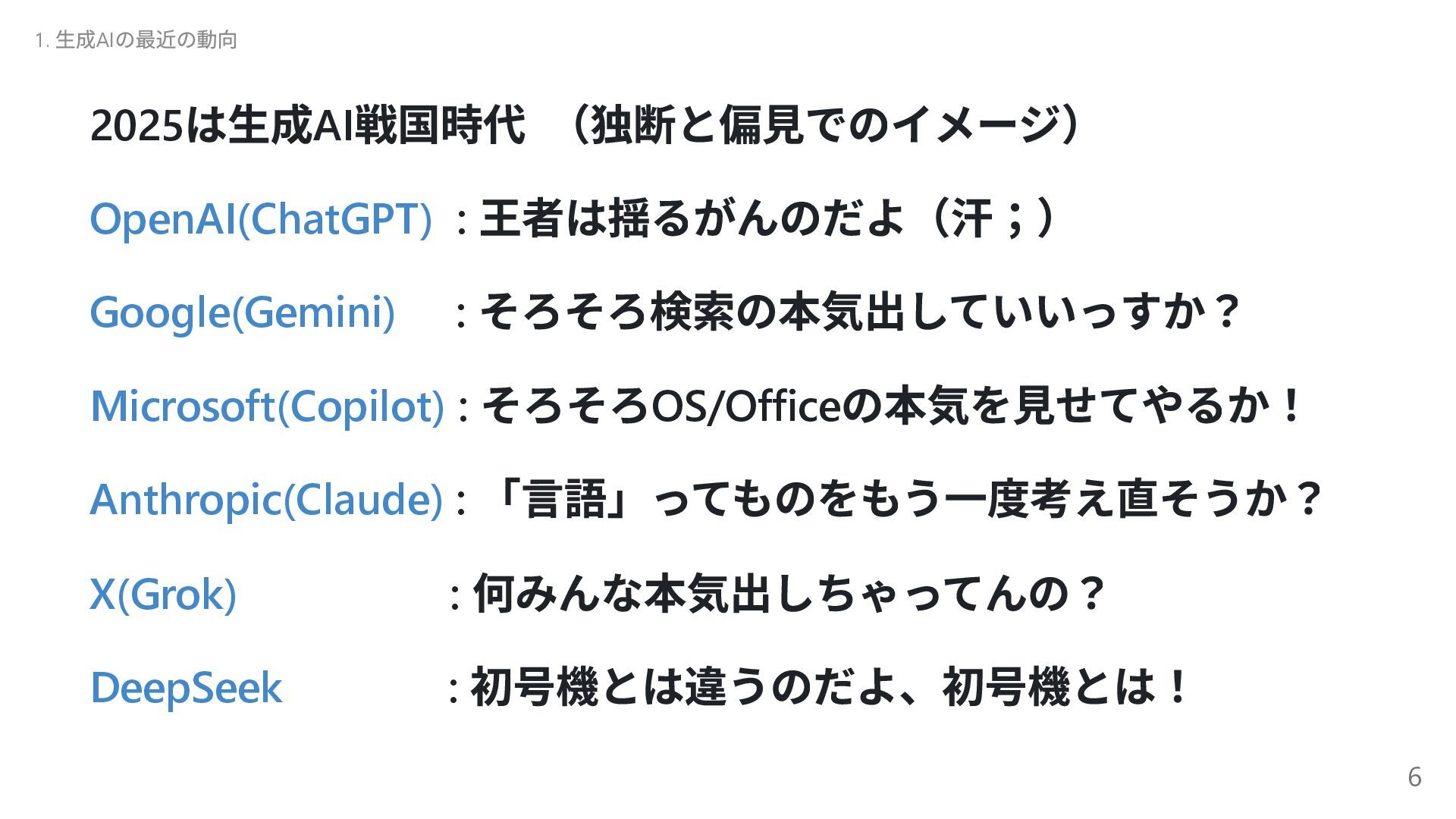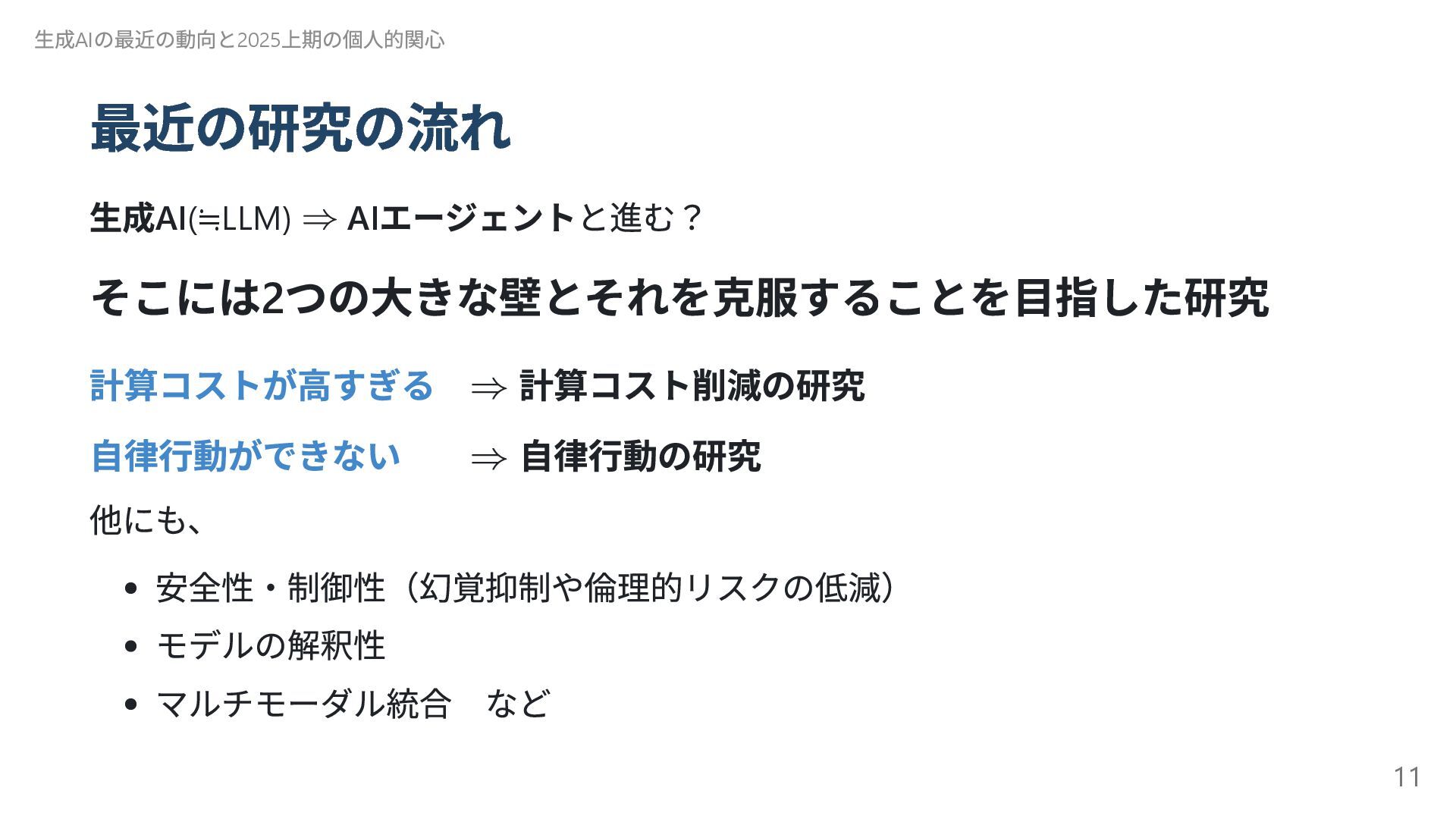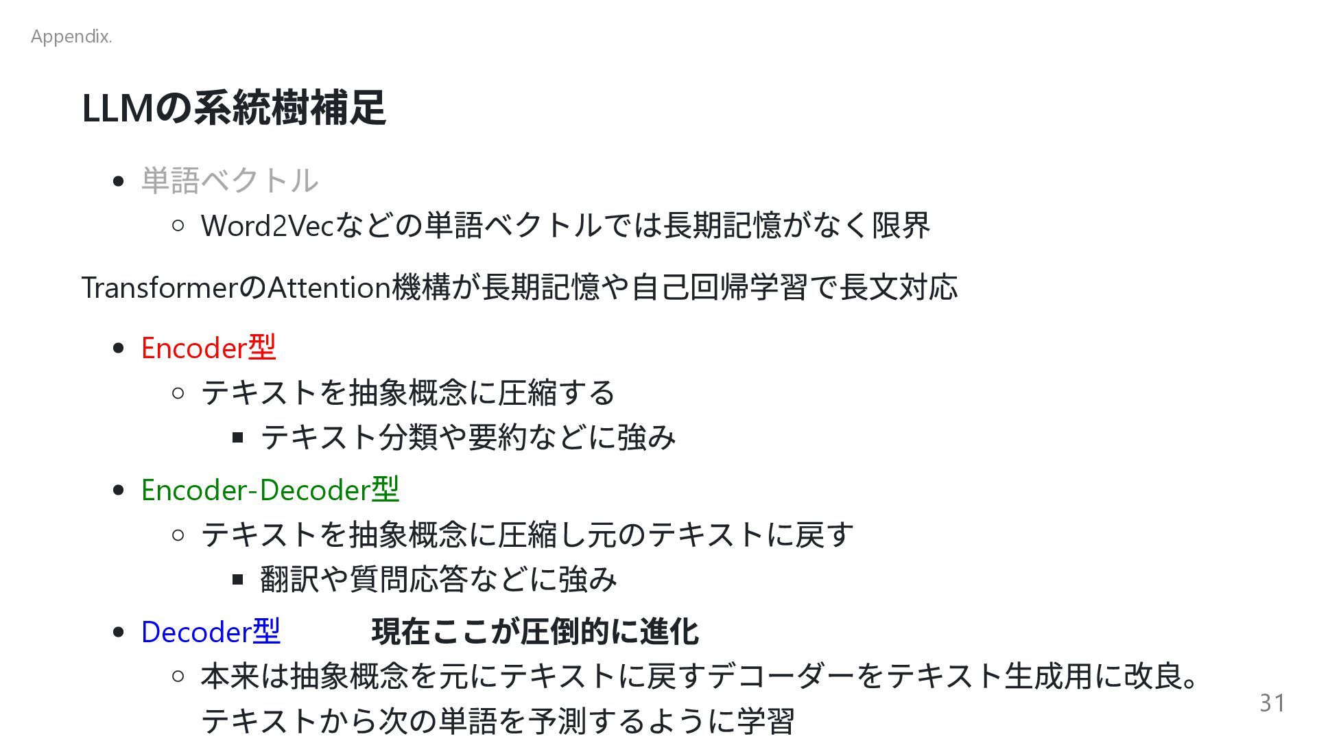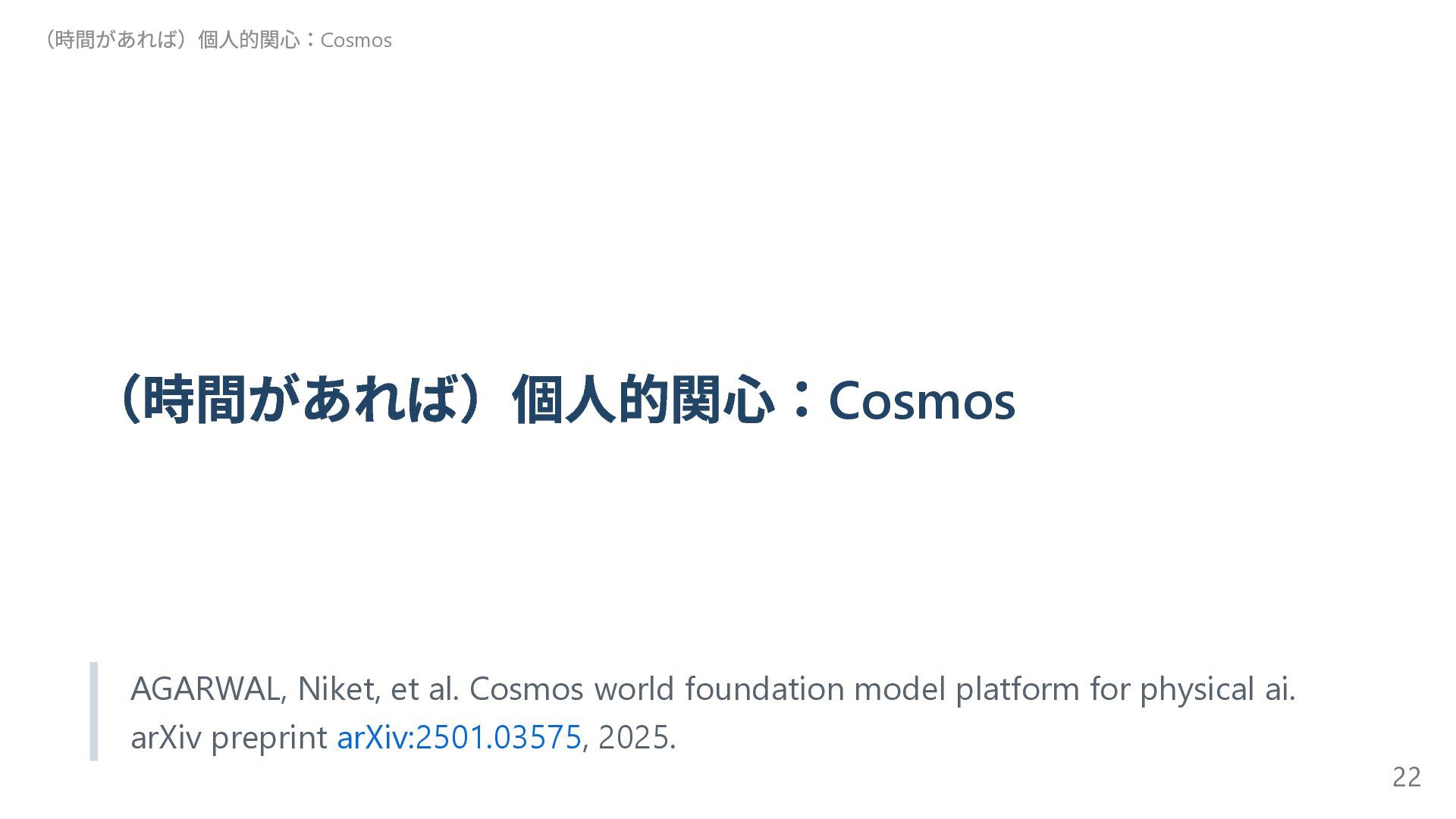 自己進化するAI 2 Absolute Zero 清華大学( 中国) 自己進化するAI 3 The AI Scientist-v2 Sakana AI AI 生成論文が査読通過 4 Transformers without Normalization Meta Transformer の構造改革 5 Kimi k1.5 Kimi( 中国) 新スケーリング! 6 DeepSeek-R1 DeepSeek( 中国) (推定)8.6 億円?の衝撃 7 Reasoning Language Models チューリッヒ工科大 推論型LLM の設計図 8 LLMs Get Lost In Multi-Turn Conversation Microsoft/SalesForce LLM も迷子になる! 9 AgentRxiv ジョンズ・ホプキンズ 大 AI エージェント研究コミュニティ 10 Acquiring Grounded Representations of Words ミシガン大 記号着地問題への一つのアプロ ーチ Appendix. 29