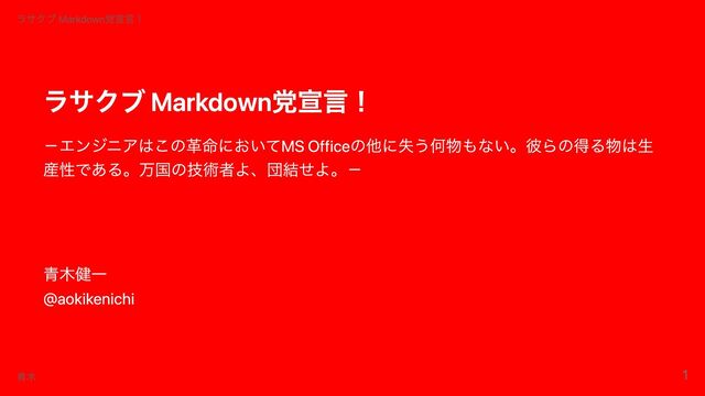 ラサクブ Markdown党宣言! -エンジニアはこの革命においてMS Officeの他に失う何物もない。彼らの得る物は生 産性である。万国の技術者よ、団結せよ。- 青木健一 @aokikenichi ラサクブ Markdown党宣言! 青木