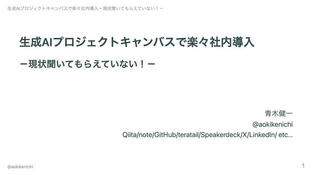 生成AIプロジェクトキャンバスで楽々社内導入 -現状聞いてもらえていない!- 青木健一 @aokikenichi Qiita/note/GitHub/teratail/Speakerdeck/X/LinkedIn/ etc... 生成AIプロジェクトキャンバスで楽々社内導入-現状聞いてもらえていない!- @aokikenichi 1