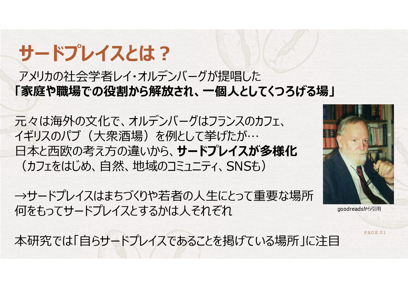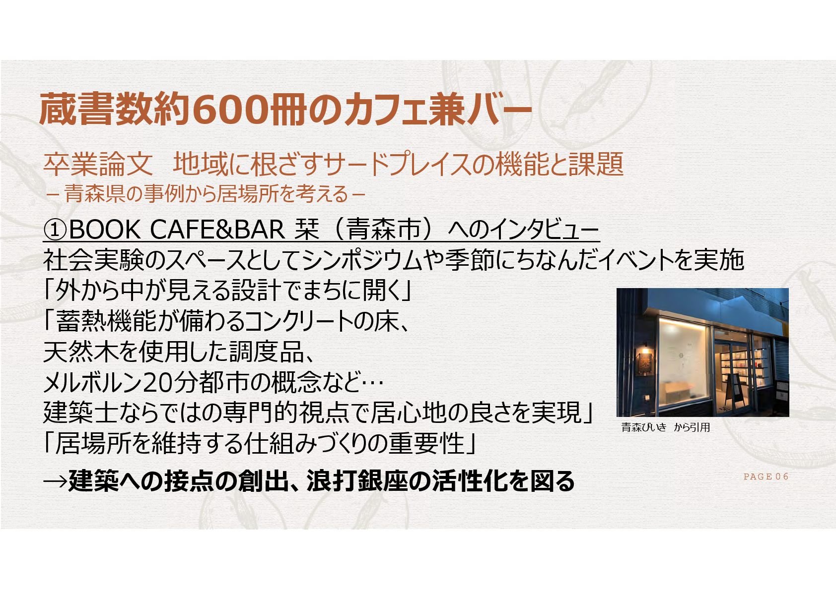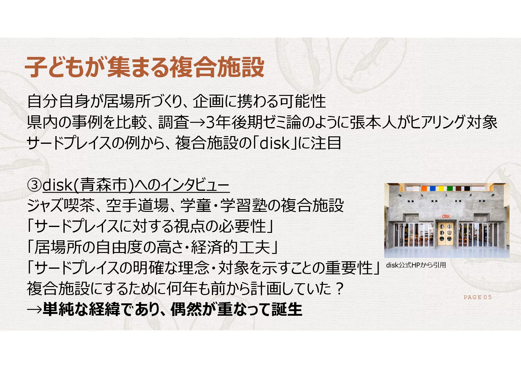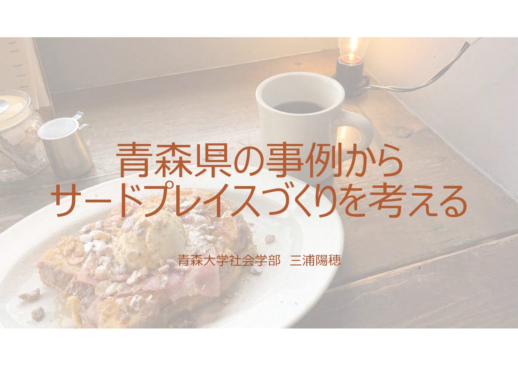 サードプレイスは「ありのままの自分でいられる、気軽に立ち寄れる、プライベートな空間といった特徴を備えた“場”」であり、まちづくりにおいて重要な場・機能である。本研究では、「もし誰かにとっての居場所を意図的に作るとしたら何から始めるべきなのか、居場所として継続していくにはどのような工夫が必要なのか、特に青森県であればどのような要素が支持されるのか」について、主にヒアリングによって調査した結果を報告する。