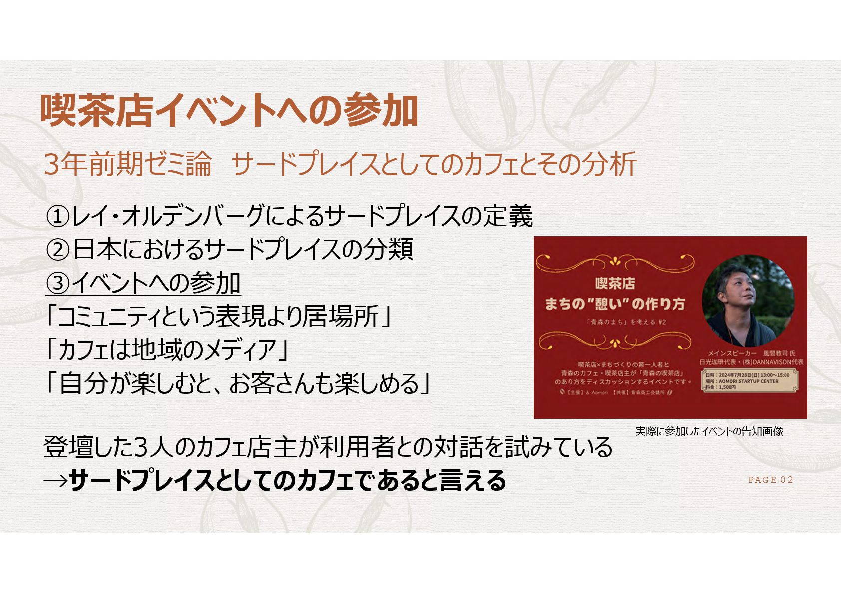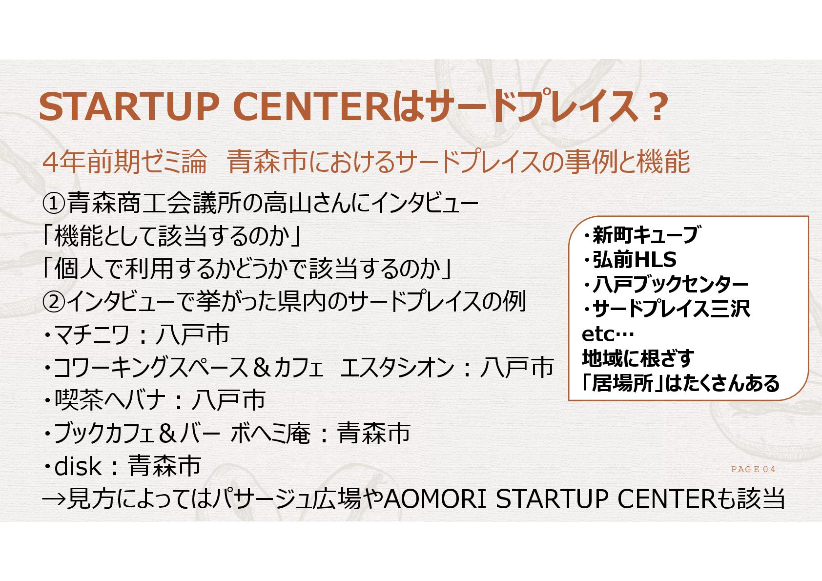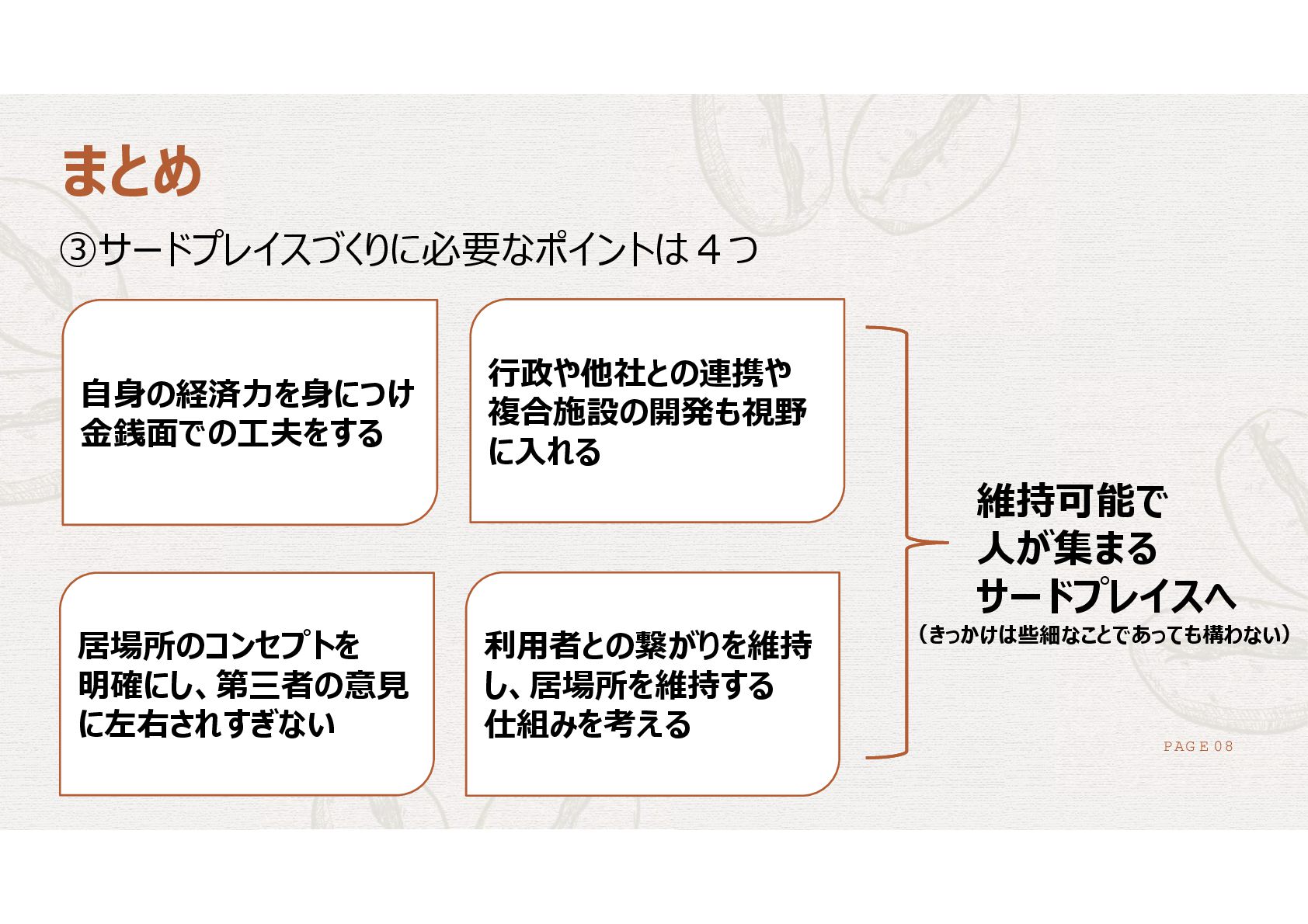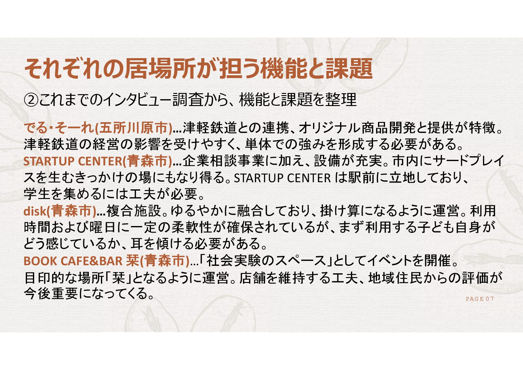 サードプレイスは「ありのままの自分でいられる、気軽に立ち寄れる、プライベートな空間といった特徴を備えた“場”」であり、まちづくりにおいて重要な場・機能である。本研究では、「もし誰かにとっての居場所を意図的に作るとしたら何から始めるべきなのか、居場所として継続していくにはどのような工夫が必要なのか、特に青森県であればどのような要素が支持されるのか」について、主にヒアリングによって調査した結果を報告する。