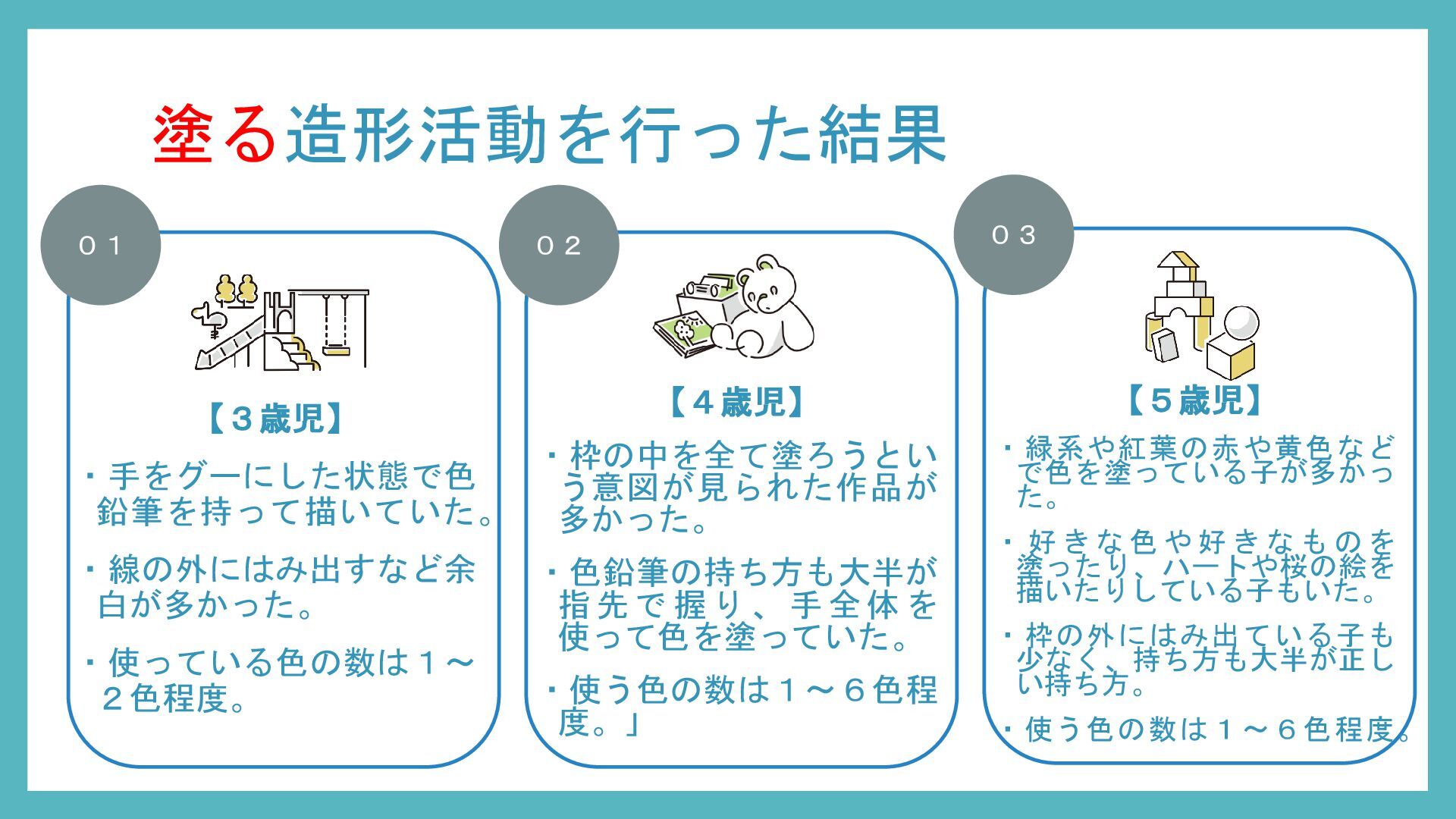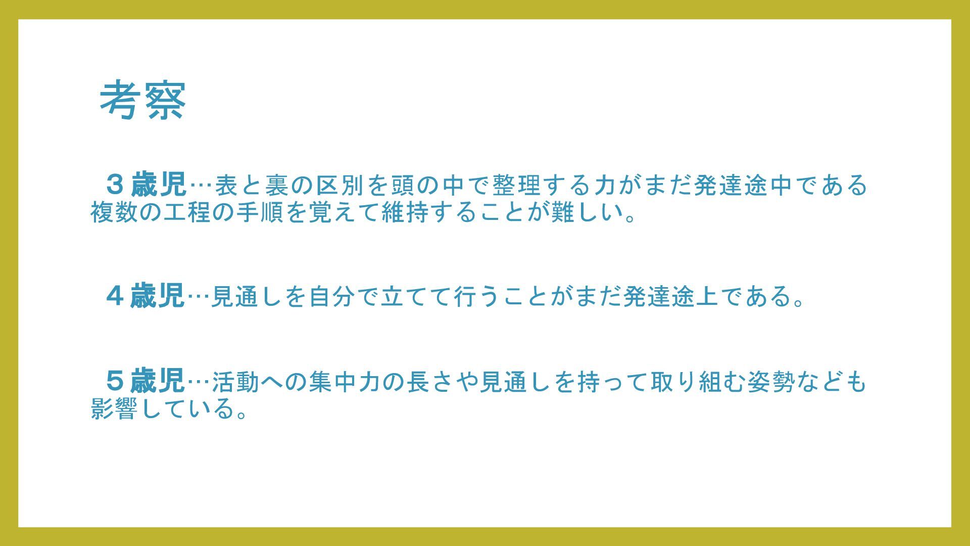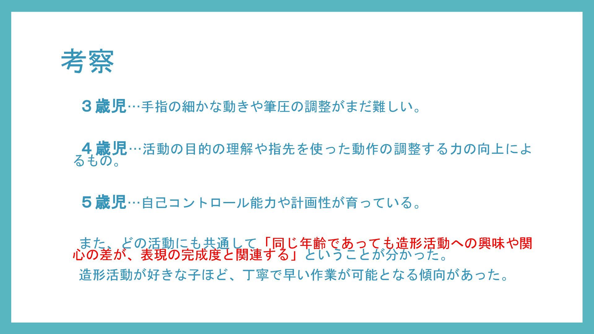 考察として、造形活動の発達は年齢とともに「経験の蓄積 → 意図の形成 → 創造的表現」へと段階的に伸びていくこと、また同年齢でも園の方針や経験量、活動への意欲によって結果には個人差が大きいことが明らかになった。したがって、発達段階を理解するだけでなく、日常的な子どもの姿を丁寧に観察し、一人ひとりの興味や経験に合わせた声かけや支援を行うことが重要であるだろう。