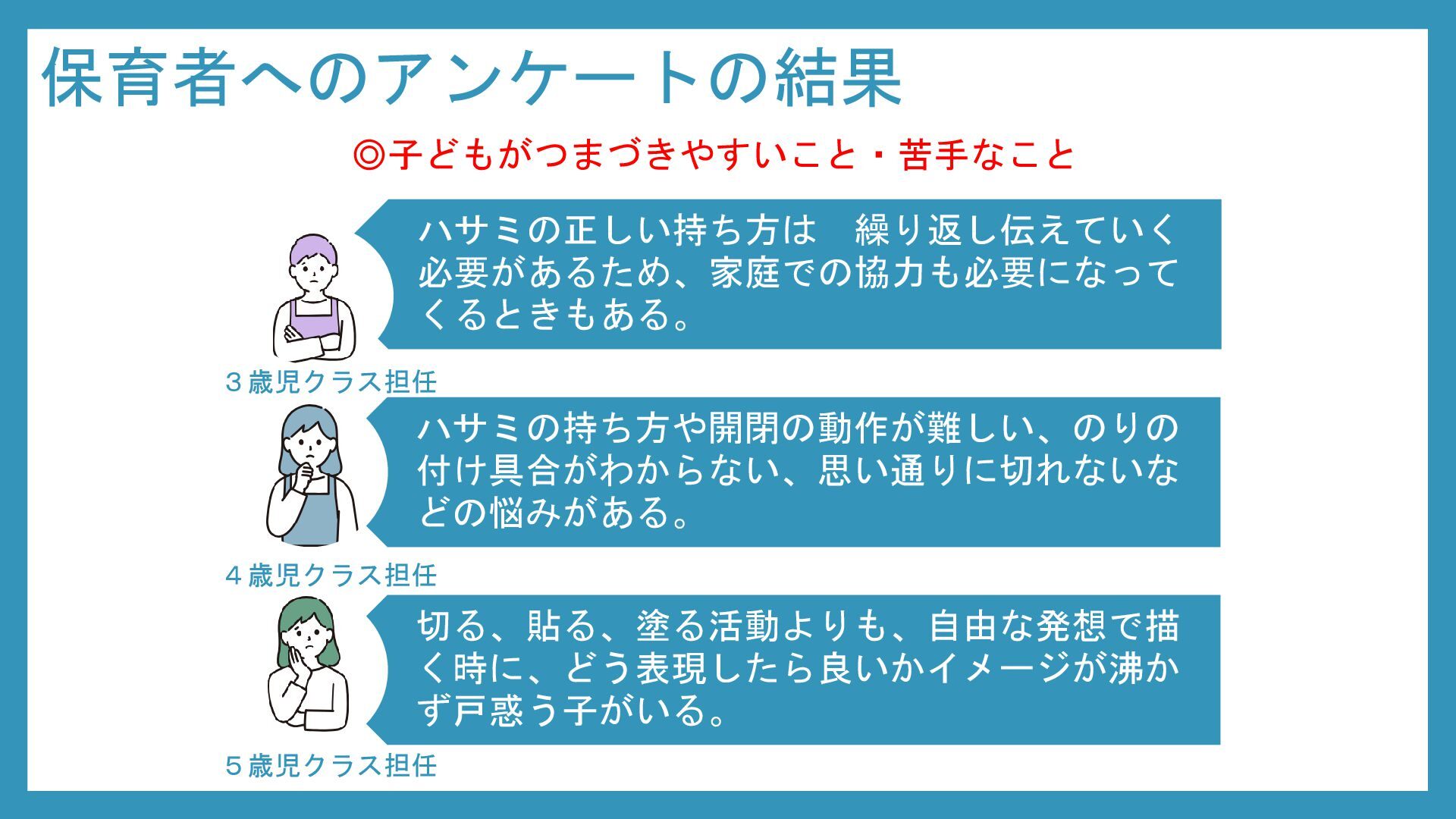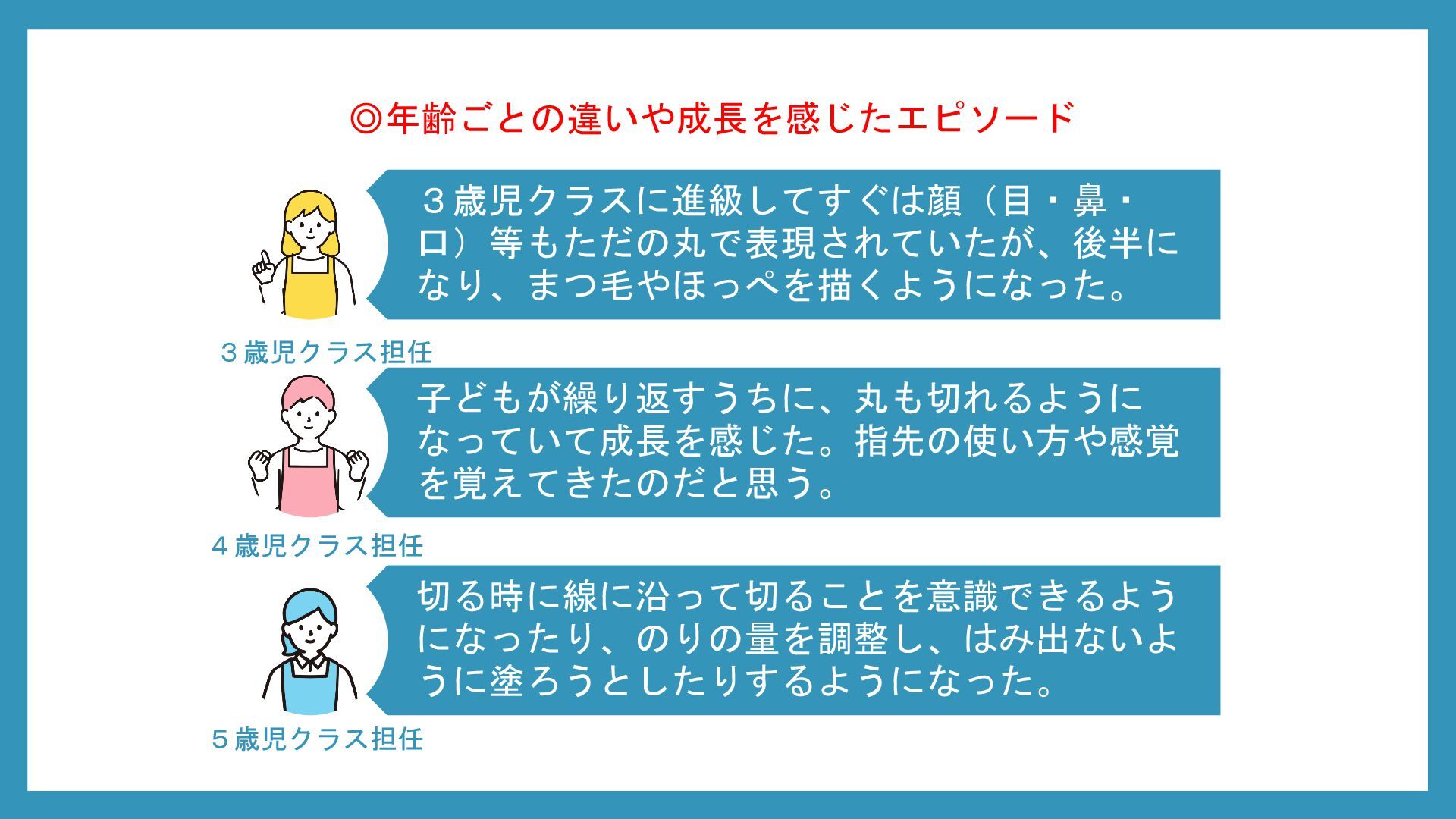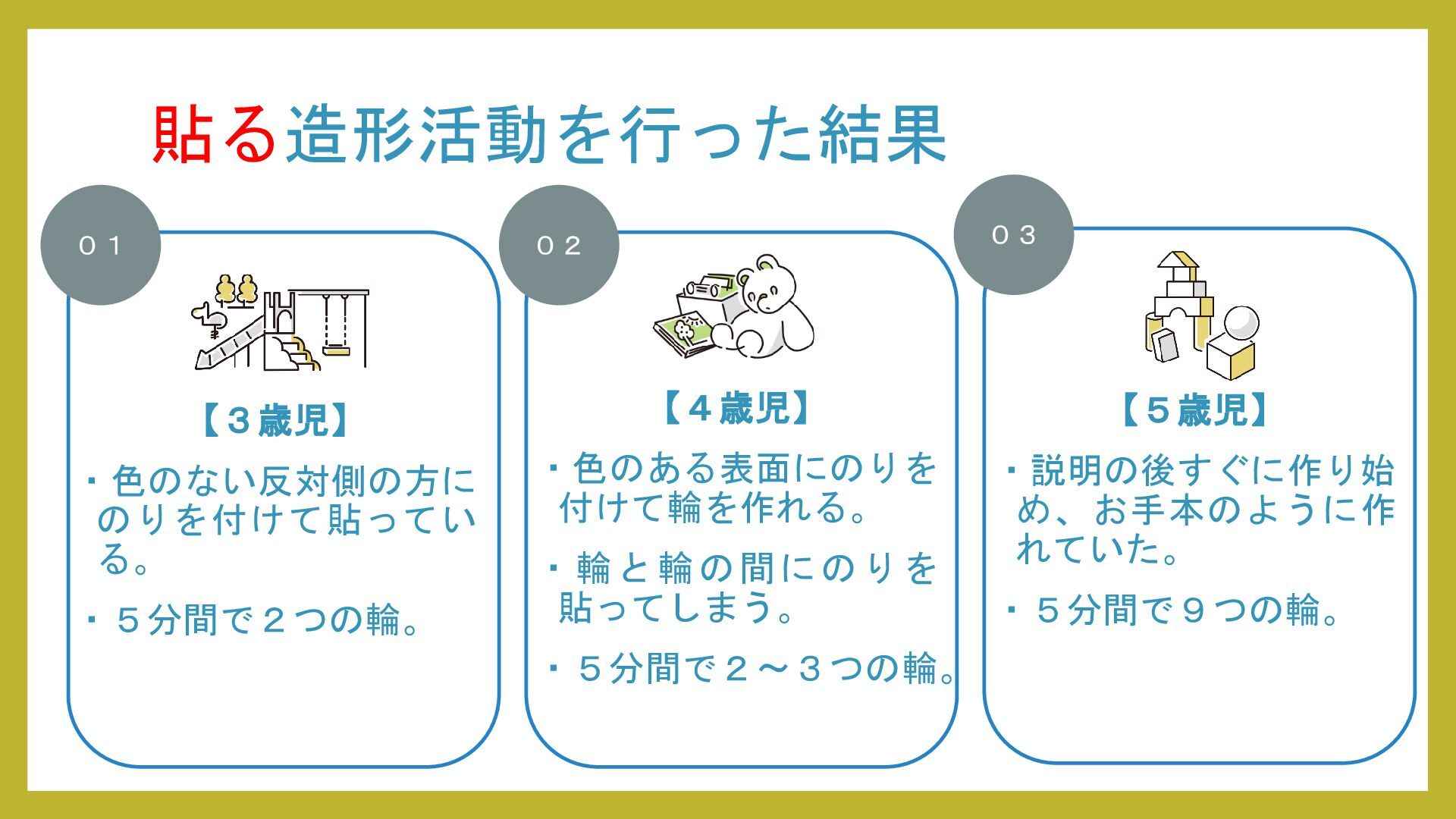 考察として、造形活動の発達は年齢とともに「経験の蓄積 → 意図の形成 → 創造的表現」へと段階的に伸びていくこと、また同年齢でも園の方針や経験量、活動への意欲によって結果には個人差が大きいことが明らかになった。したがって、発達段階を理解するだけでなく、日常的な子どもの姿を丁寧に観察し、一人ひとりの興味や経験に合わせた声かけや支援を行うことが重要であるだろう。