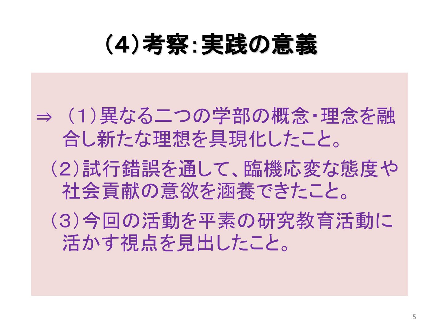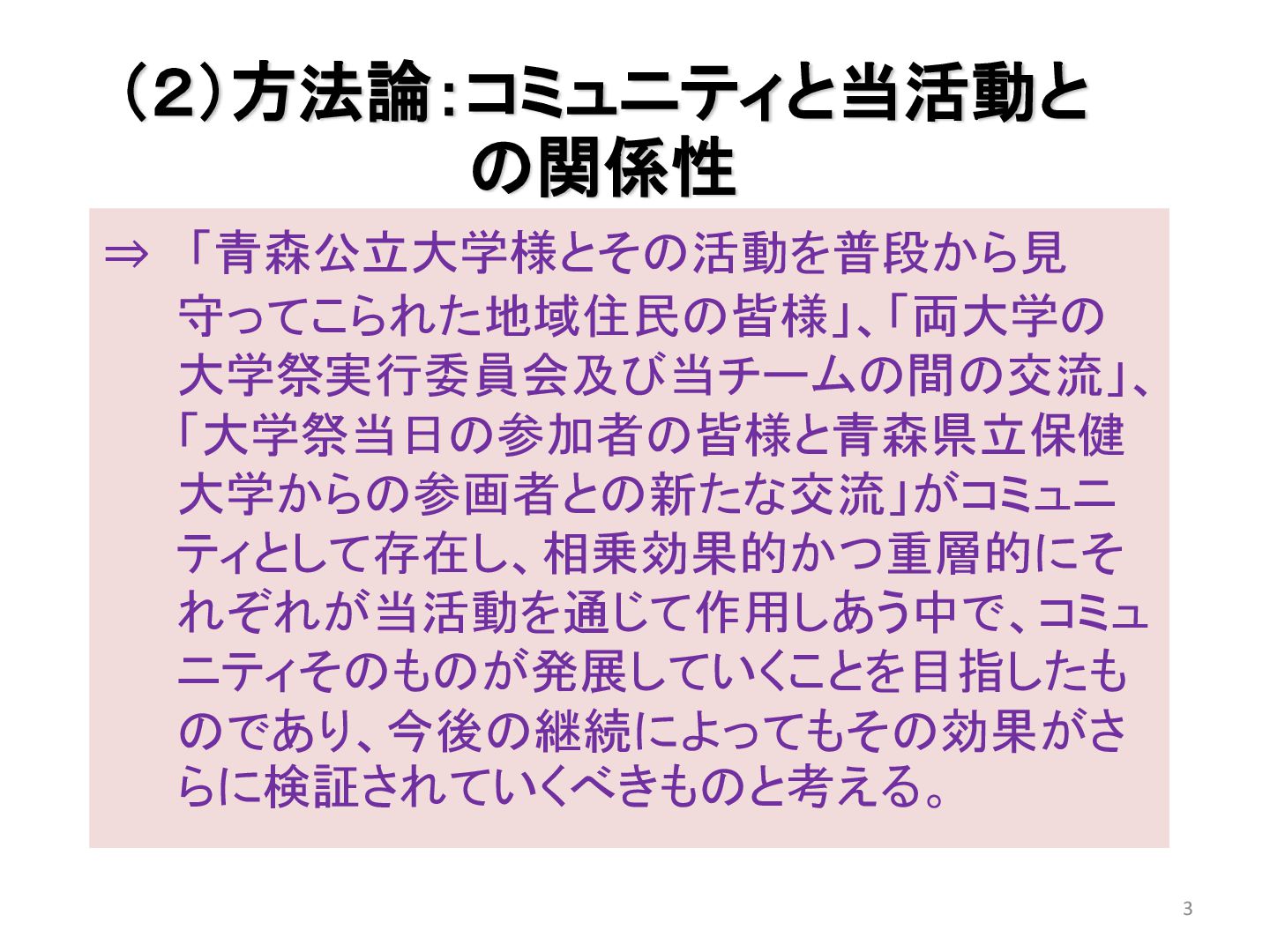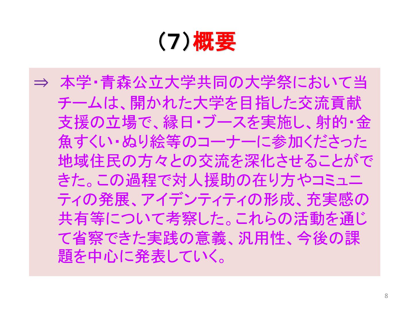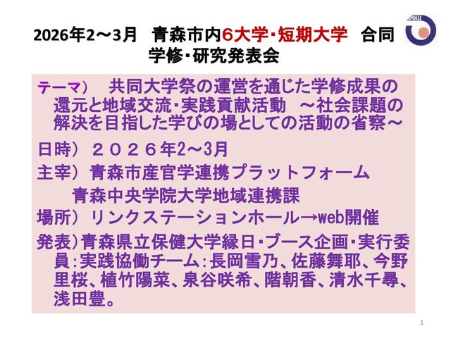 本学・青森公立大学共同の大学祭において当チームは、開かれた大学を目指した交流貢献支援の立場で、縁日・ブースを実施し、射的・金魚すくい・ぬり絵等のコーナーに参加くださった地域住民の方々との交流を深化させることができた。この過程で対人援助の在り方やコミュニティの発展、アイデンティティの形成、充実感の共有等について考察した。これらの活動を通じて省察できた実践の意義、汎用性、今後の課題を中心に発表していく。