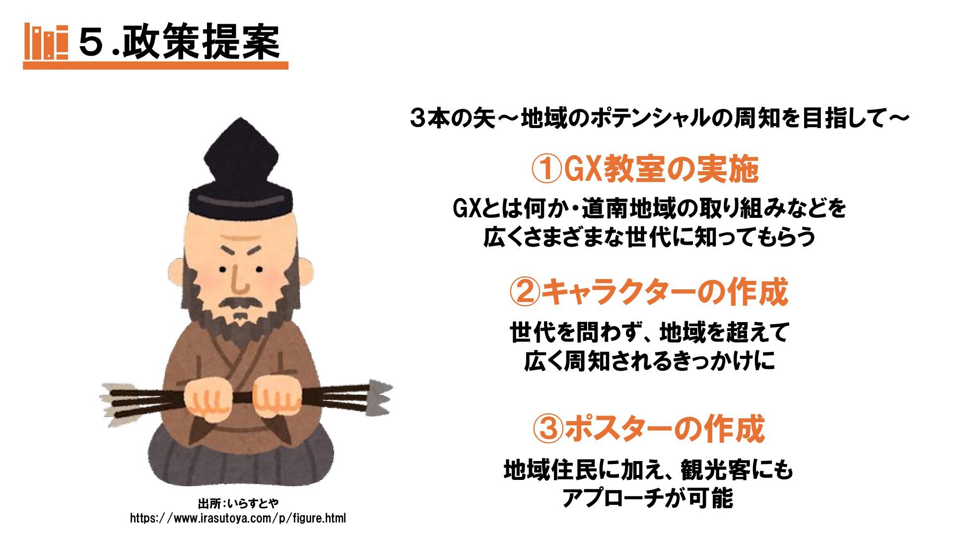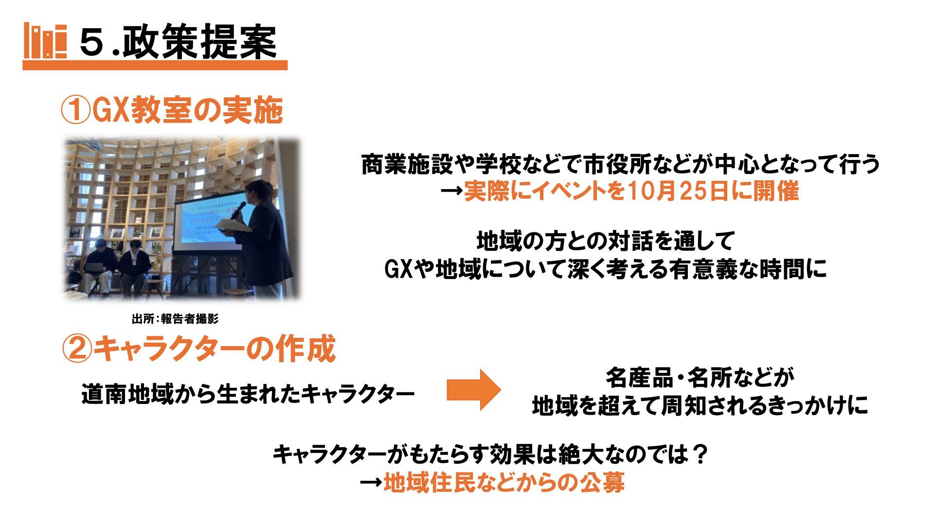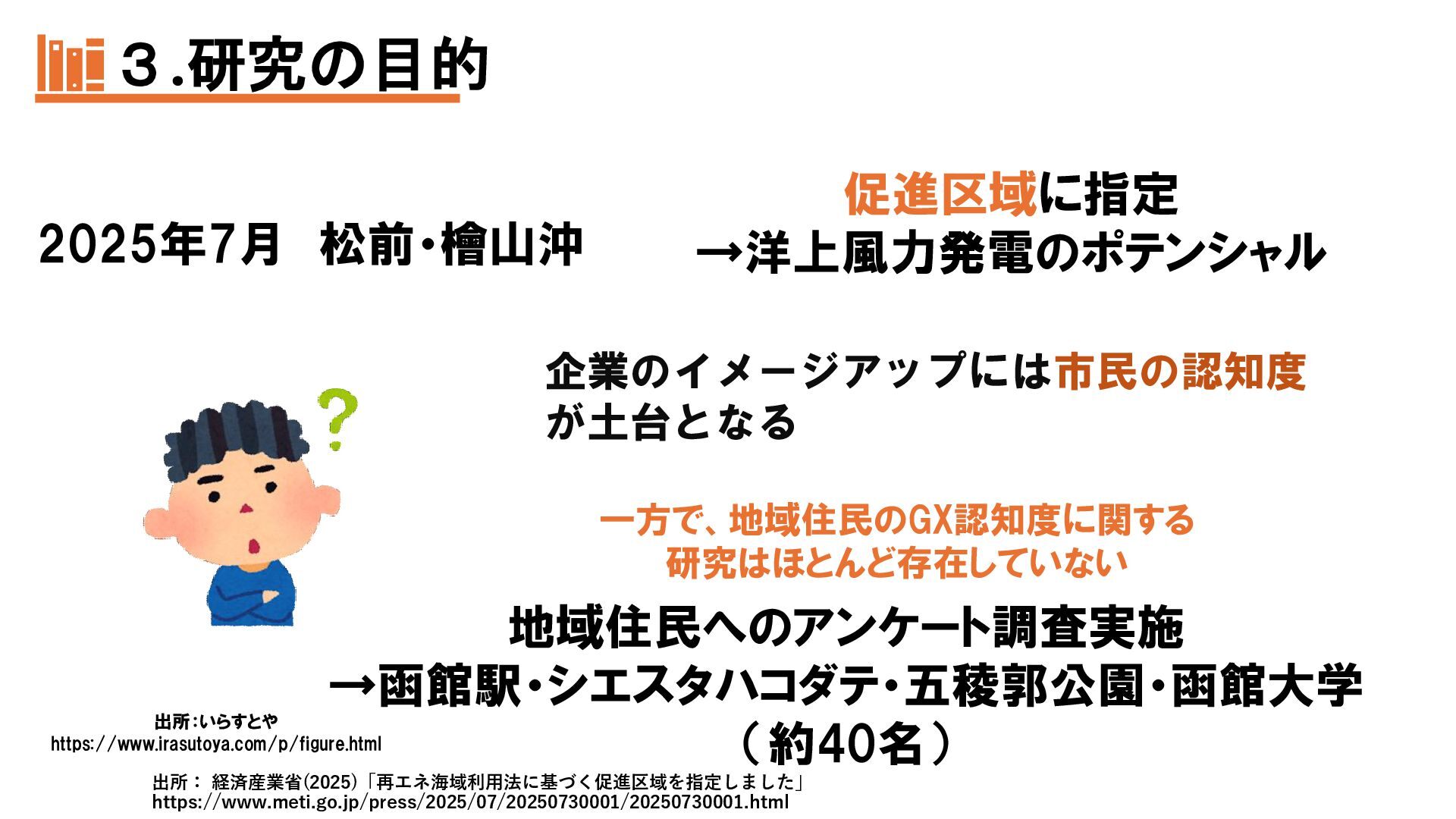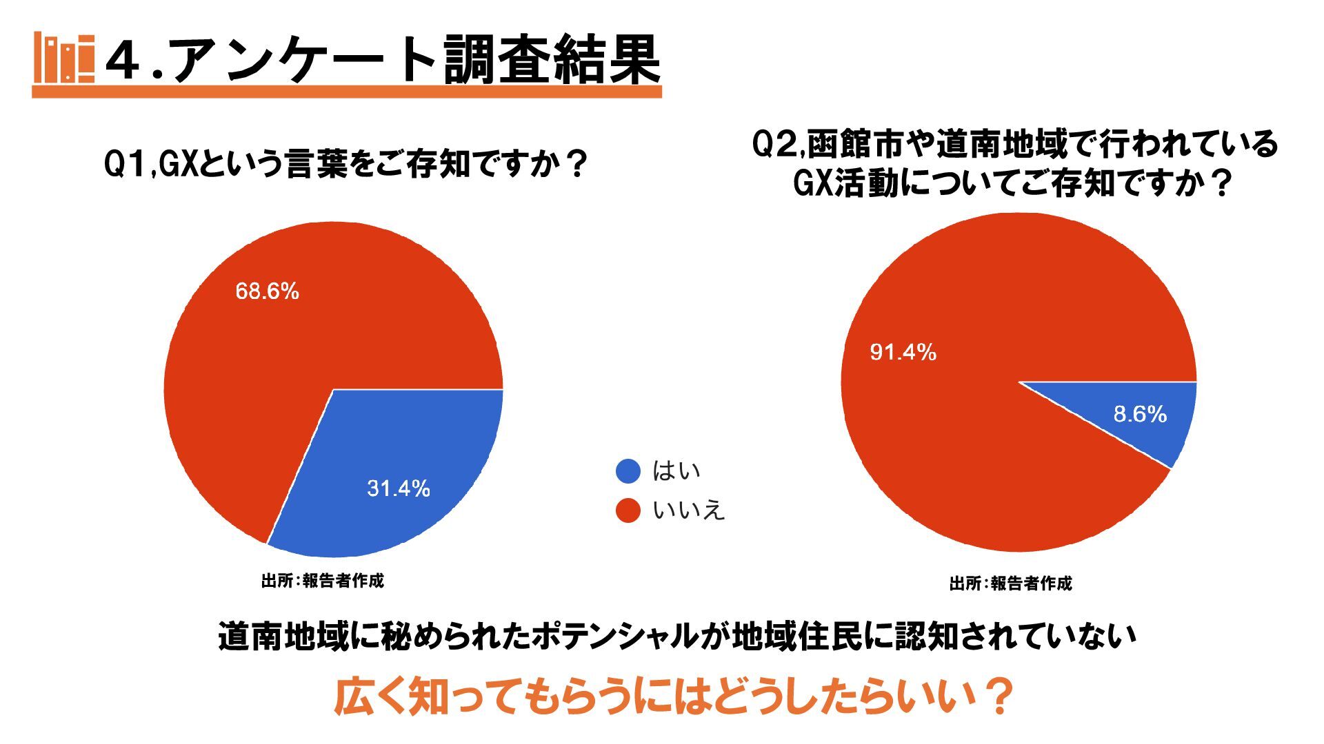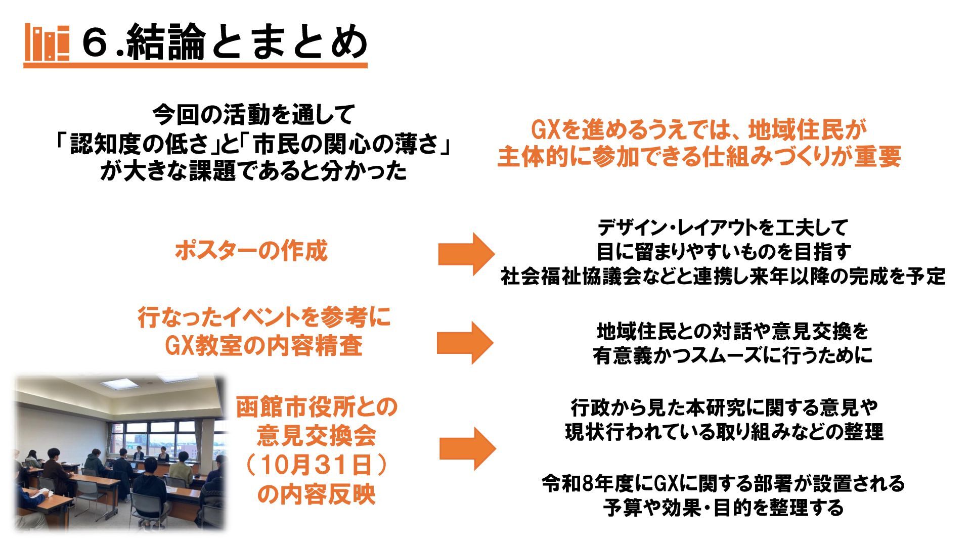 本発表では、函館市民のGX認知度向上を目的に、2025年7〜10月に市内4地点で実施したアンケート調査(40名回答)の結果を報告する。市民の多くがGXを知らず、環境保全への関心も高くないことから、最大の課題は周知不足と明らかになった。そこで私たちは、①GX教室の実施、②地域キャラクターの作成、③視覚支援にも配慮したポスターの制作という「3本の矢」を提案し、地域住民が主体的にGXへ関わる仕組みづくりを示す。