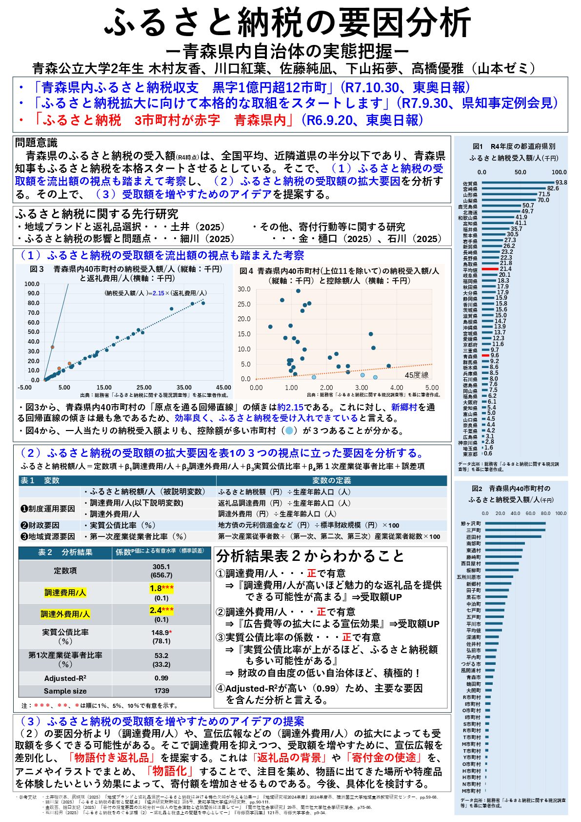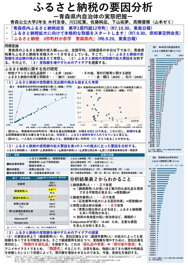 ふるさと納税は、各地方自治体の財源確保に資するだけでなく、当該自治体における特産品等の消費拡大や、寄付者の節税にもつながる優れた制度と言える。地方創生の手段の一つとしても有効である一方、自治体間で寄付額をめぐる競争も活発化している。そこで、こうした制度を有効活用している自治体の特徴を定量的な視点から明らかにし、そうした視点を踏まえつつ、青森県内自治体の特徴的な取り組みを考察する。