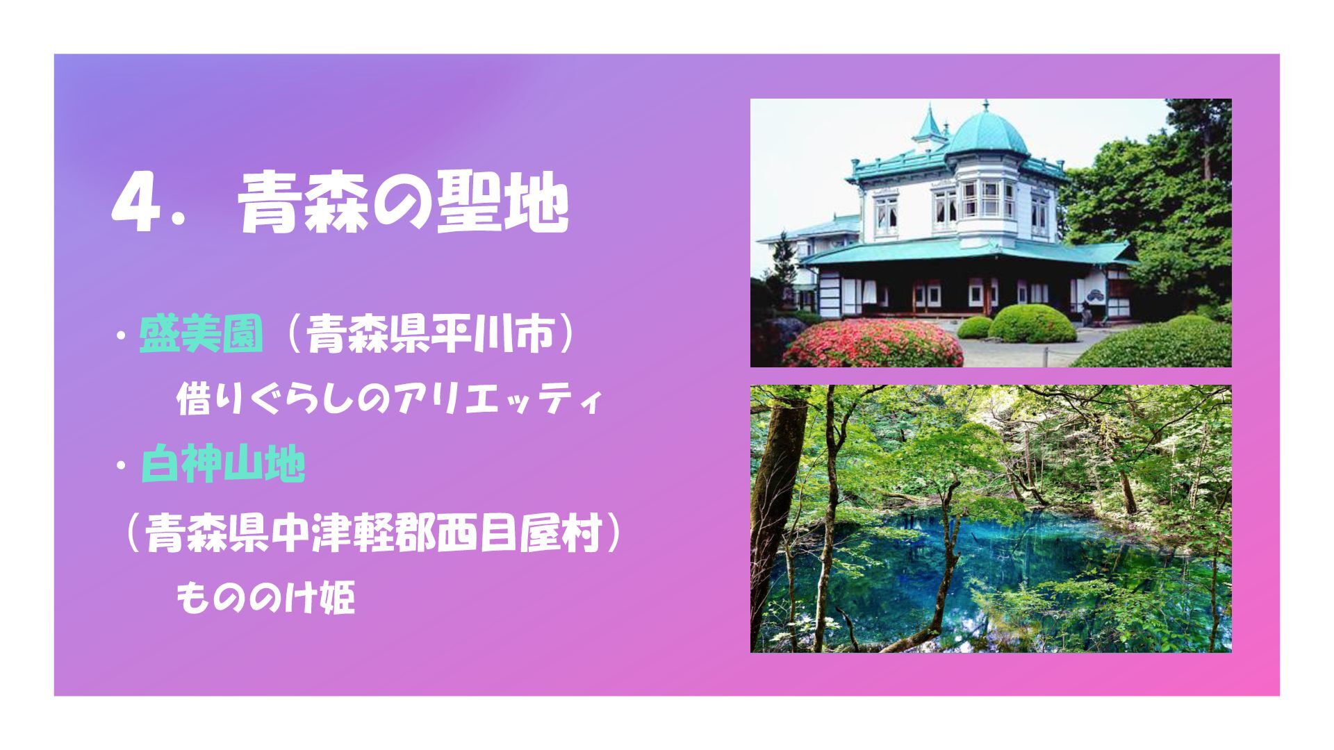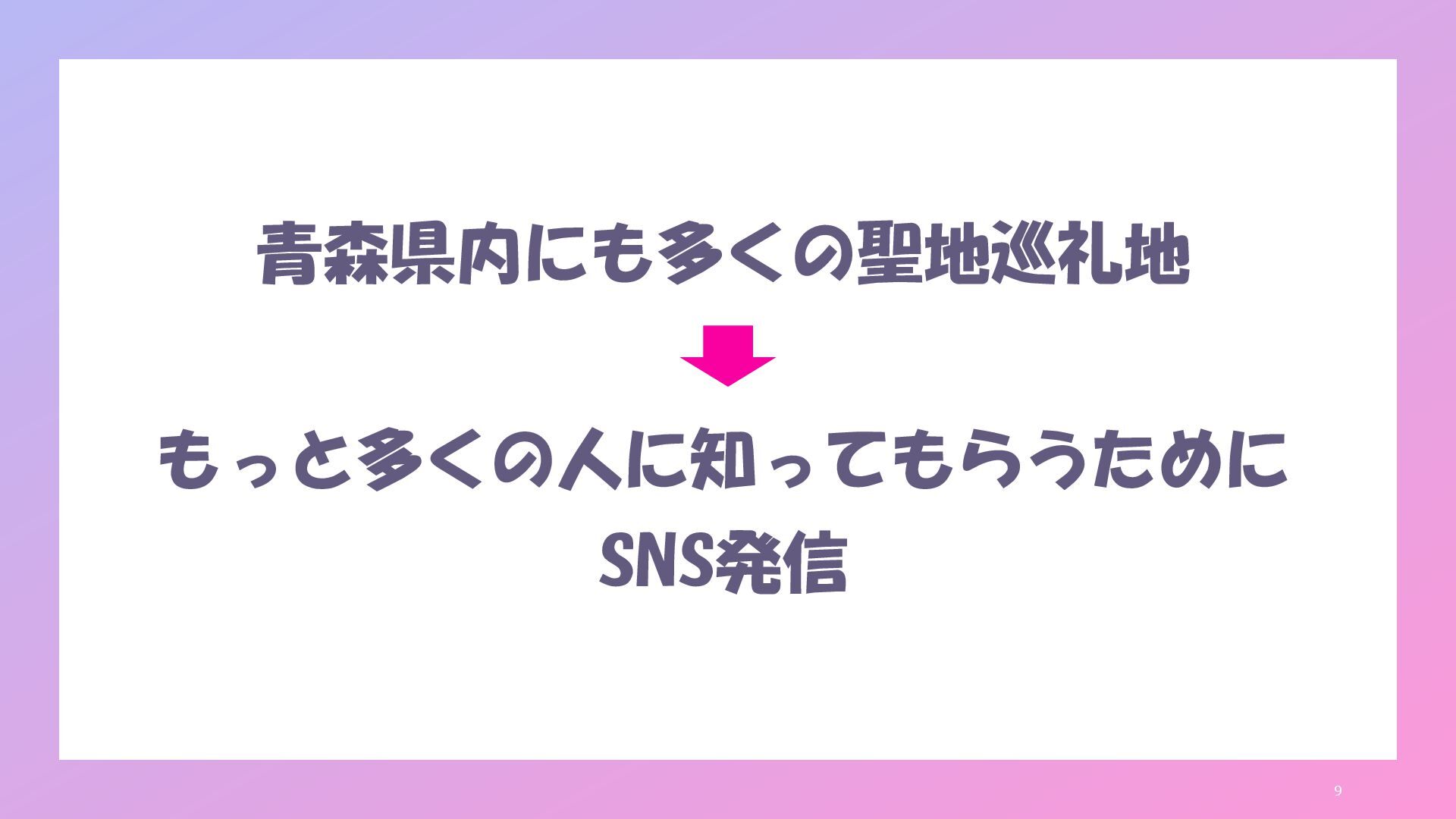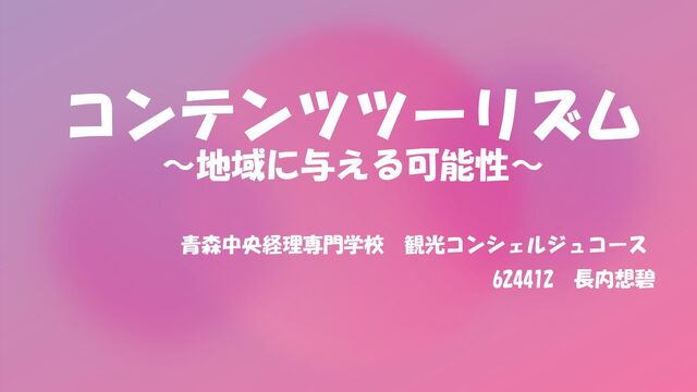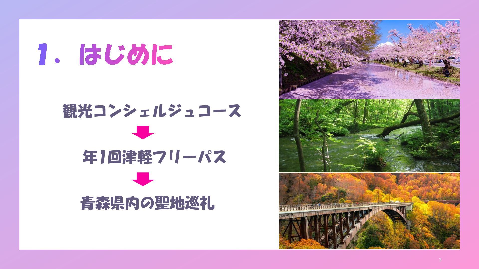 JRの企画きっぷである「津軽フリーパス」を利用する実習をきっかけに、青森県内の聖地巡礼に興味を持ちました。<コンテンツツーリズムのはじまり><青森の聖地><青森県観光入込客数>の観点からの発表です。今後、聖地巡礼をもっと多くの人に知ってもらうことで観光客数が増加し、地域活性化に繋げることができると思いました。SNSなどの情報発信により、一人でも多くの人に、青森県の魅力を知ってもらいたい思いです。
