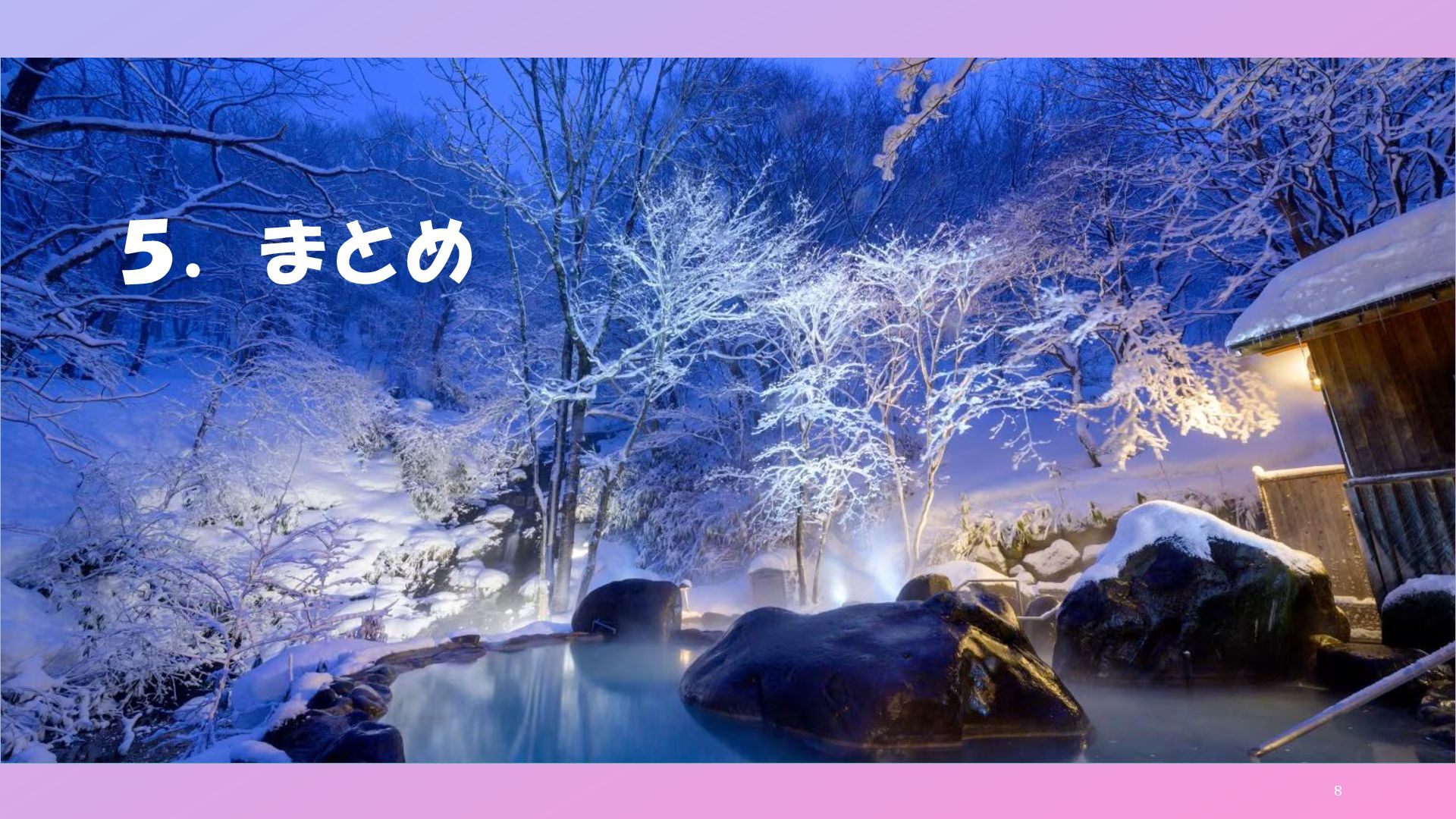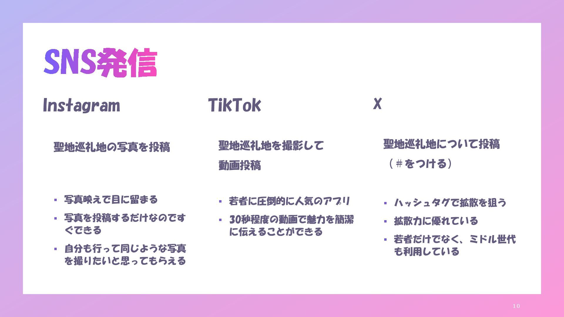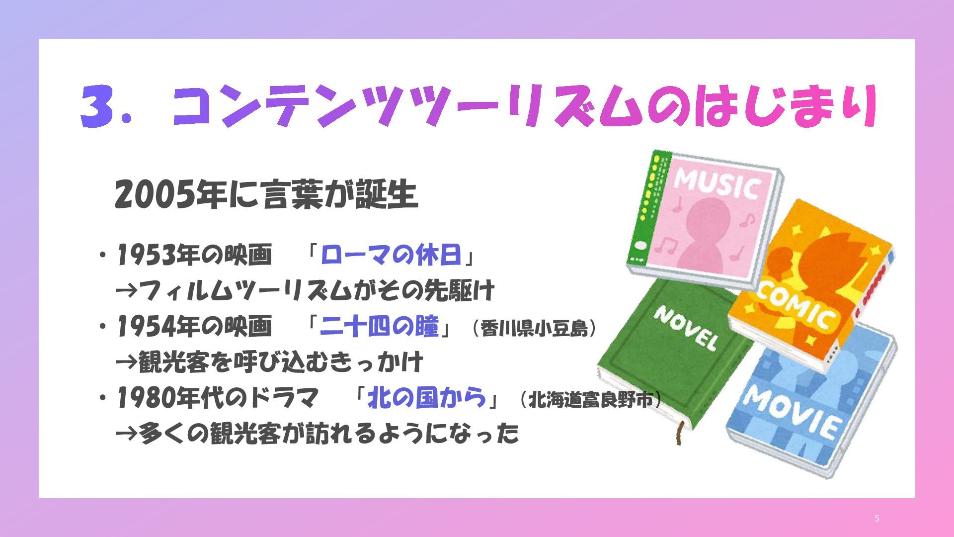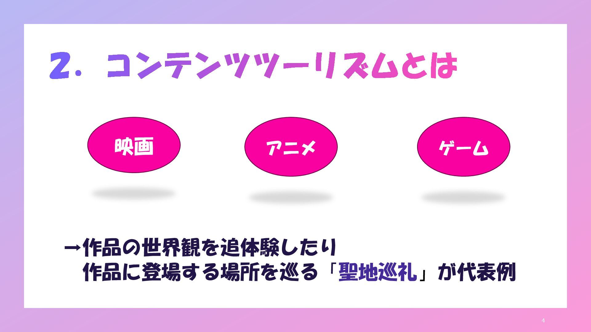 JRの企画きっぷである「津軽フリーパス」を利用する実習をきっかけに、青森県内の聖地巡礼に興味を持ちました。<コンテンツツーリズムのはじまり><青森の聖地><青森県観光入込客数>の観点からの発表です。今後、聖地巡礼をもっと多くの人に知ってもらうことで観光客数が増加し、地域活性化に繋げることができると思いました。SNSなどの情報発信により、一人でも多くの人に、青森県の魅力を知ってもらいたい思いです。