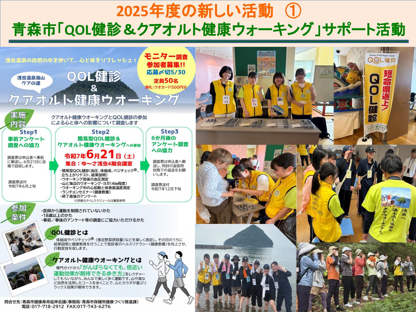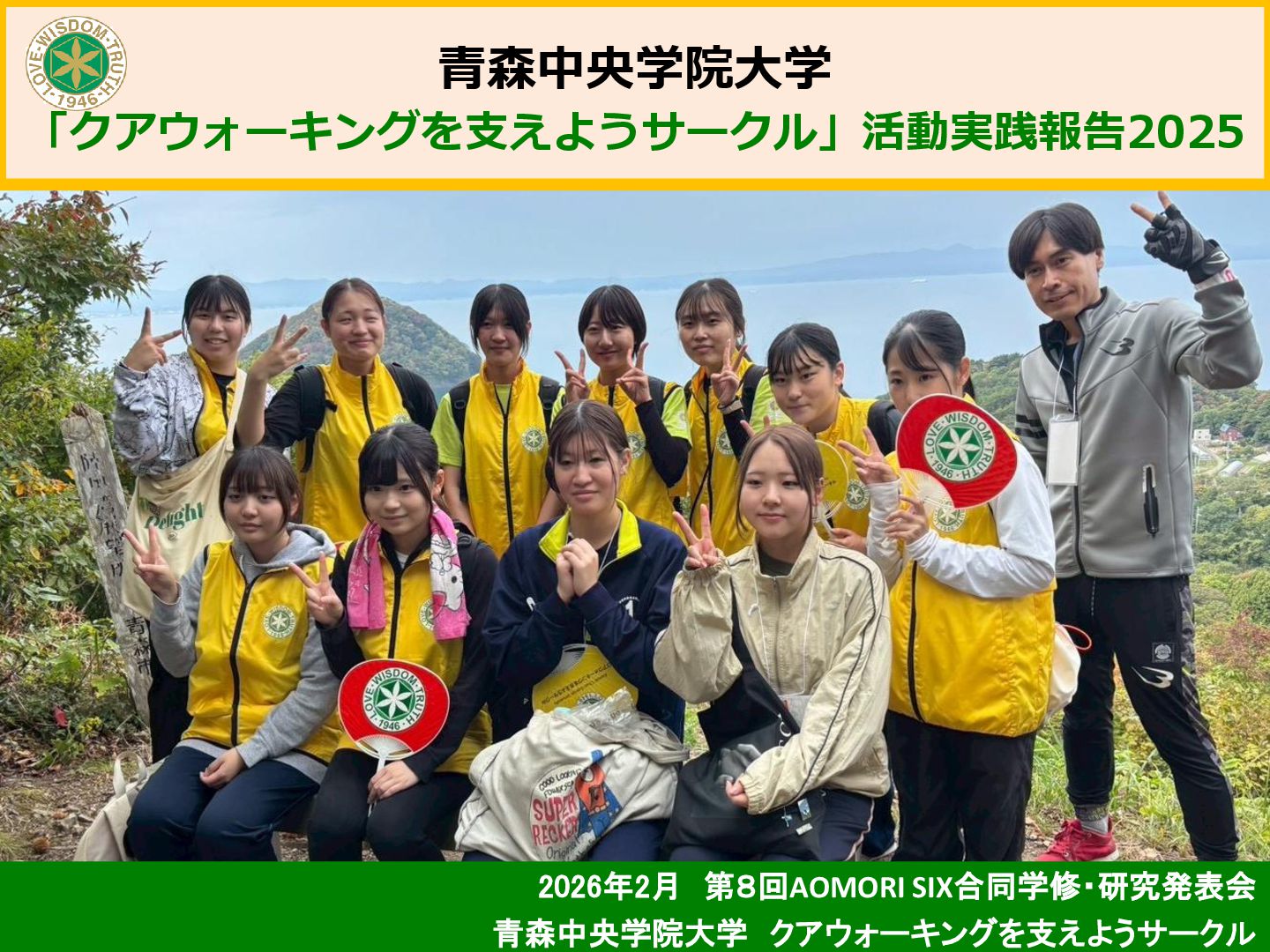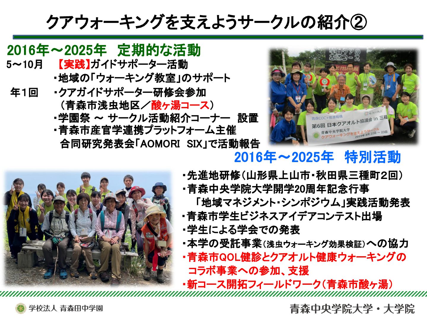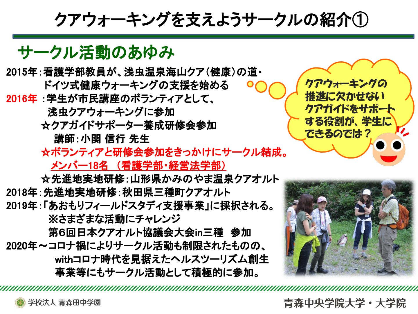 本サークルは、青森市浅虫温泉地域で実施されている「ドイツ式健康ウォーキング(クアウォーキング)」を、安心・安全に行うためのサポート活動を行っている。今年度は青森市主催のQOL健診とウォーキングのコラボ企画を支援したり、酸ヶ湯における新コース開拓のためのフィールドワークに参加するなど、支援活動の幅を広げることができた。それらを中心に、2025年度の活動と学びについて報告する。