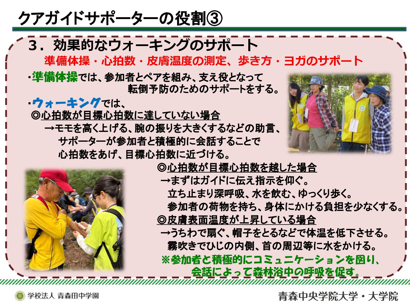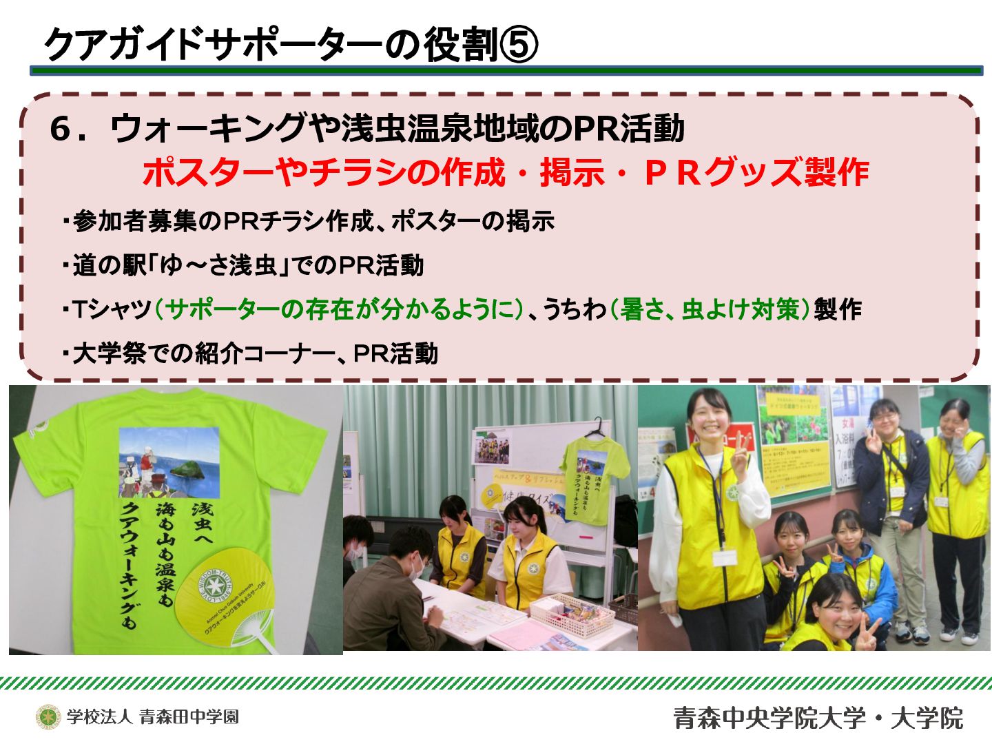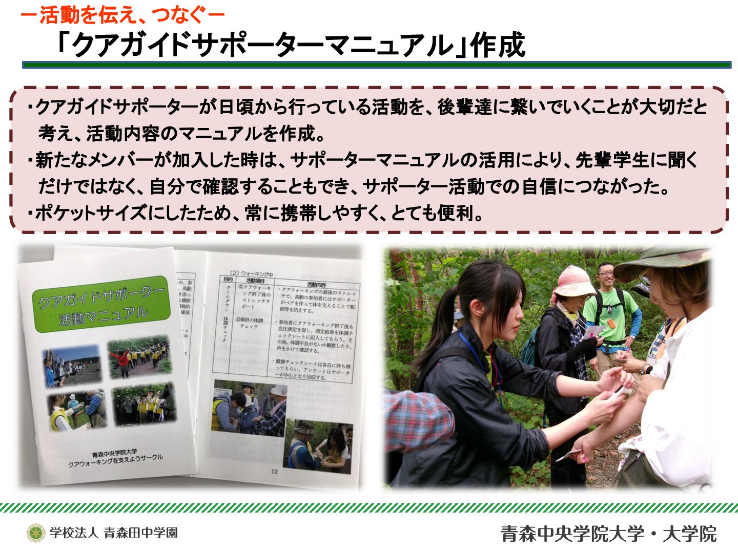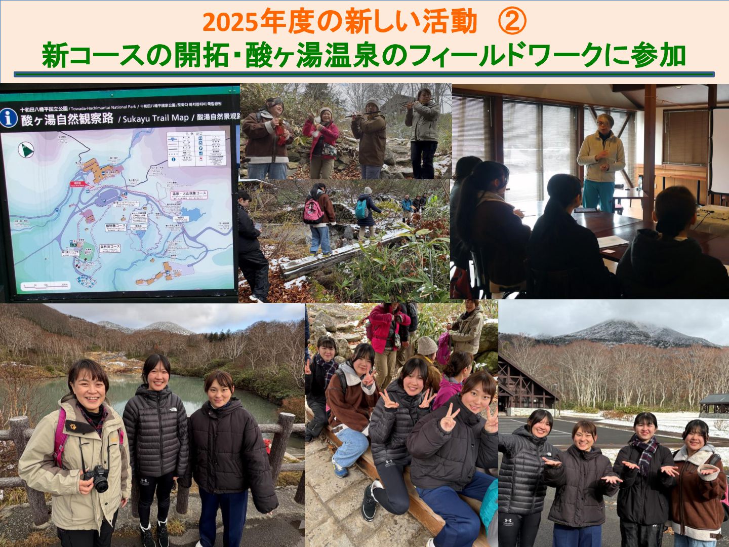 本サークルは、青森市浅虫温泉地域で実施されている「ドイツ式健康ウォーキング(クアウォーキング)」を、安心・安全に行うためのサポート活動を行っている。今年度は青森市主催のQOL健診とウォーキングのコラボ企画を支援したり、酸ヶ湯における新コース開拓のためのフィールドワークに参加するなど、支援活動の幅を広げることができた。それらを中心に、2025年度の活動と学びについて報告する。