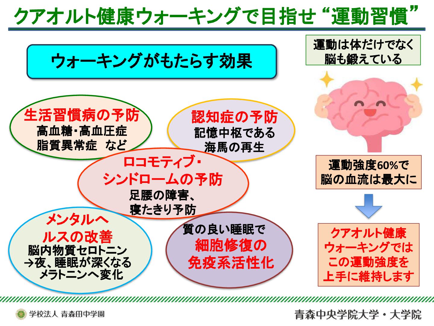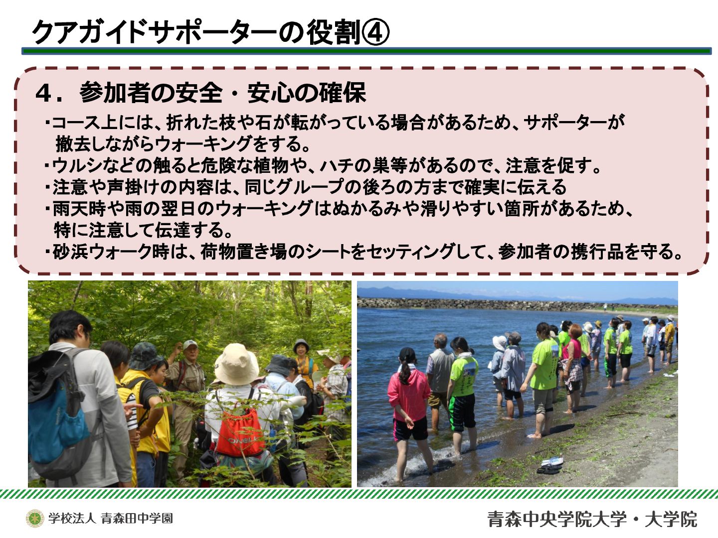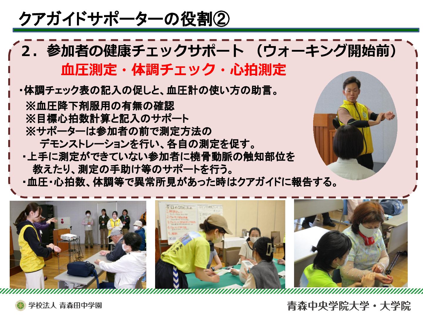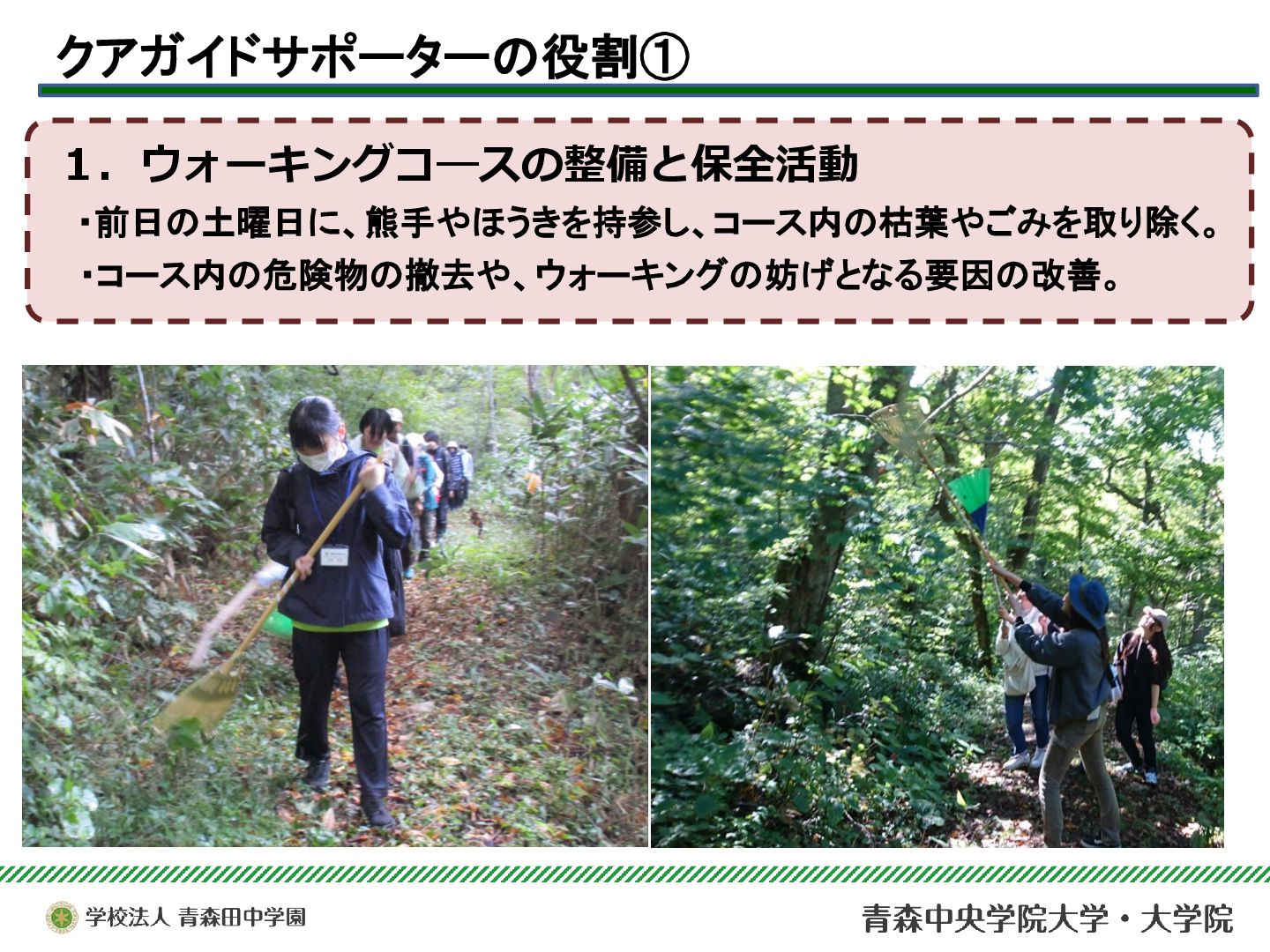 本サークルは、青森市浅虫温泉地域で実施されている「ドイツ式健康ウォーキング(クアウォーキング)」を、安心・安全に行うためのサポート活動を行っている。今年度は青森市主催のQOL健診とウォーキングのコラボ企画を支援したり、酸ヶ湯における新コース開拓のためのフィールドワークに参加するなど、支援活動の幅を広げることができた。それらを中心に、2025年度の活動と学びについて報告する。