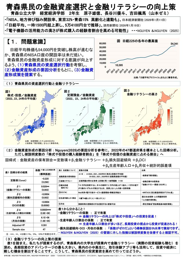 青森県民の預貯金額に注目すると、全国的に見て、その水準が低いだけでなく、金融資産全体に占めるシェアの高さが目立つ。これは県民の資産選択行動の結果であり、実質利子率が低い中でも、証券市場の収益性が高まっている状況において、必ずしも望ましい選択とは言えない。そこで、青森県民の資産選択を定量的な視点から可視化しつつ、金融リテラシーとの関連を分析し、より望ましい資産選択行動に近づけるための方策を考察する。