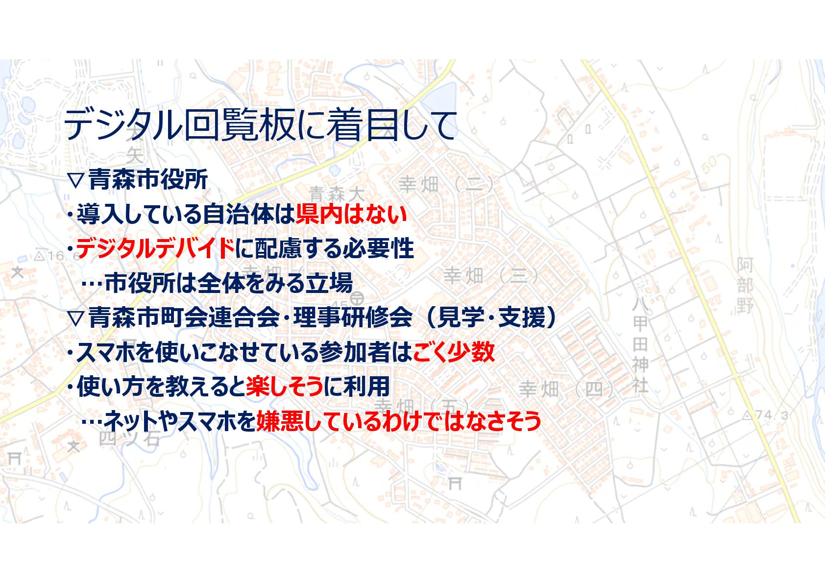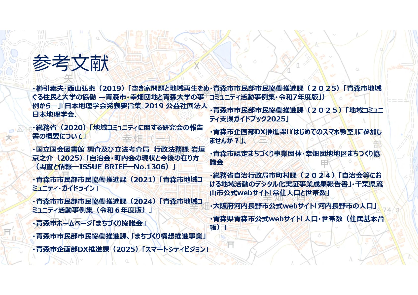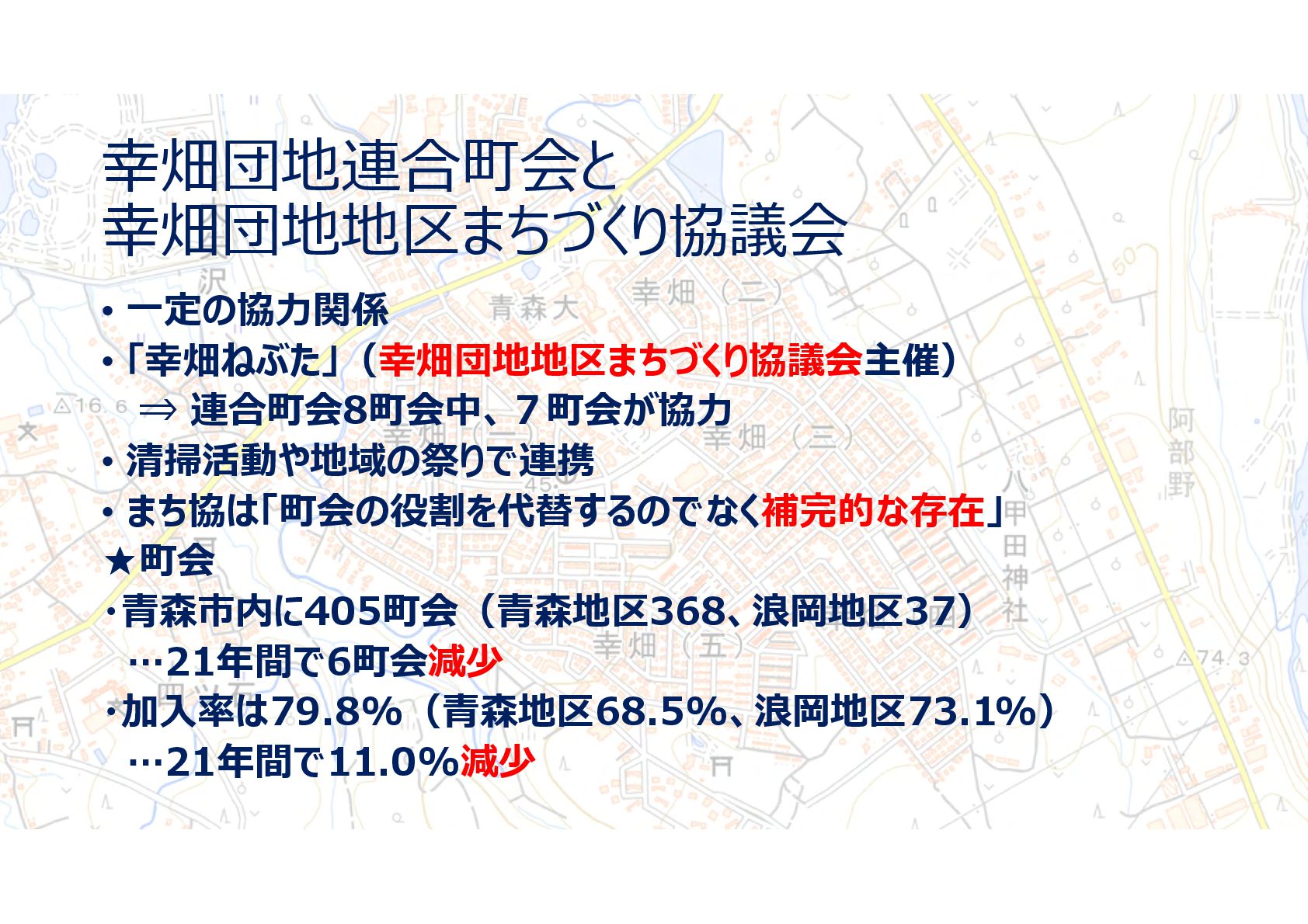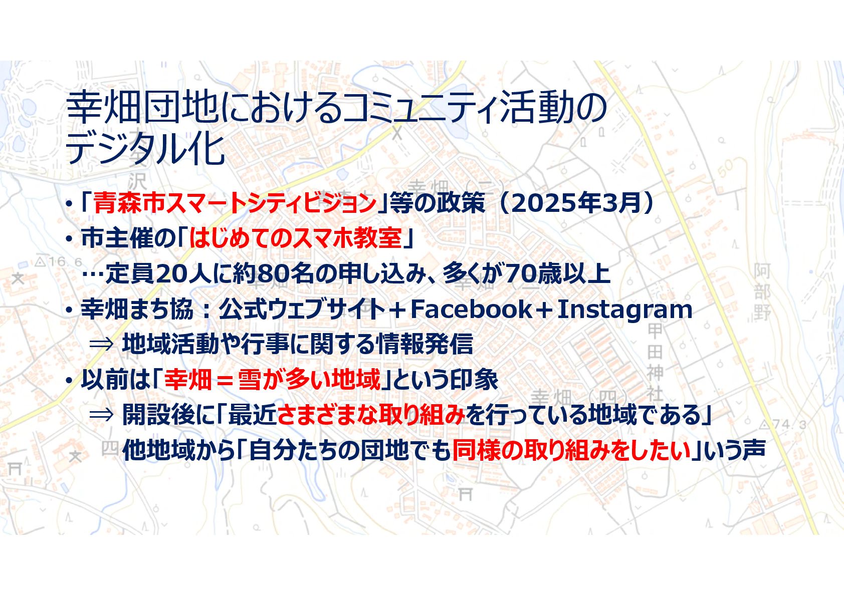 町会加入率の低下や役員高齢化が全国的な課題になっている。その打開策の一つが、活動のデジタル化である。本研究においては、青森市・幸畑団地地区まちづくり協議会が展開してきた実践や、青森市町会連合会の研修会と模索に関するヒアリングと参画、さらに青森市DX推進課などへのヒアリングを通じて、町会活動のデジタル化の可能性と課題、大学や学生が果たし得る役割について整理し、考察する。