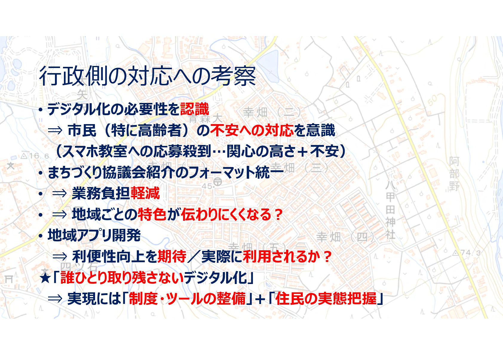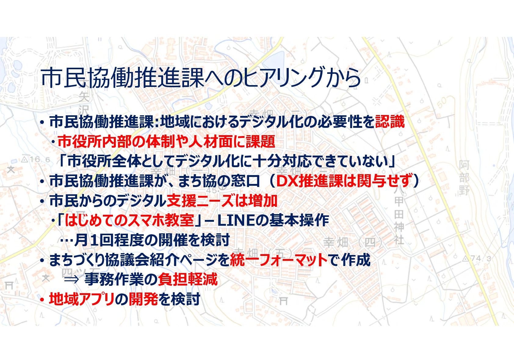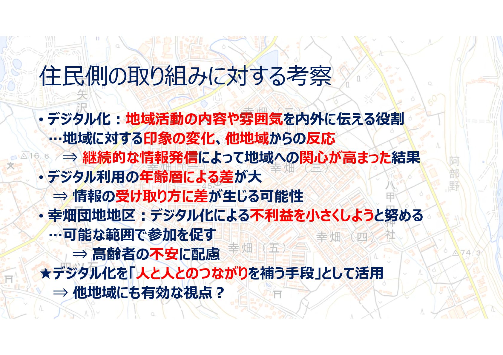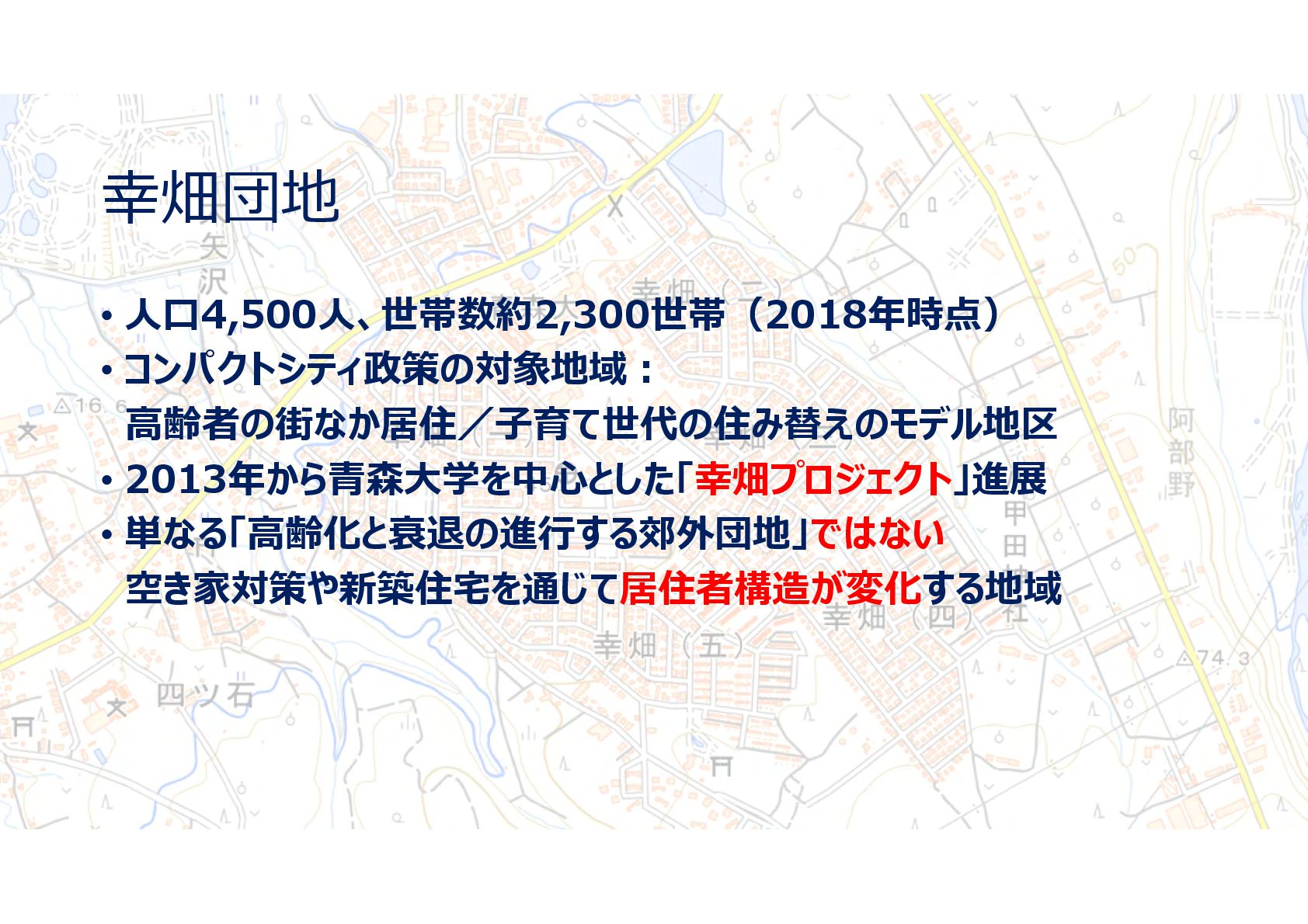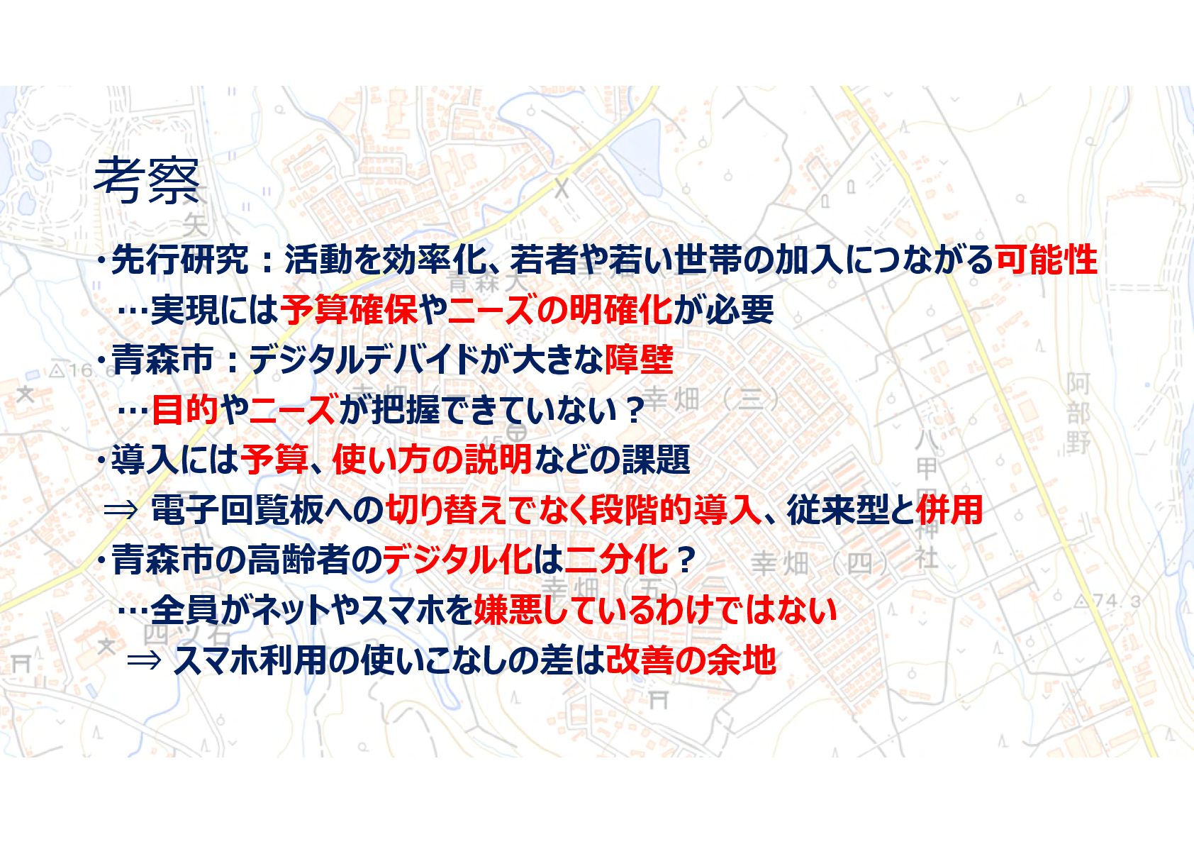 町会加入率の低下や役員高齢化が全国的な課題になっている。その打開策の一つが、活動のデジタル化である。本研究においては、青森市・幸畑団地地区まちづくり協議会が展開してきた実践や、青森市町会連合会の研修会と模索に関するヒアリングと参画、さらに青森市DX推進課などへのヒアリングを通じて、町会活動のデジタル化の可能性と課題、大学や学生が果たし得る役割について整理し、考察する。