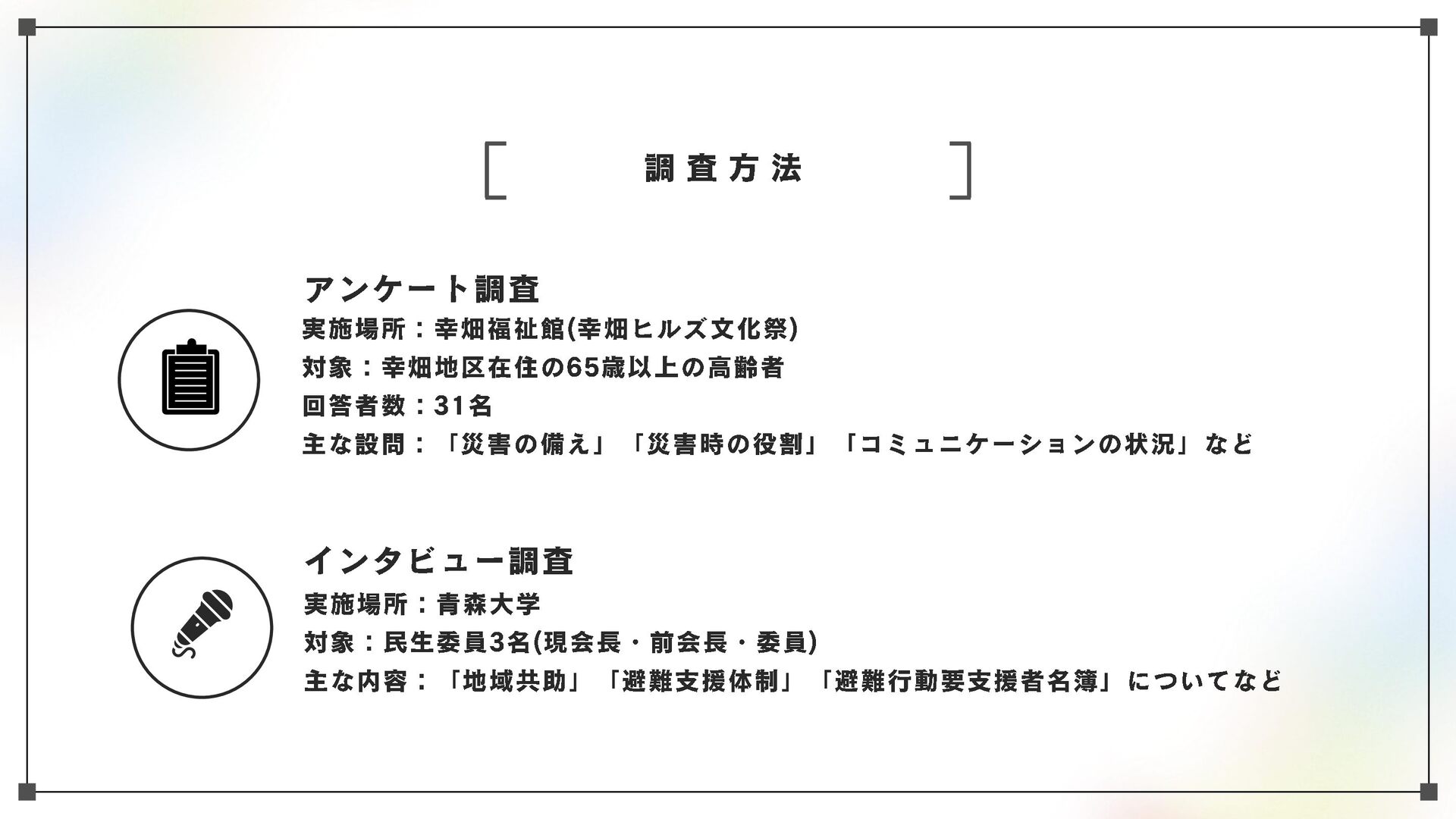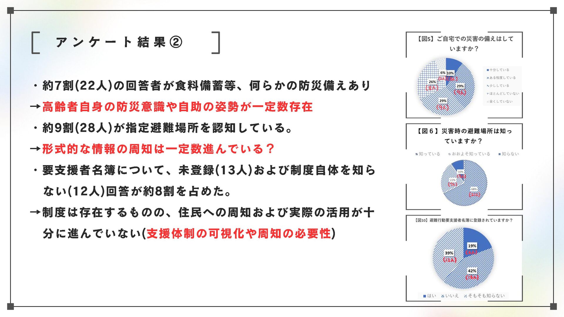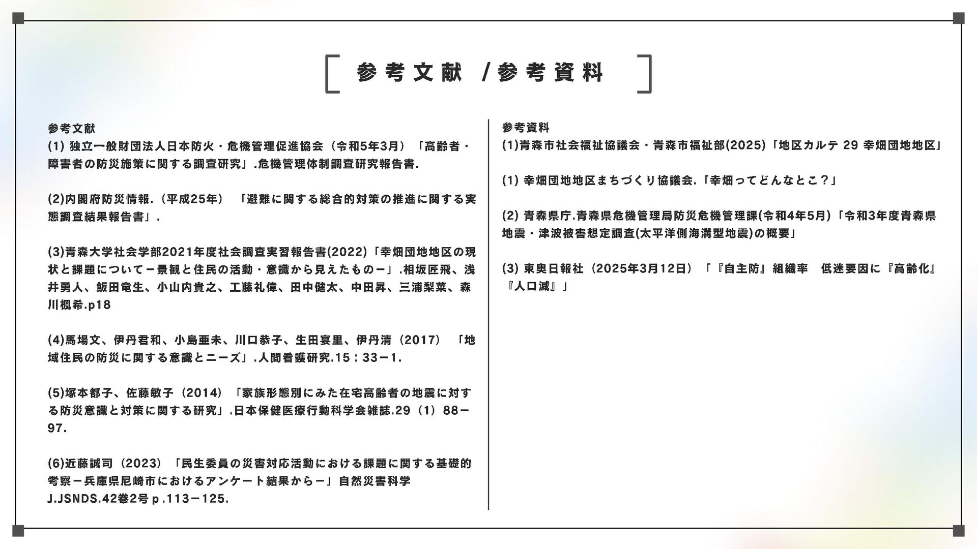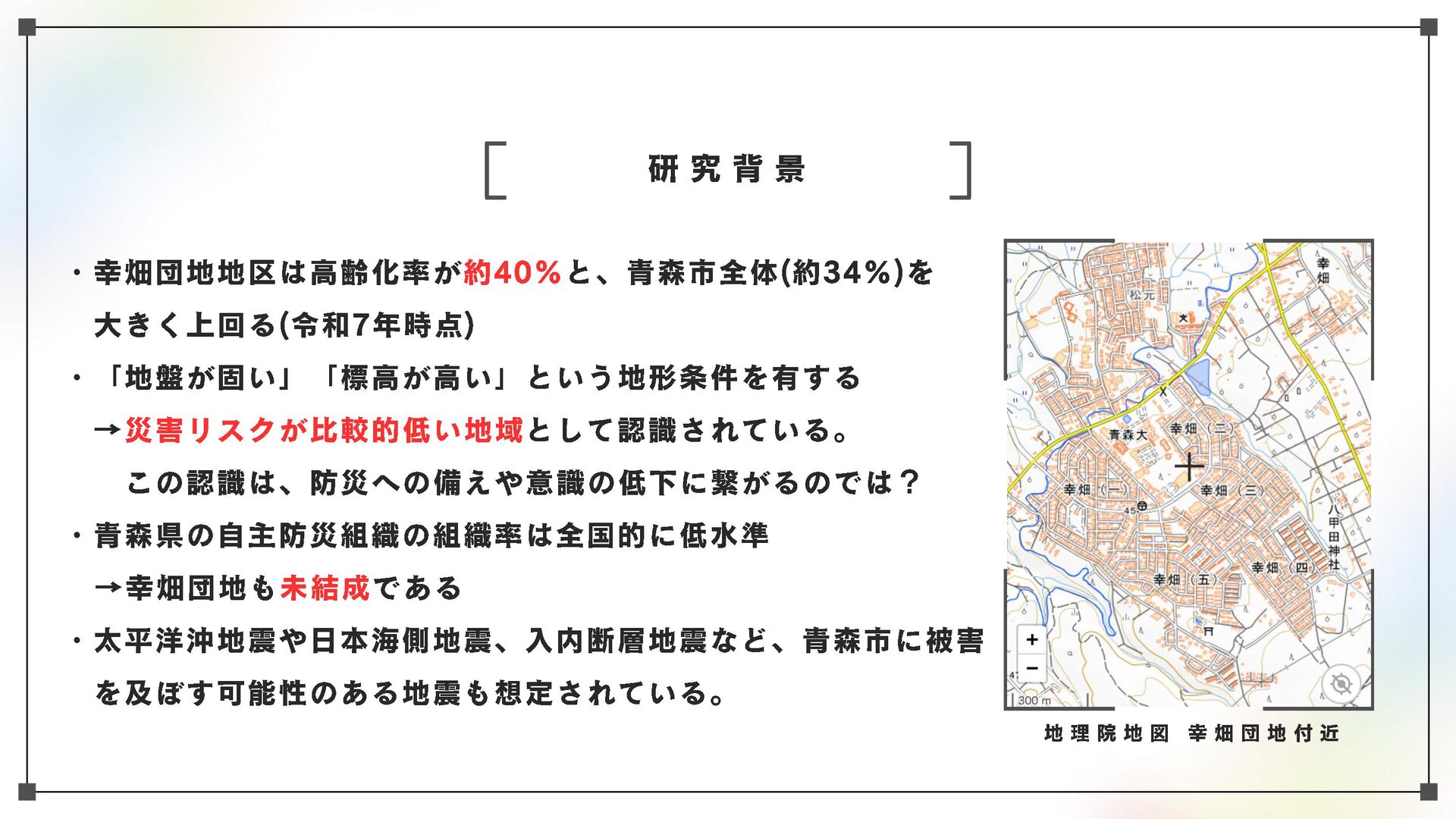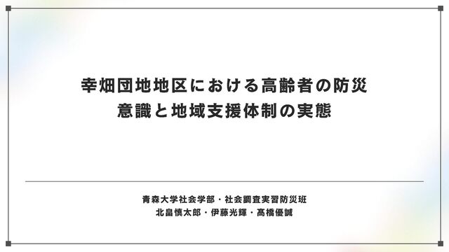 高齢化と人口減少が進む地域社会において、高齢者を災害からどう守るかが最大の課題の一つとなっている。本研究においては、青森市・幸畑団地地区を対象に、幸畑団地地区まちづくり協議会や民生委員を対象としたヒアリング、住民らへのアンケートを通じて、住民ベースの取り組みの現状を把握、記述するとともに、課題と可能性を明らかにする。