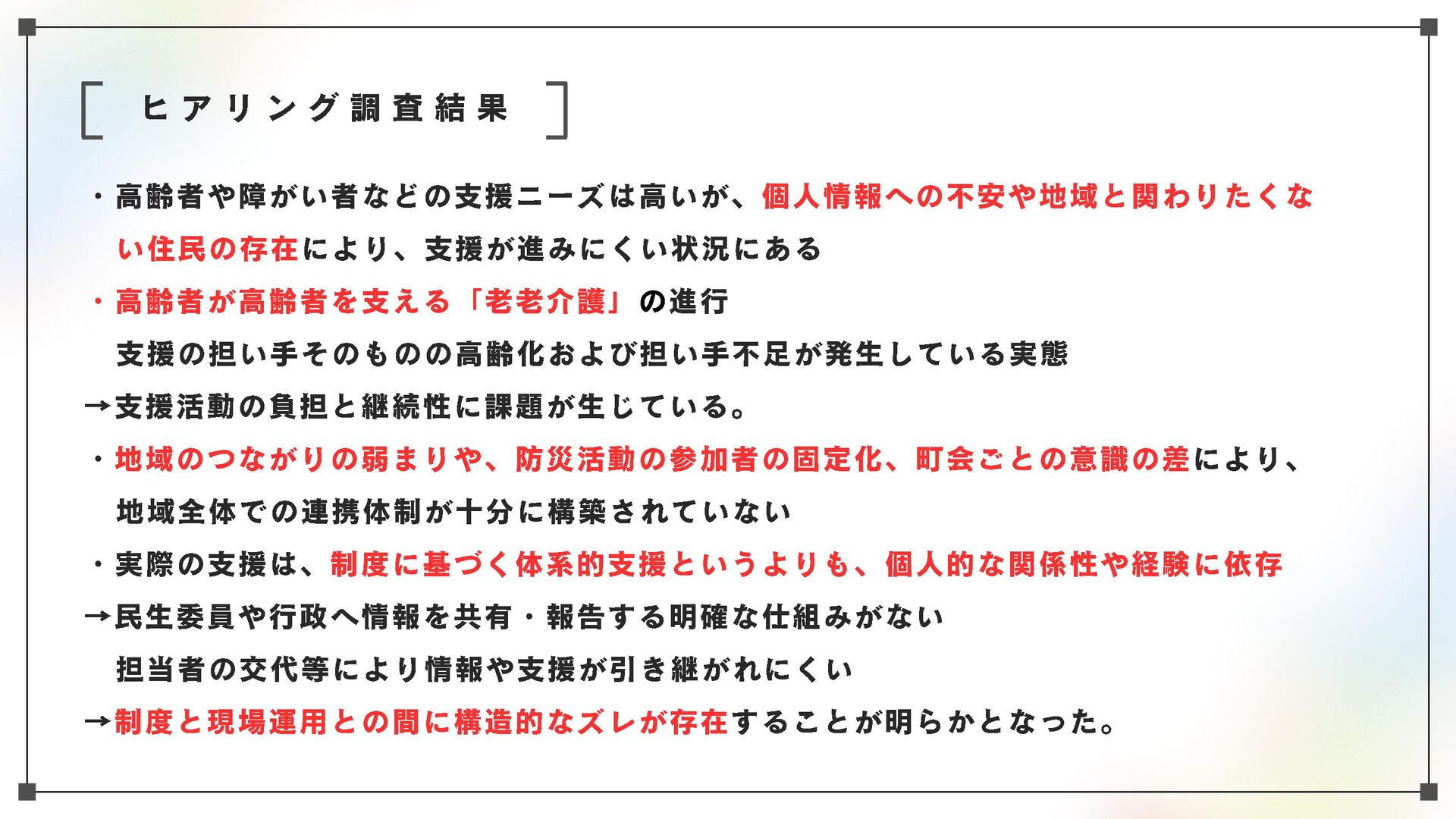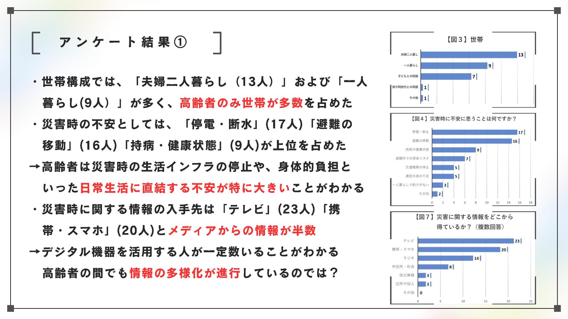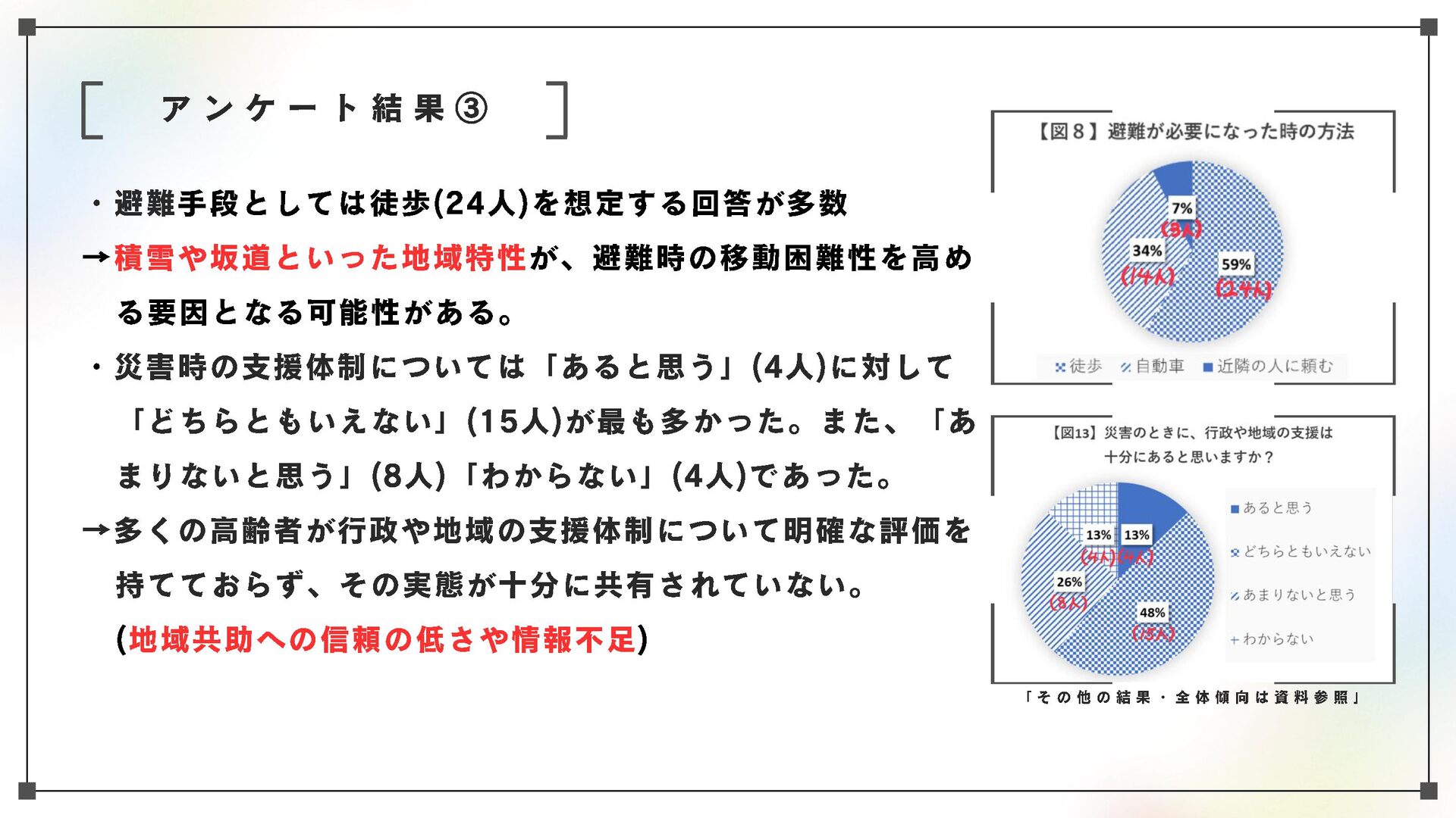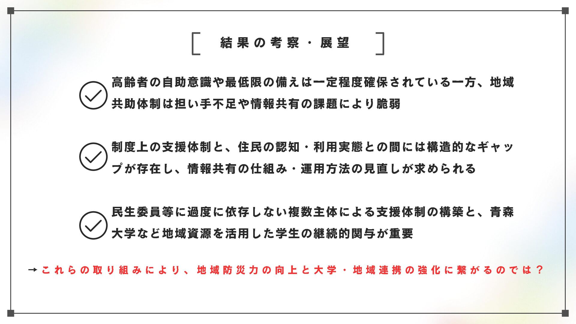 高齢化と人口減少が進む地域社会において、高齢者を災害からどう守るかが最大の課題の一つとなっている。本研究においては、青森市・幸畑団地地区を対象に、幸畑団地地区まちづくり協議会や民生委員を対象としたヒアリング、住民らへのアンケートを通じて、住民ベースの取り組みの現状を把握、記述するとともに、課題と可能性を明らかにする。