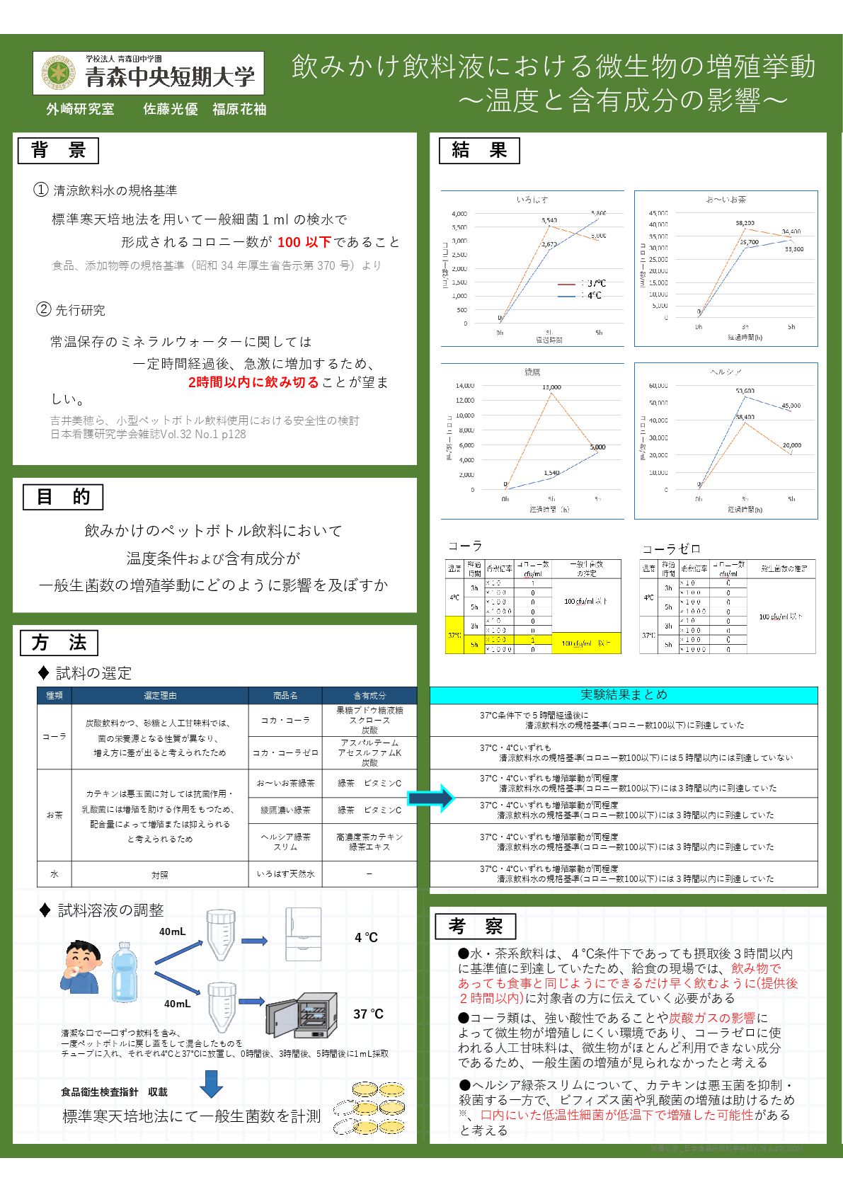 ペットボトル飲料に口をつけたさいに、なるべく早く飲み切るように注意喚起がなされている。本研究では、炭酸、人工甘味料、茶カテキンなど微生物増殖に影響を与えるであろう成分に着目した。温度条件(4℃・37℃)とこれらの含有成分が、飲みかけの飲料液において、一般生菌の増殖挙動にどのように影響するのか微生物実験を通して考察した。