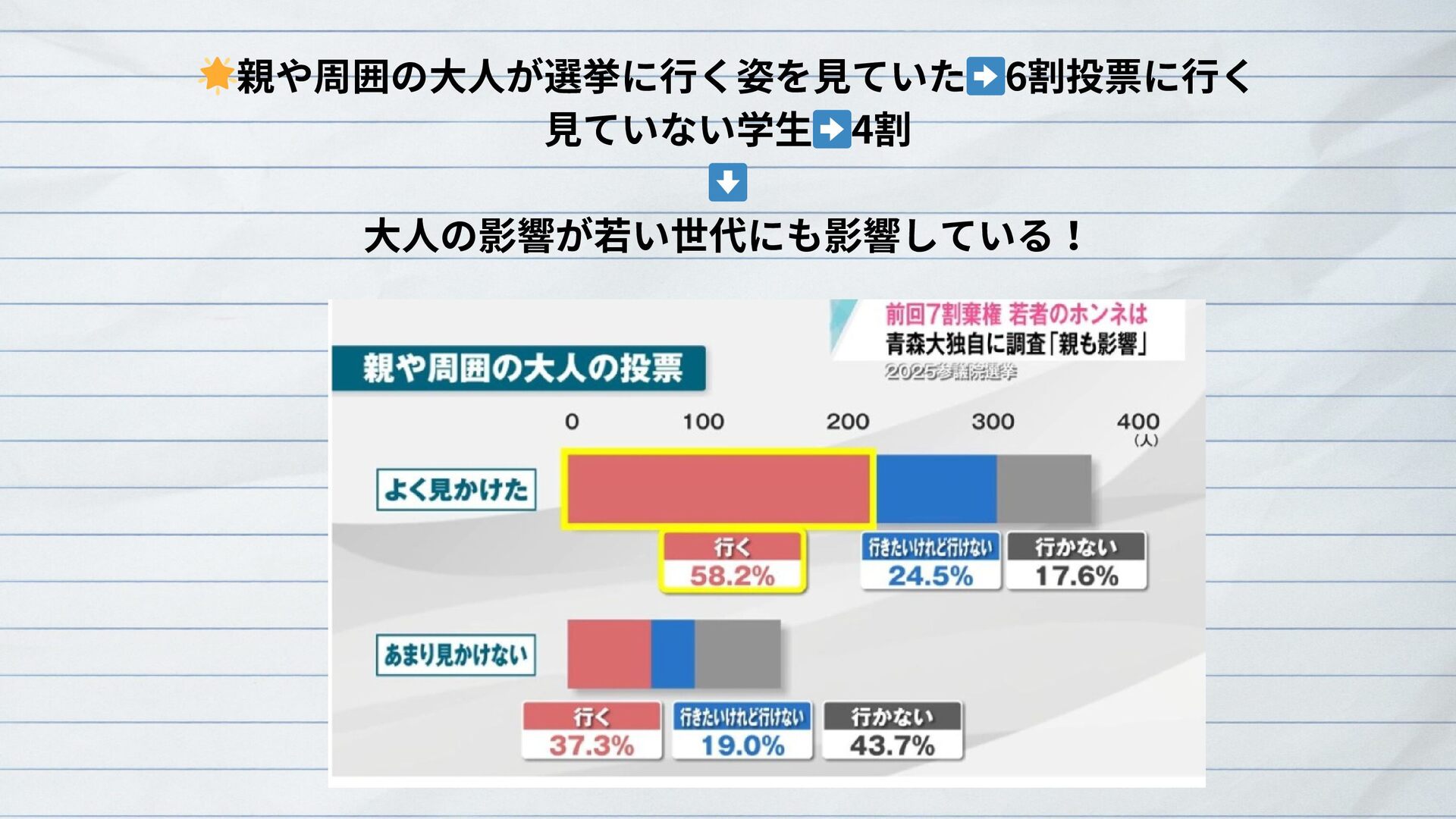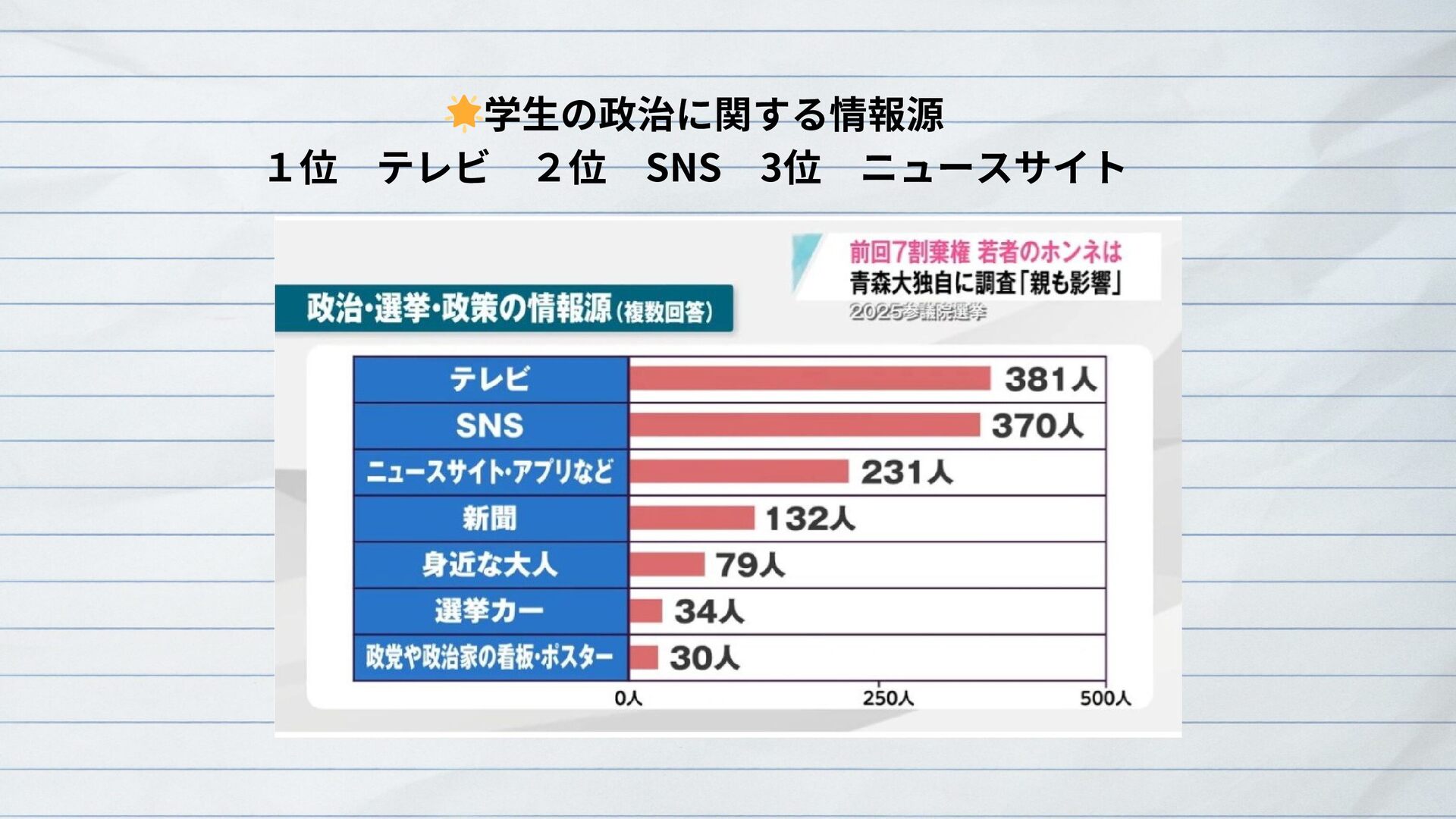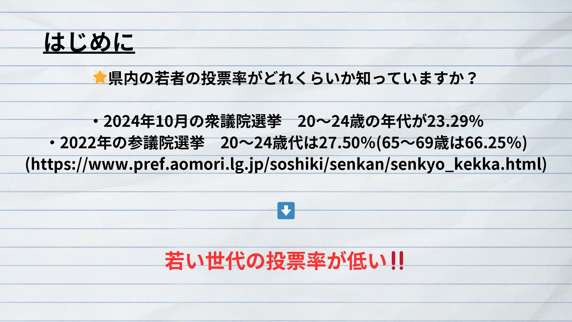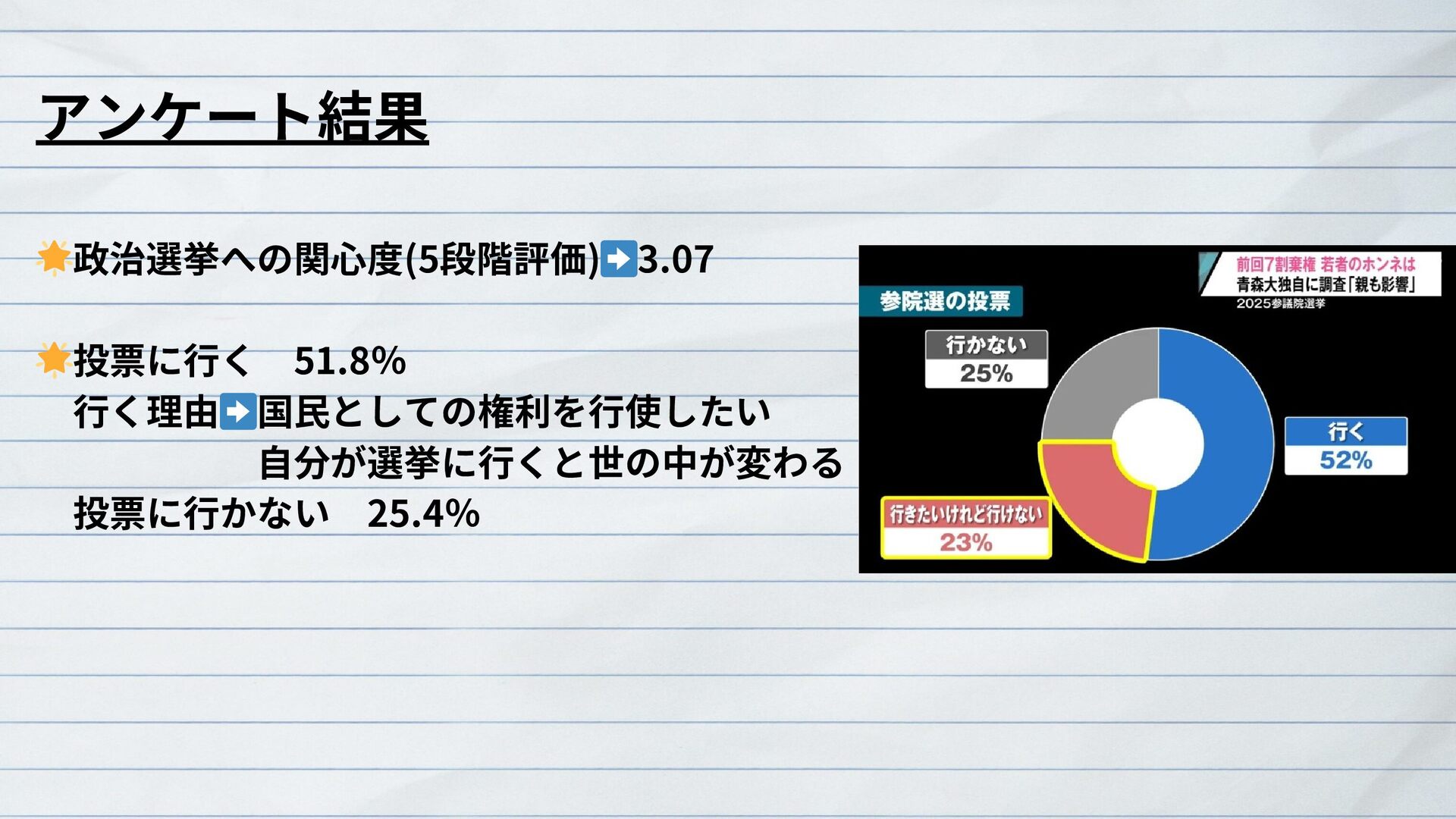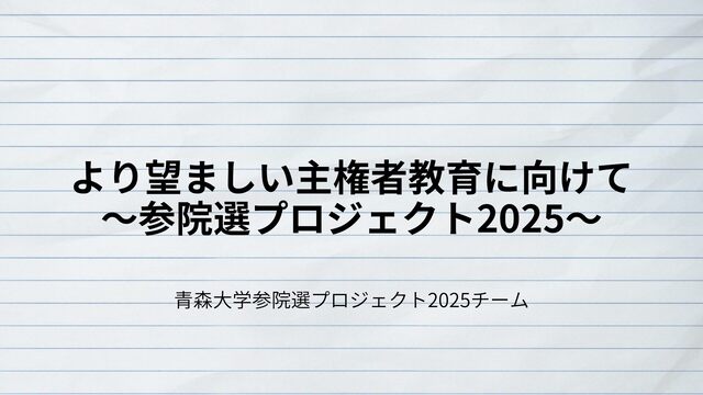青森大学の有志学生は2025年7月参院選に際し、学生の意識をアンケートで明らかにしつつ、より適切な主権者教育のあり方や、特に若者の投票率向上を目指す参院選プロジェクト2025を実施した。さらに、主に授業や取材を通じて、青森県選挙管理委員会や新聞・テレビの報道担当者と意見交換を重ねた。これらの成果は論文(研究ノート)にもまとめた。その概要を紹介する。